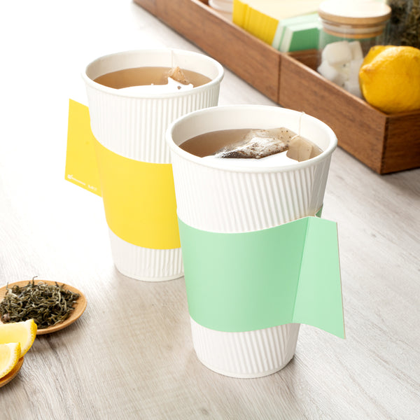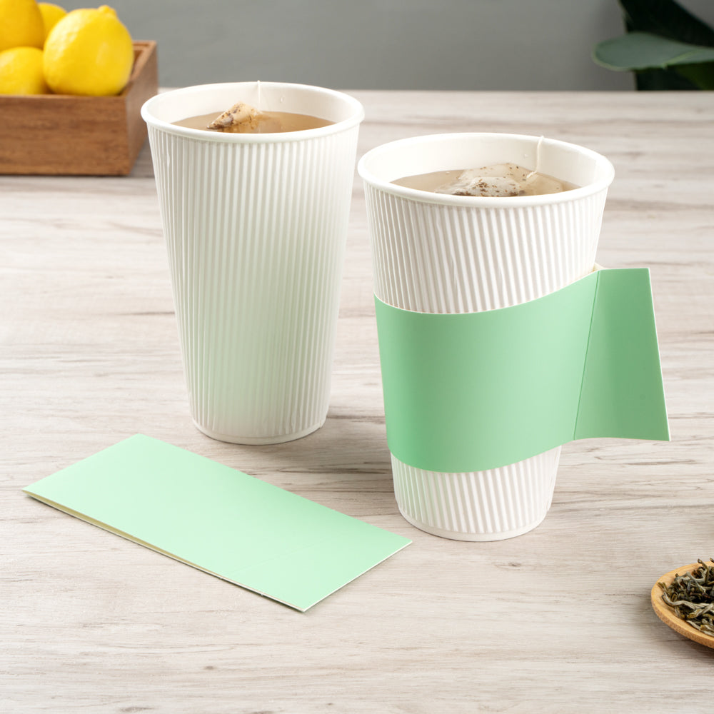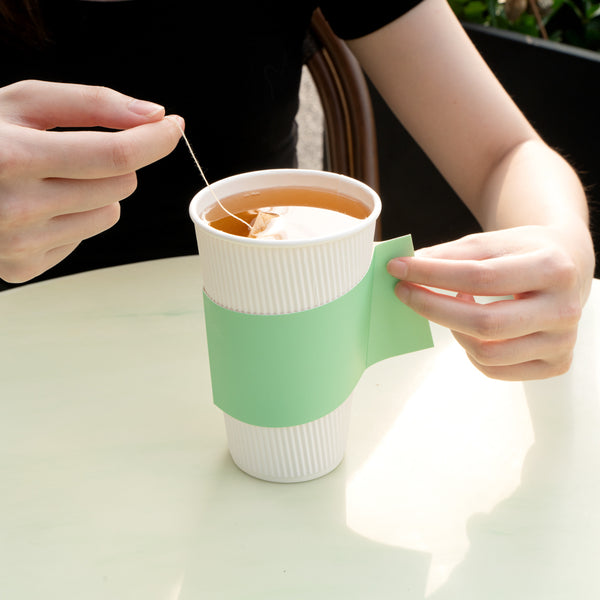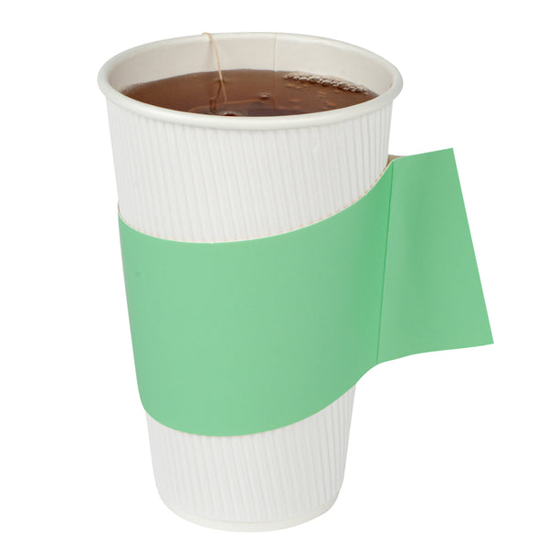 Ensure a secure grip with the Restpresso Coffee Cup Holder. The Restpresso Integrated Handle Paper Coffee Cup Holder, Green, 11.25 inches by 2.5 inches by 2.5 inches provides a stable grip, reducing spill risks and enhancing customer comfort, making it a reliable coffee cup holder for any establishment. Its mint green hue elevates the presentation of beverages, boosting brand visibility and adding a distinctive touch to your offerings. Designed to fit 10 to 20-ounce cups, this disposable cup sleeve streamlines inventory management by ensuring compatibility with popular cup sizes. Made from durable paper, it offers effective insulation to protect hands from hot beverages. Each order includes 1000 Restpresso Integrated Handle Paper Coffee Cup Holders.
