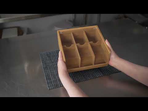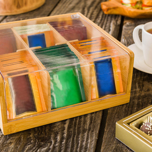 Bring style and organization to your tea assortment using our Restpresso Natural Bamboo Organizers. Made from organic bamboo, this eco-friendly tea organizer is constructed to be durable yet lightweight and is ideal for coffee shops, break rooms, or hotel buffets. This tea organizer features a hinged plastic cover for convenience and crystal clear visibility of condiments. Great for simplifying storage, this wooden tea box has 6 compartments to easily separate and organize teas and condiments. Our tea bag organizers are multipurpose and can act as a self-service station for customers or as a unique way to display your foodservice establishment's tea collection. Measuring 8.5 inches tall by 8 inches wide, these tea bag organizers are sold in a 1 count box.