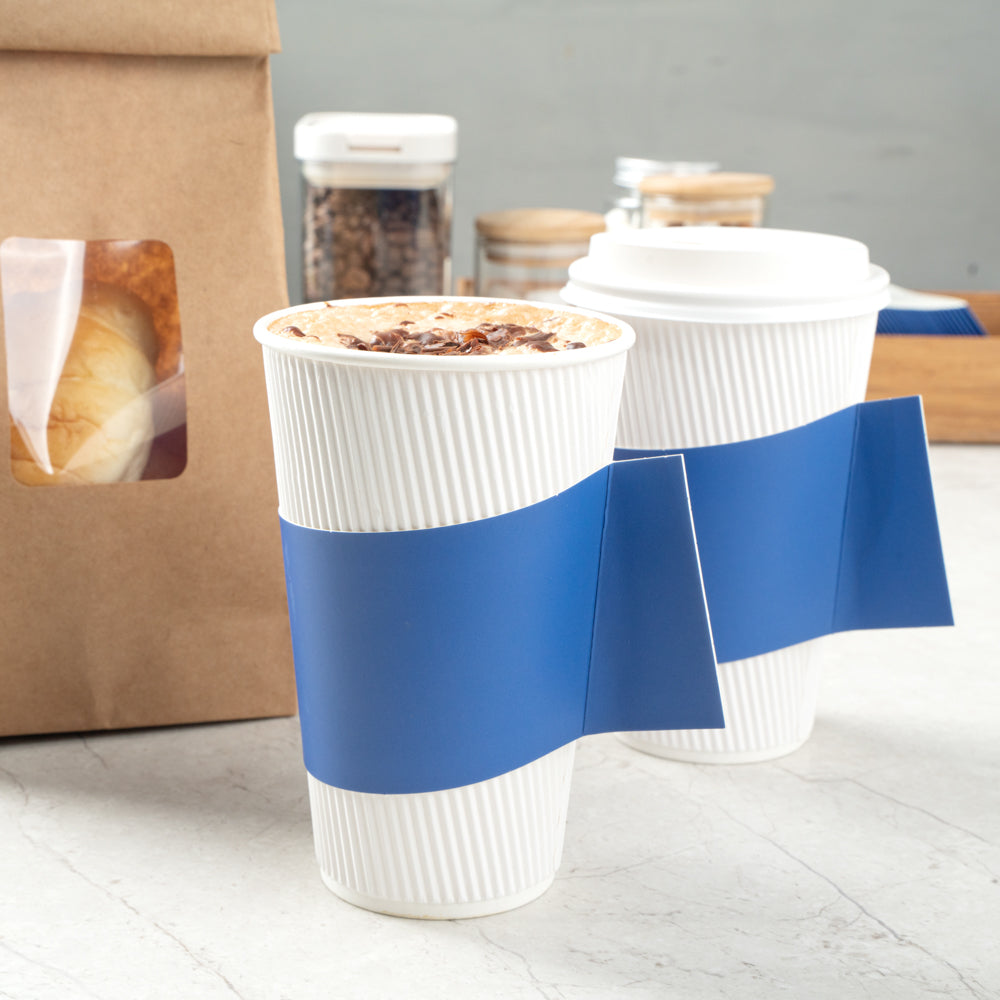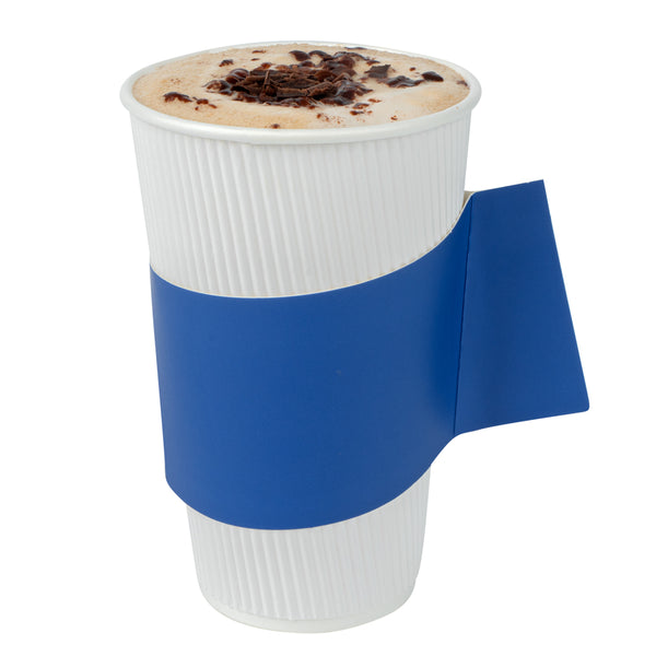 Enhance beverage service with a secure, stylish grip. The Restpresso Secure Grip Coffee Cup Sleeve, Blue Paper, 11.25 inches by 2.5 inches by 2.5 inches – offers an integrated handle design that ensures a firm hold, minimizing spills and enhancing customer comfort, making it an ideal coffee cup sleeve for bustling cafes. This disposable cup sleeve is crafted from insulating paper material, effectively protecting hands from hot beverages and creating a safe drinking experience. Its universal compatibility fits 12, 16, and 20-ounce cups, streamlining operations for businesses serving various drink sizes. With a smooth exterior it allows baristas to easily write customer names, preventing mix-ups during peak hours. Elevate your service with this hot beverage sleeve, offering a blend of comfort and elegance. Each order includes 50 Restpresso Secure Grip Coffee Cup Sleeves.