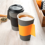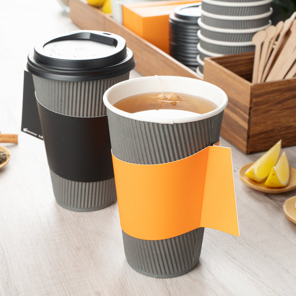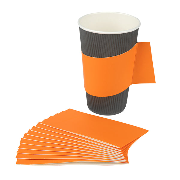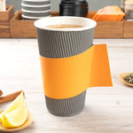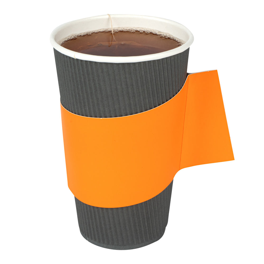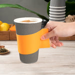 Ensure customer comfort with the Restpresso Orange Paper Coffee Cup Holder, featuring an integrated handle design that provides a secure grip, reducing spills and enhancing customer satisfaction. Made from insulating paper, this disposable coffee sleeve shields hands from hot beverages, ensuring a safe and enjoyable drinking experience. Its vibrant orange color not only adds a lively touch to your coffee service but also improves brand visibility. Designed to fit 12 to 20-ounce cups, this hot beverage sleeve offers versatile use across various drink sizes, making it ideal for coffee shops and catering events alike. Perfect for busy beverage operations, this paper coffee cup holder is a reliable choice. Each order includes 50 Restpresso Orange Paper Coffee Cup Holders, 11.25 inches by 2.5 inches by 2.5 inches.