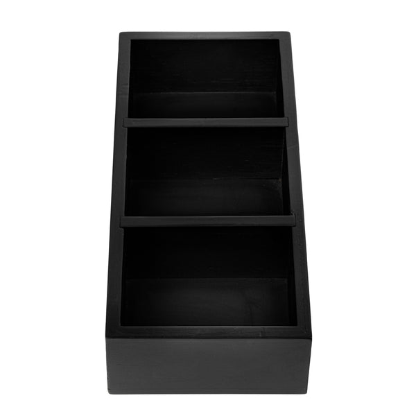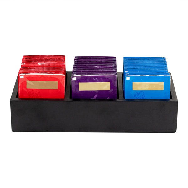 Elegantly organize your condiments with our Restpresso Rectangle Black Bamboo Packet Organizer. This chic sugar packet contains 3 compartments to easily arrange an assortment of condiment packets and provides easy access to customers. The slim design of this eco-friendly tea packet organizer provides space-saving storage and allows employees to quickly refill the caddy with sugar packets, tea packets, sweeteners, and more. With a sleek black finish, this bamboo packet holder effortlessly matches the modern decor of your coffee shop, diner, or breakfast buffet. The overall measurement of this rectangular sugar packet caddy is 9.5 inches long by 4.25 inches wide. Each packet organizer compartment measures 3.6 inches long by 2.6 inches wide, which allows you to store an ample amount of supplies. Sold in a 1 count box.