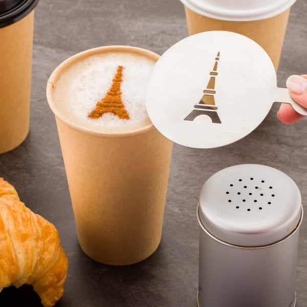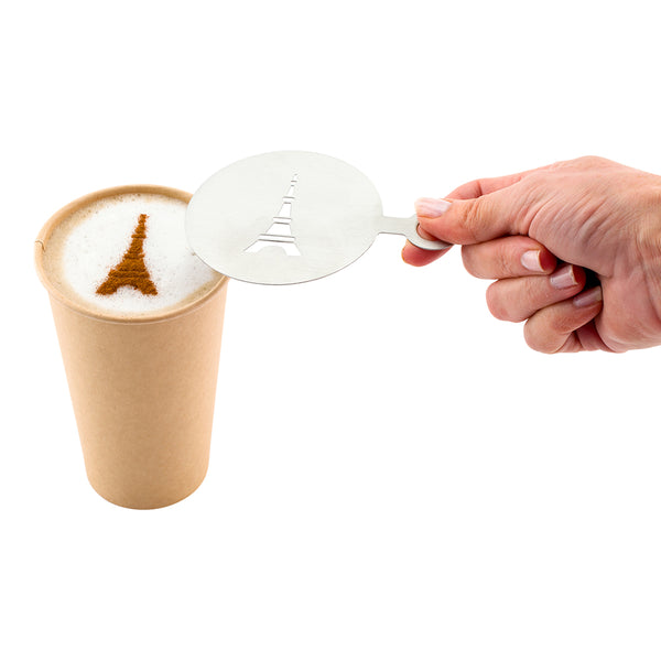 Elevate your coffee presentations effortlessly. The Restpresso Stainless Steel Eiffel Tower Coffee Decorating Stencil, with its stainless steel construction, guarantees durability and longevity, making it perfect for repeated use in fast-paced coffee shops. Its elegant Eiffel Tower design adds a unique touch, transforming ordinary drinks into extraordinary experiences with this coffee stencil. Designed to fit standard coffee cups at 4.75 inches by 3.3 inches, it ensures consistent and precise designs, making it an indispensable latte art stencil. The built-in handle provides stability, ensuring clean and consistent results every time, while its dishwasher-safe feature allows for efficient cleaning and turnaround, crucial for maintaining hygiene in bustling environments. Its compact size and low profile make it ideal for stacking in storage, effectively saving valuable space. Sold in a 1 count box.