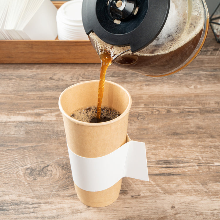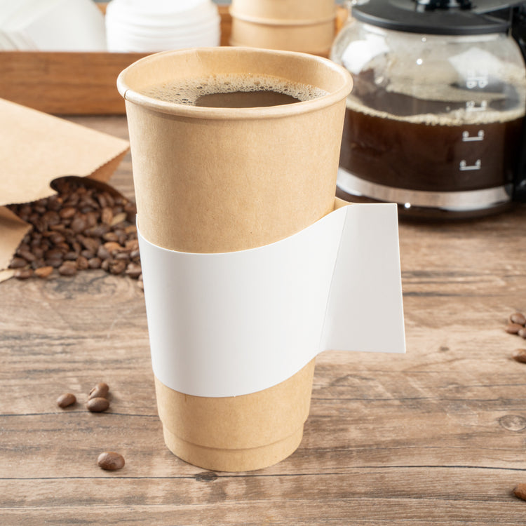Provide your customers with a secure grip on their hot beverages. The Restpresso Non-Slip Coffee Cup Sleeve features an integrated handle design that enhances coffee drinkers' comfort and reduces spill risks, making it an essential coffee cup sleeve for bustling cafes. Constructed from durable paper, this sleeve fits 12, 16, and 20-ounce cups, offering versatility across multiple sizes to streamline inventory management. Its corrugated interior ensures a non-slip grip, while the premium white paper protects hands from hot drinks, positioning it as a reliable paper cup carrier. Enhance your beverage service while promoting responsibility. Each order includes 50 Restpresso Non-Slip Coffee Cup Sleeves with Handle, 11.25 inches by 2.5 inches by 2.5 inches.