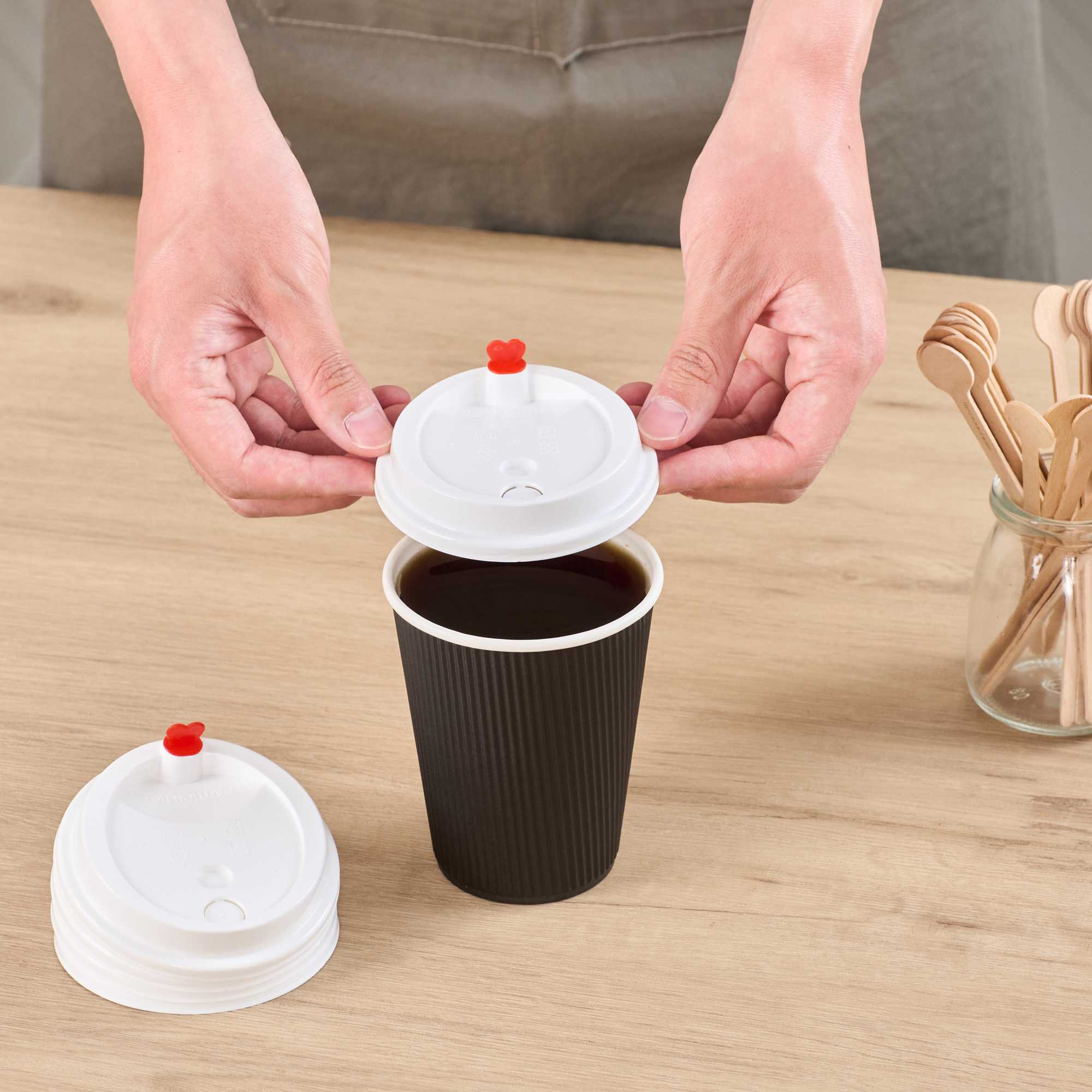 Premium plastic lids snugly fit on coffee cups without splitting and won’t break while in use. No more coffee stains or spills on your clothes!