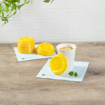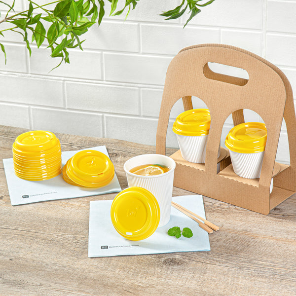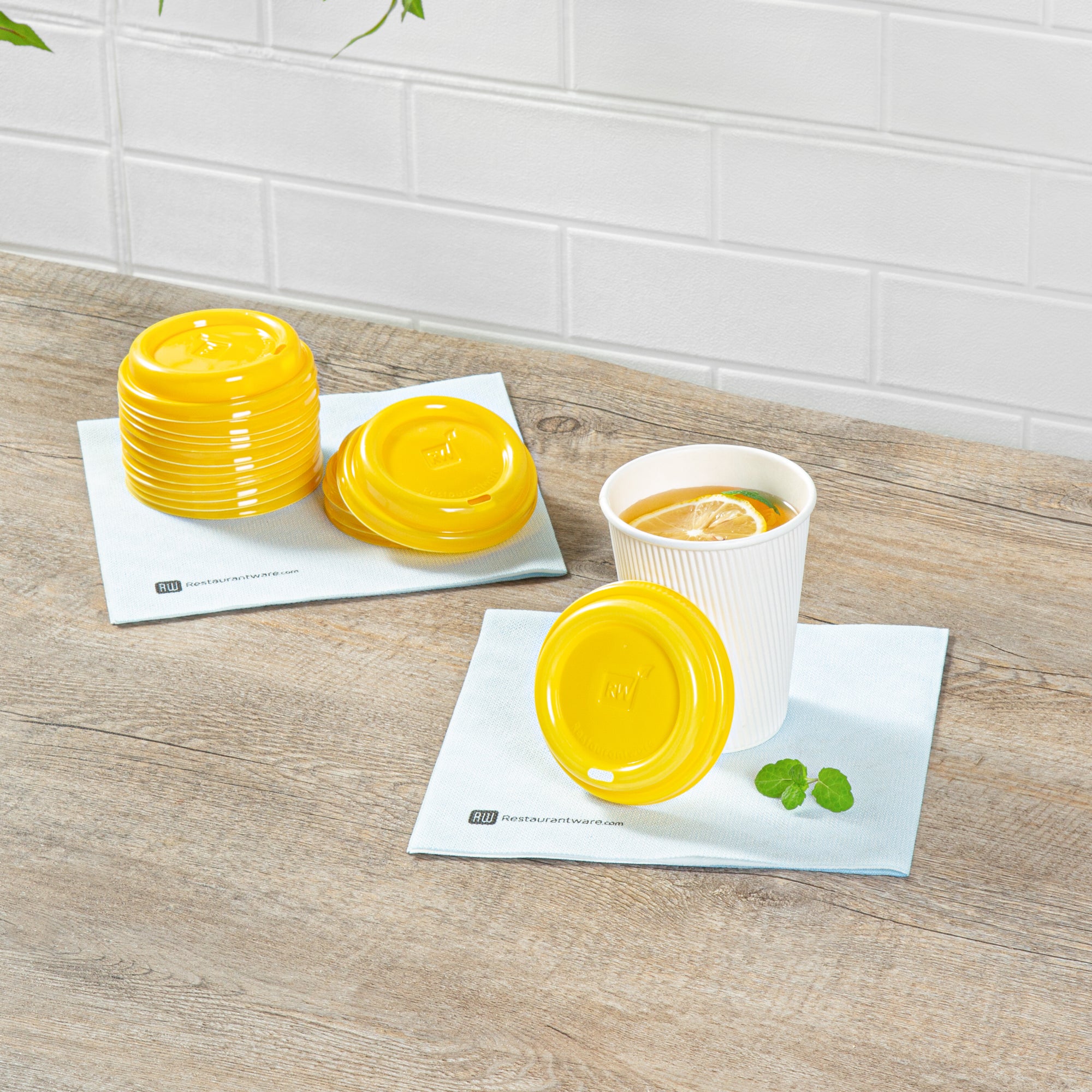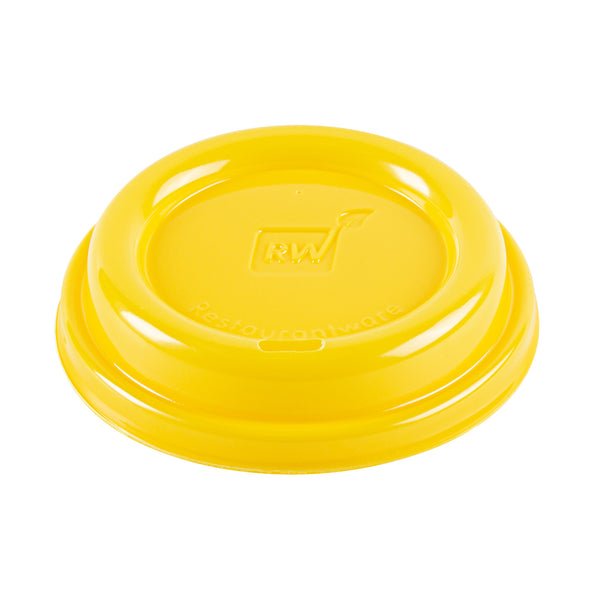 Securely enjoy beverages with our Restpresso Yellow Plastic Coffee Cup Lids. These disposable coffee cup lids are designed to form a tight seal with our collection of compatible Restpresso 8-ounce, 12-ounce, 16-ounce, and 20-ounce paper coffee cups, preventing spills while taking coffee on-the-go. Equipped with a built-in ventilation hole, these plastic lids improve airflow, allowing guests to sip on their beverages smoothly. The elevated rim of these hot cup lids minimizes minor spills and provides customers with a comfortable drinking experience. With a vibrant yellow finish, these to go cup lids add a splash of color and enhance the look of coffee orders. These cup lids are disposable and can be discarded after drinking for an easy cleanup. Ideal for cafes and restaurants looking to reduce their carbon footprint, these yellow plastic lids are recyclable. Measuring 3.5 inches in diameter by 0.75 inches in height, these disposable lids fit snugly on your coffee cups. Sold in a 500 count box. Cups are available and sold separately.