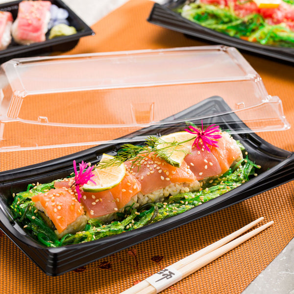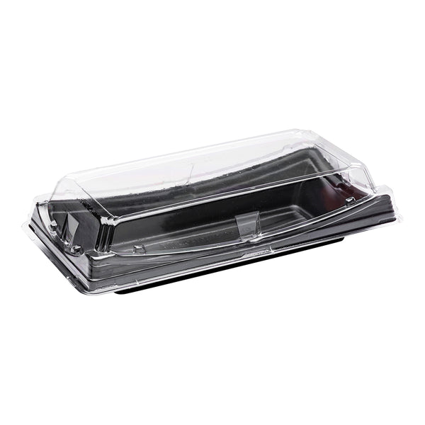 BLACK PLASTIC LONG TAKE OUT SUSHI CONTAINER - WITH CLEAR LID
