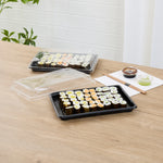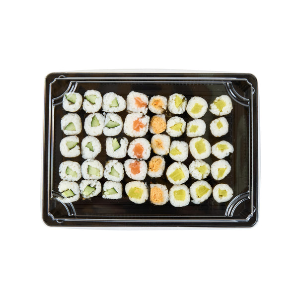 Ensure flawless sushi presentation with leak-resistant packaging. Roku Grease-Resistant Takeout Sushi Trays with Snap-On Lids offer a crack-resistant plastic construction that maintains durability during transport, keeping sushi intact and preventing spills. These takeout sushi trays feature snap-on lids that keep sushi fresh for longer storage, enhancing the appeal of sushi takeout containers by providing a secure seal. With anti-fog lids, these disposable sushi trays ensure excellent visibility in display cases, showcasing your culinary creations beautifully. Measuring 10 inches in length, 7.28 inches in width, they accommodate a variety of sushi rolls and combinations, making them ideal for catering events or restaurant use. Elevate your foodservice operations with these reliable sushi takeout containers. Each order includes 100 Roku Grease-Resistant Takeout Sushi Trays with Snap-On Lids.