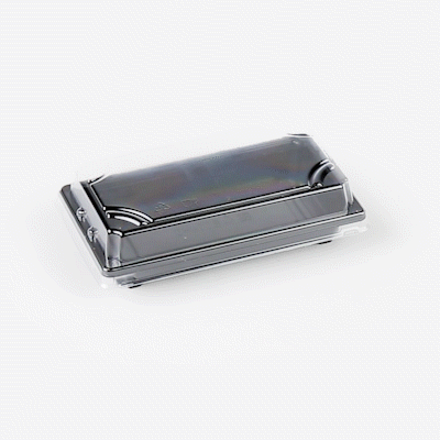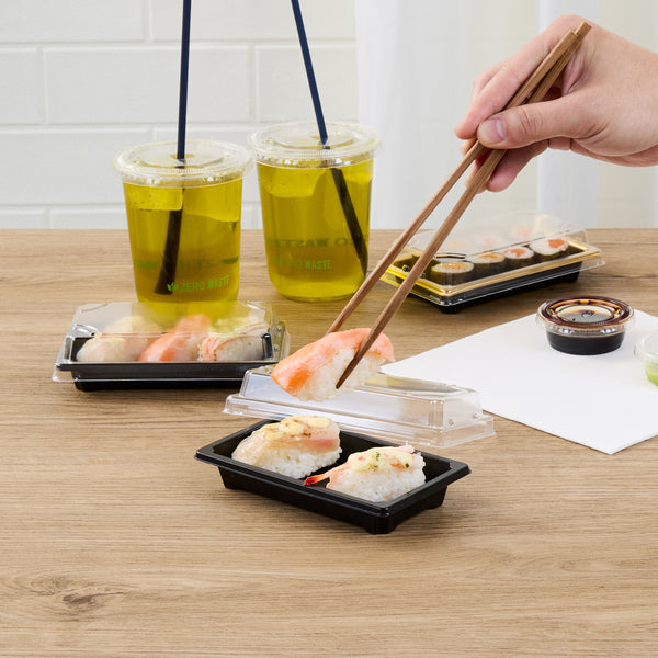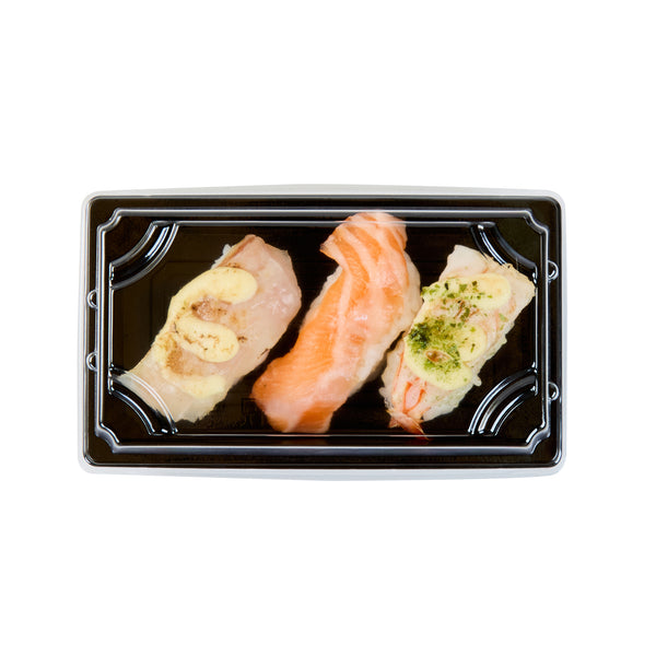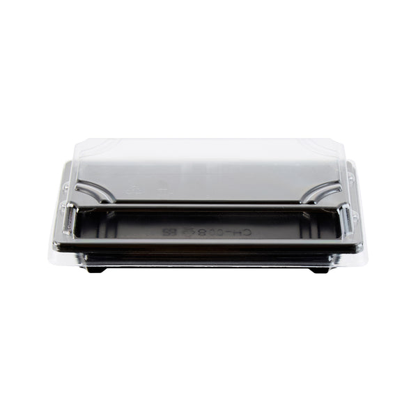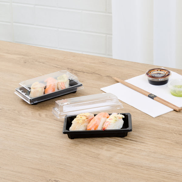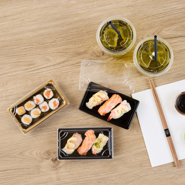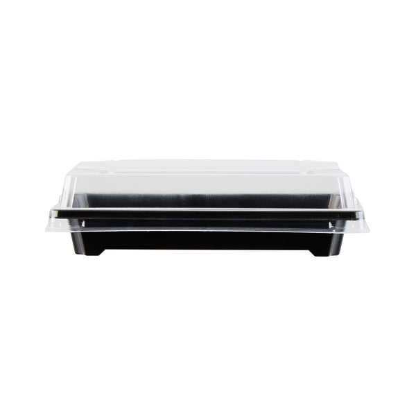 RECTANGLE BLACK PLASTIC TAKE OUT SUSHI TRAY - WITH CLEAR LID