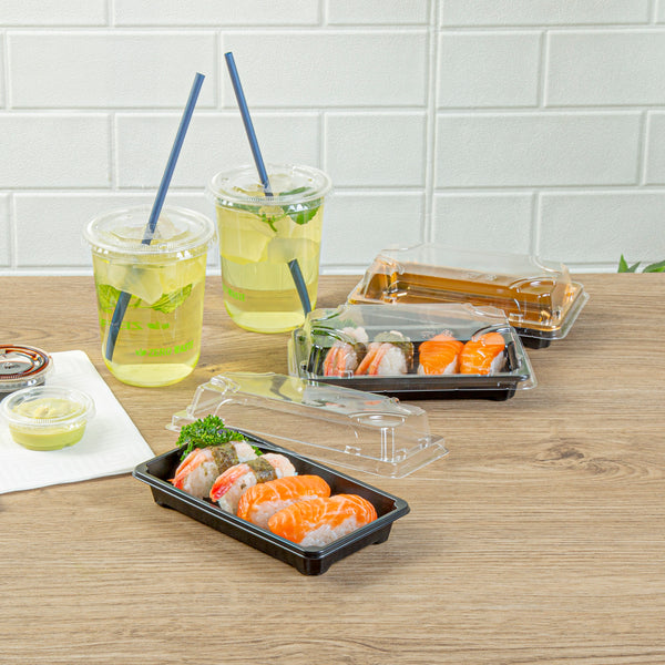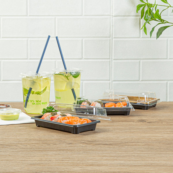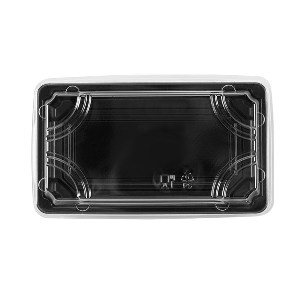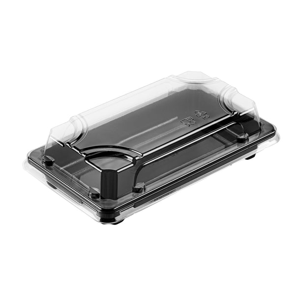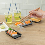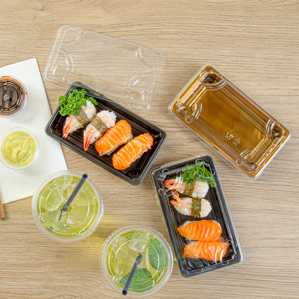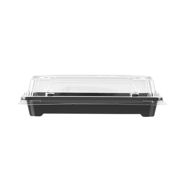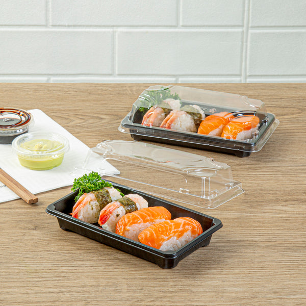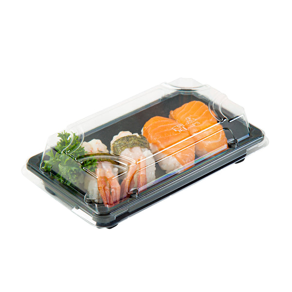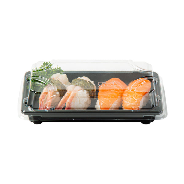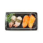 RECTANGLE BLACK PLASTIC TAKE OUT SUSHI TRAY - WITH CLEAR LID