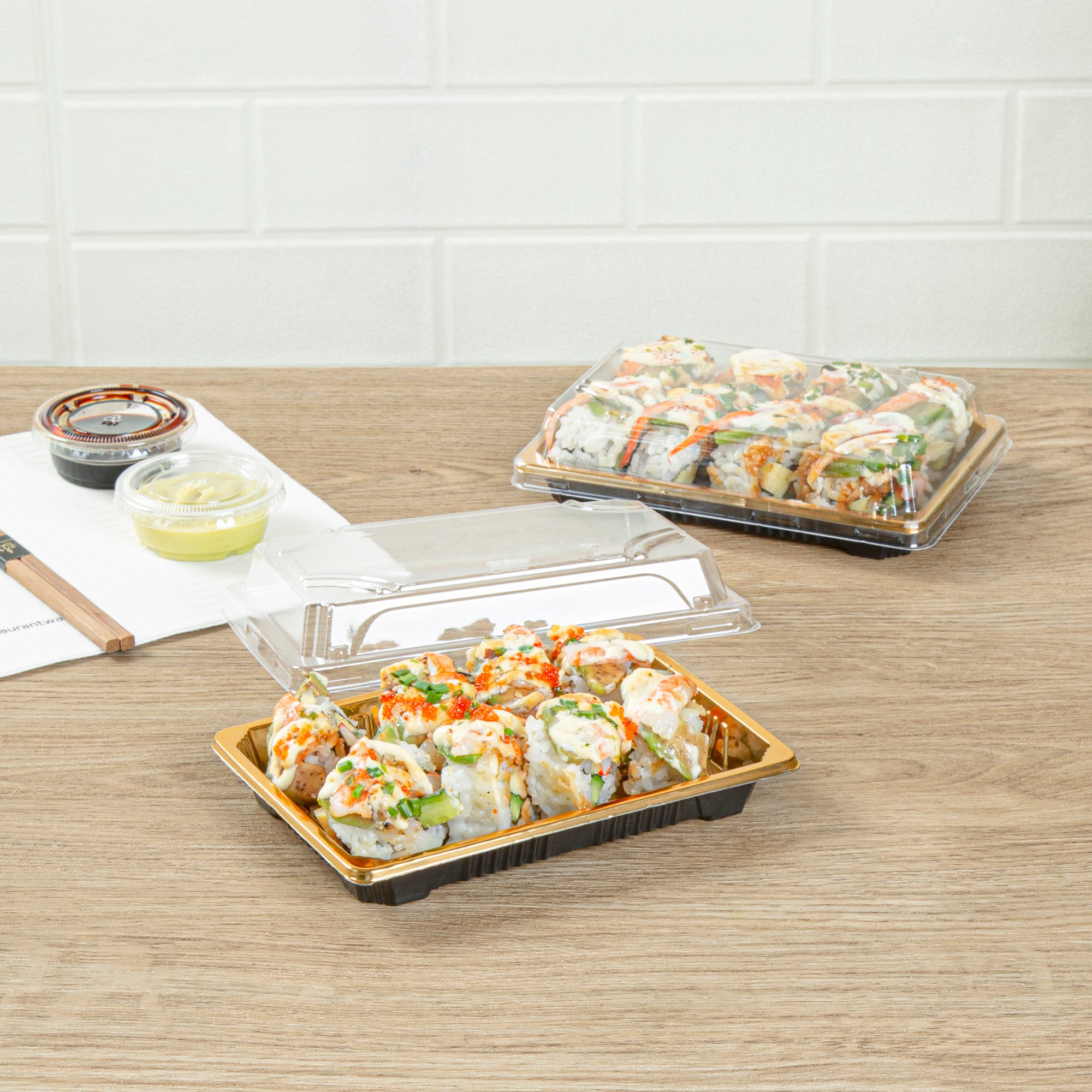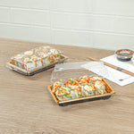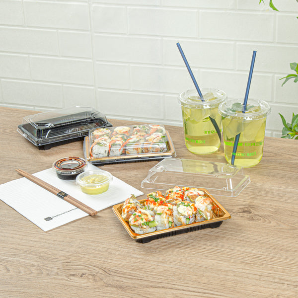 Ensure your sushi stays fresh and beautifully presented. Roku Gold Plastic Sushi Trays with Lids feature a grease-resistant design that keeps sushi rolls fresh and contained, preventing any mess. These plastic sushi containers come with clear, snap-on lids that ensure freshness during transport and storage, while their anti-fog feature maintains clear visibility, showcasing your culinary artistry. With dimensions of 6.5 inches in length by 4.25 inches in width by 1.5 inches in height, these disposable sushi trays offer ample space for various sushi presentations, making them ideal for sushi restaurants, catering events, and grab-and-go sections. Choose these versatile trays to enhance your food presentation and protect your sushi creations. Each order includes 100 Roku Gold Plastic Sushi Trays with Lids.