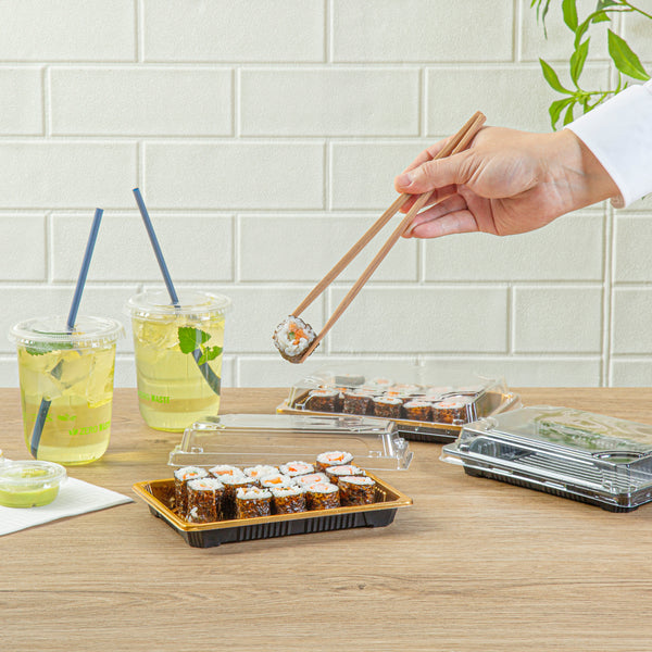 Ensure flawless presentation with leak-resistant sushi trays. Roku Leak-Resistant Gold Plastic Sushi Trays With Lids feature a grease-resistant design that ensures sauces stay contained, preserving the integrity of each sushi roll. Each tray includes clear, snap-on lids that keep sushi fresh while showcasing your culinary artistry, perfect for takeout sushi trays in restaurants or catering events. With anti-fog performance, these trays maintain visibility in cold storage, making them ideal for grocery stores offering pre-packaged sushi. Measuring 7.09 inches in length, 4.92 inches in width, and 1.57 inches in height, these trays are designed for cold food, ensuring freshness in storage. Enhance your sushi offerings with these reliable trays. Each order includes 100 Roku Leak-Resistant Gold Plastic Sushi Trays With Lids.