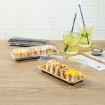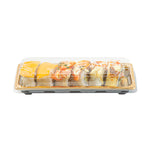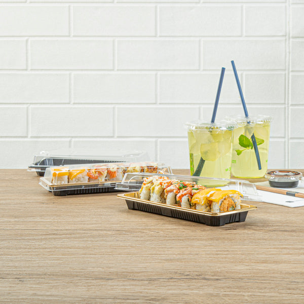 Ensure flawless sushi presentation with leak-proof sushi containers. Roku Gold Grease-Resistant Plastic Sushi Containers feature a snap-on lid design that locks in freshness and enhances visual appeal, making them perfect for sushi takeout or delivery. With anti-fog performance, these plastic sushi containers maintain clear visibility, allowing your creations to shine even in storage. Measuring 8.46 inches in length, 3.35 inches in width, and 1.65 inches in height, these disposable sushi trays offer ample space while the grease-resistant and leak-resistant construction ensures easy transport. These sushi containers are ideal for busy restaurants seeking reliable packaging solutions, catering events, or grocery stores aiming to deliver pre-packaged sushi with confidence. Secure your sushi's integrity today with these versatile trays. Each order includes 100 Roku Gold Grease-Resistant Plastic Sushi Containers.
