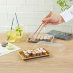 Preserve the flavor and presentation of your sushi rolls effortlessly. Roku Gold Plastic Disposable Sushi Containers feature a grease-resistant design that keeps trays clean and tidy, ensuring sauces stay contained for impeccable sushi takeout boxes. The snap-on lids are designed to maintain sushi freshness and flavor, offering an airtight seal that locks in taste, making these containers ideal for sushi restaurants and catering events. With anti-fog lids, these plastic sushi trays ensure clear product visibility, so your culinary artistry is always on display. Measuring 8.27 inches in length, 5.31 inches in width, and 1.57 inches in height, these trays offer a sustainable choice for reducing your carbon footprint. Designed with curved and indented corners, they prevent cracking during transport, enhancing durability. Elevate your foodservice operations with these space-saving, stackable containers. Each order includes 100 Roku Gold Plastic Disposable Sushi Containers.