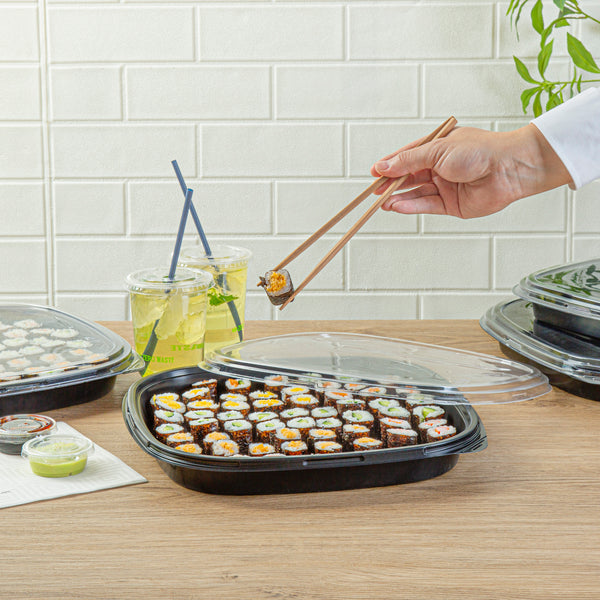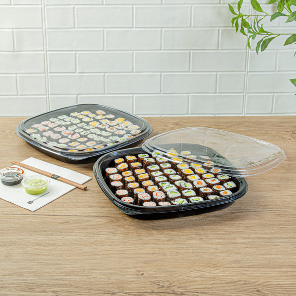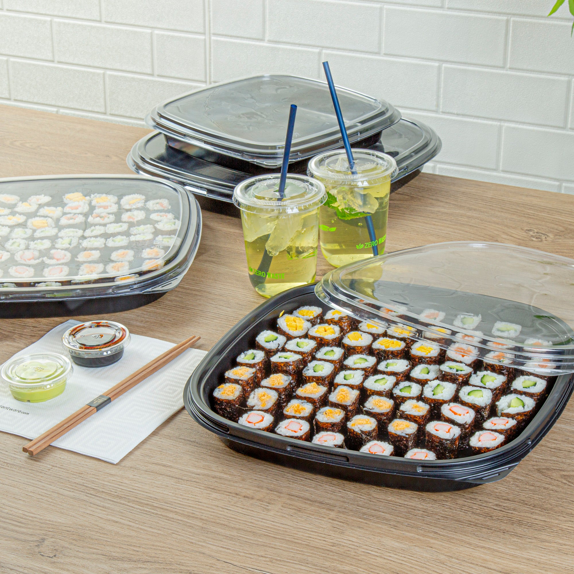 Ensure optimal freshness and presentation with leak-resistant sushi packaging. The Roku Grease-Resistant Plastic Sushi Container is designed with snap-on lids, effectively sealing in freshness for your expertly crafted sushi rolls. These black plastic sushi containers are grease-resistant, containing sauces and any excess grease effortlessly, which enhances your sushi takeout box offerings. Made from materials that align with sustainability goals, allowing your kitchen to minimize its settingal footprint. Measuring 12.6 inches by 12.6 inches by 1.77 inches, these containers provide ample space for various sushi arrangements, while the anti-fog lids preserve visibility and presentation during transit. Elevate your foodservice operations by utilizing these dependable disposable sushi trays to maintain food quality and customer satisfaction. Each order includes 50 Roku Grease-Resistant Plastic Sushi Containers.