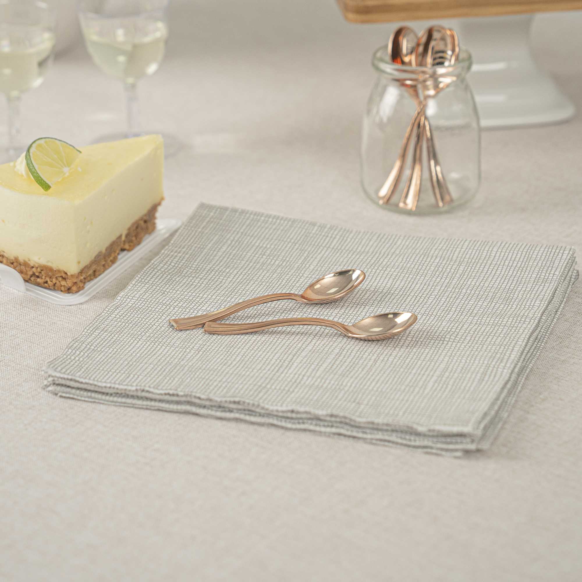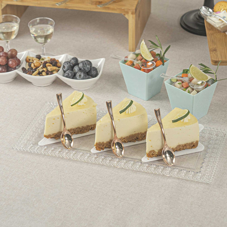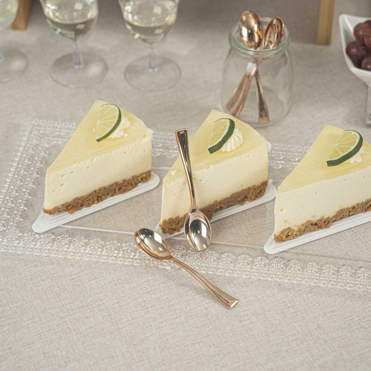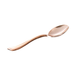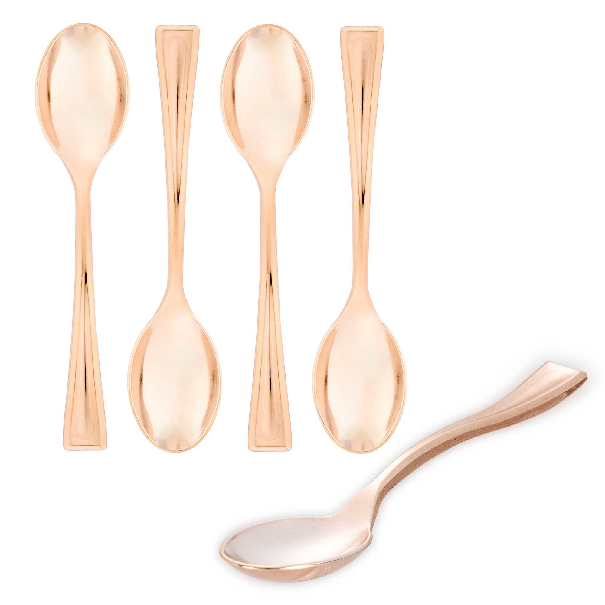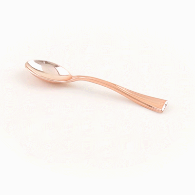 Bring a touch of luxury to your personal-sized appetizers and miniature desserts with our Mini Serve Rose Gold Plastic Mini Spoons. Constructed from premium recyclable plastic, these mini gold plastic spoons are strong, sturdy, and reliable. Covered in an ultra-chic rose gold finish, these small plastic spoons are ideal for trendy restaurants and upscale catering companies. These dessert spoons are built with handles that won't wimp out, providing a comfortable grip. Plus, these mini spoons are conveniently disposable and recyclable, making it easy to reduce your impact on the environment. Each of these spoons measures 4 inches and is perfectly sized for serving alongside bite-sized chocolate cakes or miniature quinoa salads. Shipped in a 100 count box.