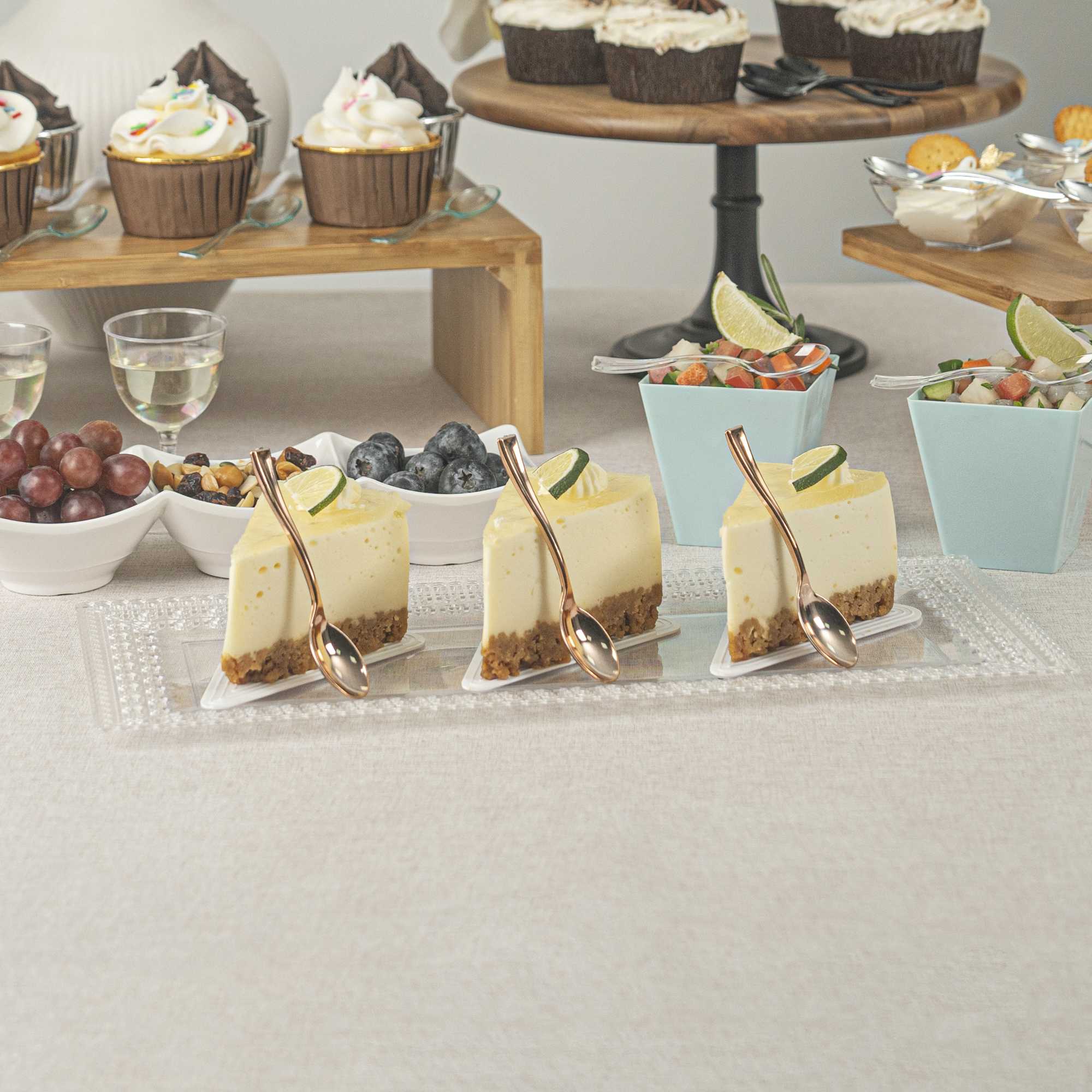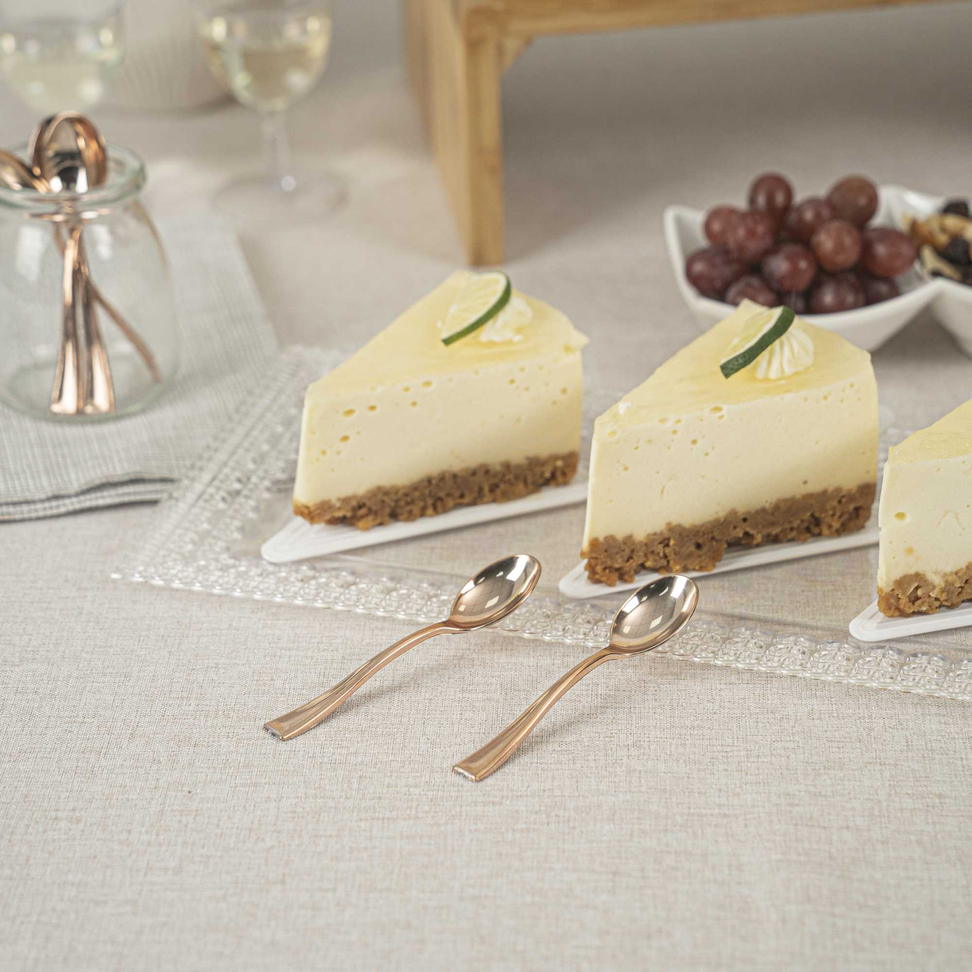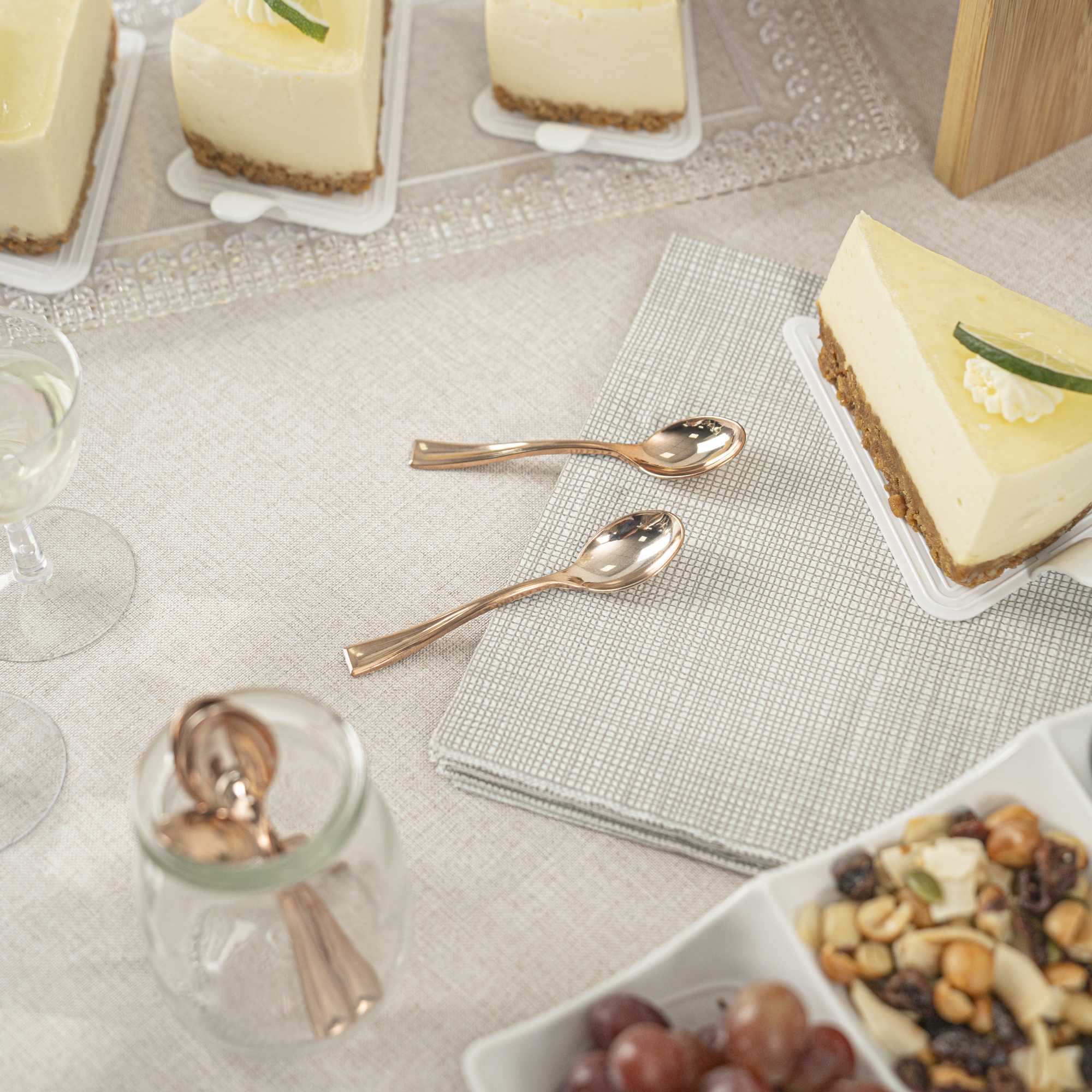 Bring a touch of luxury to your personal-sized appetizers and miniature desserts with our Mini Serve Rose Gold Plastic Mini Spoons. Constructed from premium recyclable plastic, these mini gold plastic spoons are strong, sturdy, and reliable. Covered in an ultra-chic rose gold finish, these small plastic spoons are ideal for trendy restaurants and upscale catering companies. These dessert spoons are built with handles that won't wimp out, providing a comfortable grip. Plus, these mini spoons are conveniently disposable and recyclable, making it easy to reduce your impact on the environment. Each of these spoons measures 4 inches and is perfectly sized for serving alongside bite-sized chocolate cakes or miniature quinoa salads. Shipped in a 100 count box.