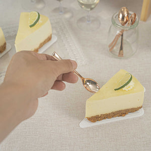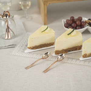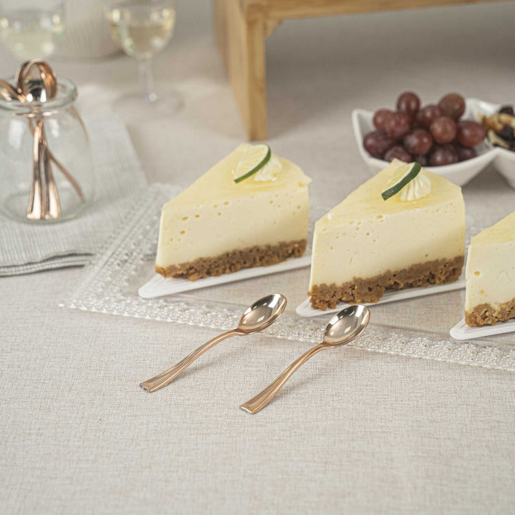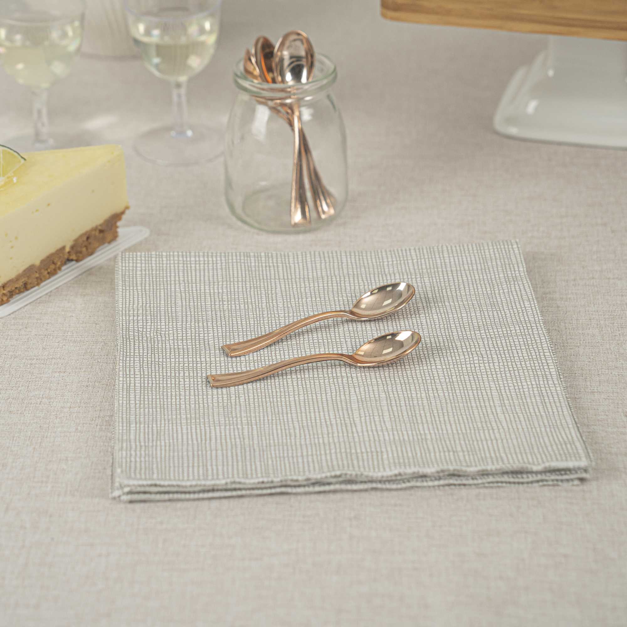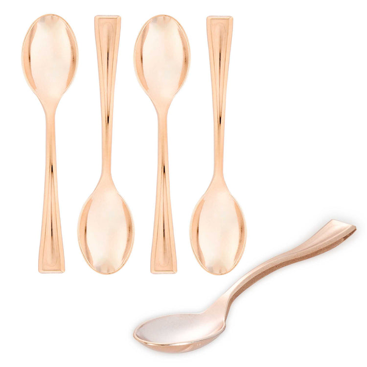 Bring a touch of luxury to your personal-sized appetizers and miniature desserts with these Mini Serve trendsetting mini dessert spoons. Covered in an ultra-chic rose gold finish, these small plastic spoons are ideal for trendy restaurants and upscale catering companies. Their 4-inch length is perfectly sized for serving alongside bite-sized chocolate cakes or miniature quinoa salads, and their unique metallic finish is sure to make those appetizer and dessert courses shine. Constructed from premium recyclable plastic, these mini gold plastic spoons are built with handles that won't wimp out -- they're strong, sturdy, and reliable. Plus, these mini spoons are conveniently disposable and recyclable -- making it easy to reduce your impact on the environment! Each spoon measures 4 inches and is shipped in bulk in a 500 count box.