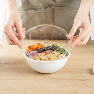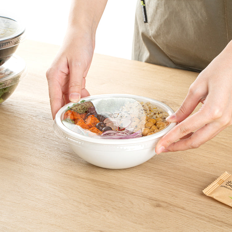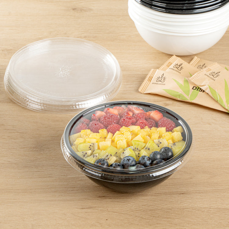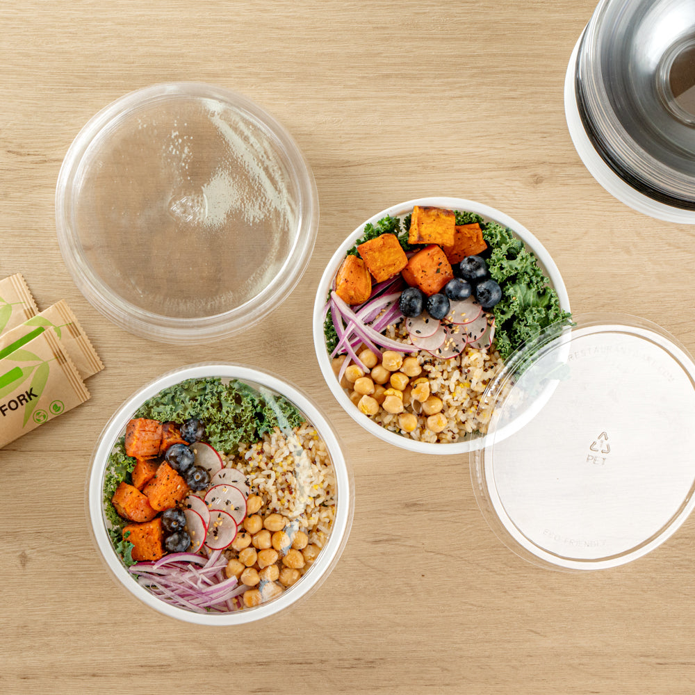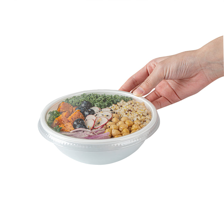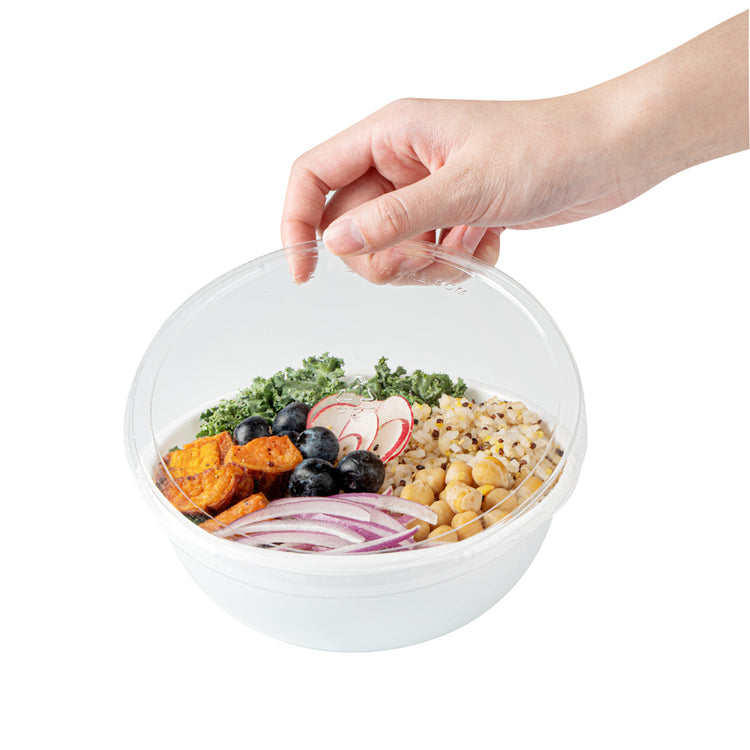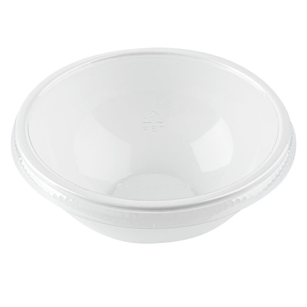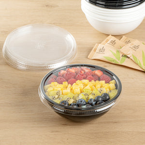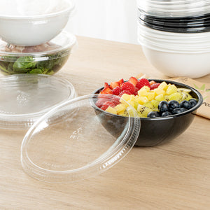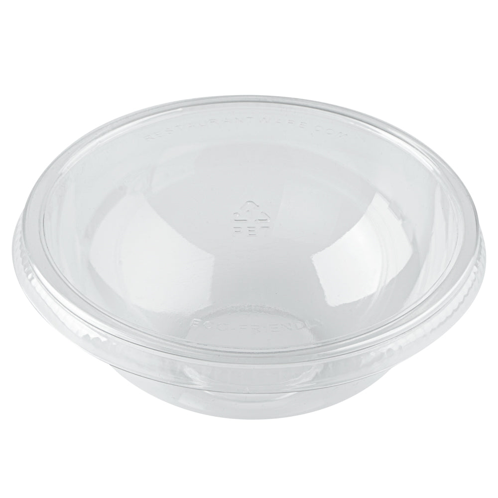 Secure take out orders at your foodservice establishment using our Tamper Tek Round Clear Plastic Lids. Featuring a clear finish, these plastic lids provide customers with a full view of your fresh fruit salads, ravioli, or acai bowls. Made from high-quality plastic, these clear lids are built to be crack-resistant and are recyclable for fast and hassle-free cleanup after service hours. Pair any of our Tamper Tek 18-ounce serving bowls with lids to prevent messes during delivery services and keep meals fresher for longer (SKU: RWP0205B, RWP0205C, and RWP0205W). Measuring 6.3 inches in diameter, these clear flat lids are conveniently stackable for space-efficient storage in your commercial kitchen. Shipped in a 200 count box. Plastic salad bowls are available and sold separately.