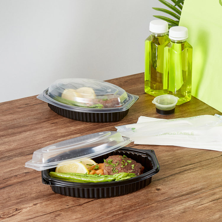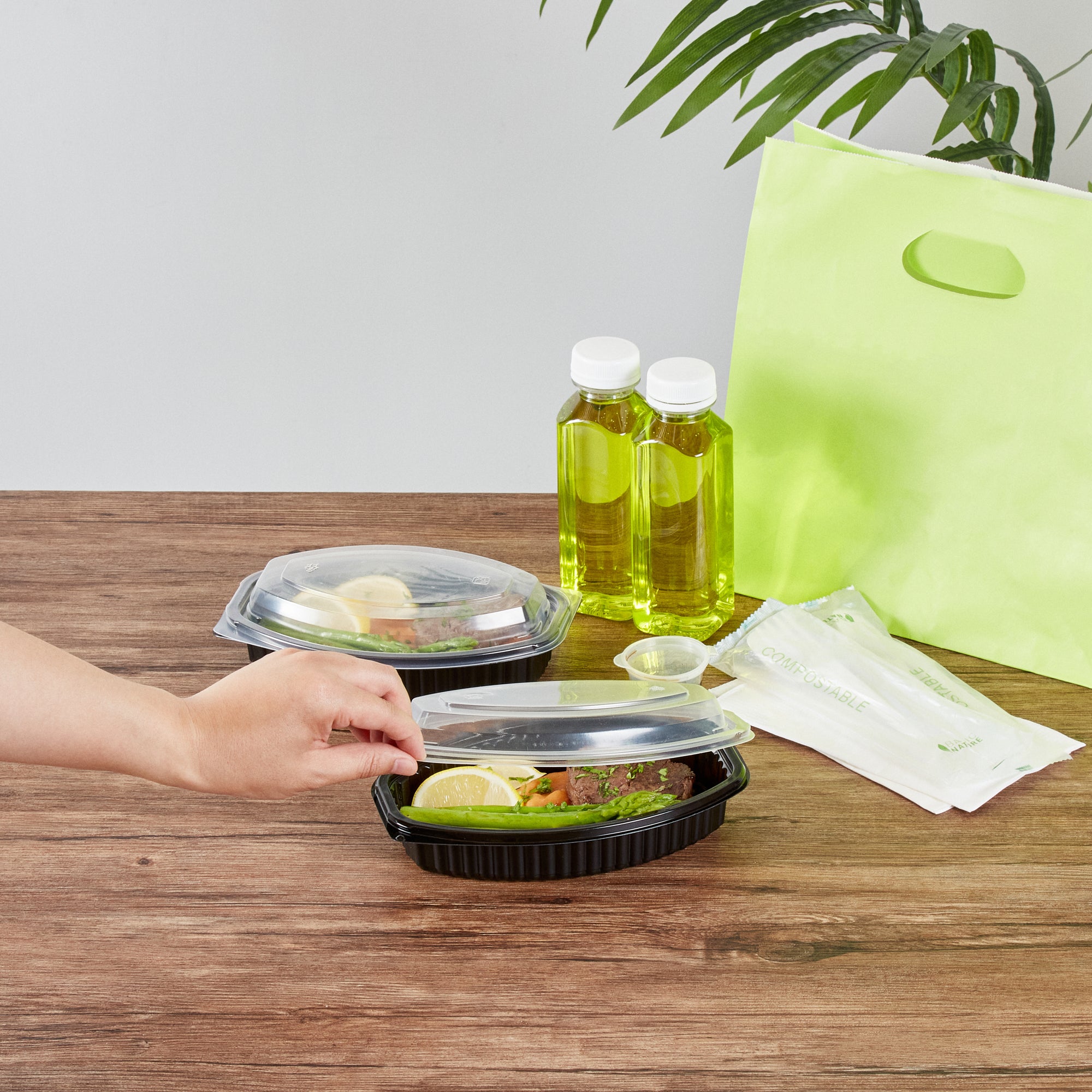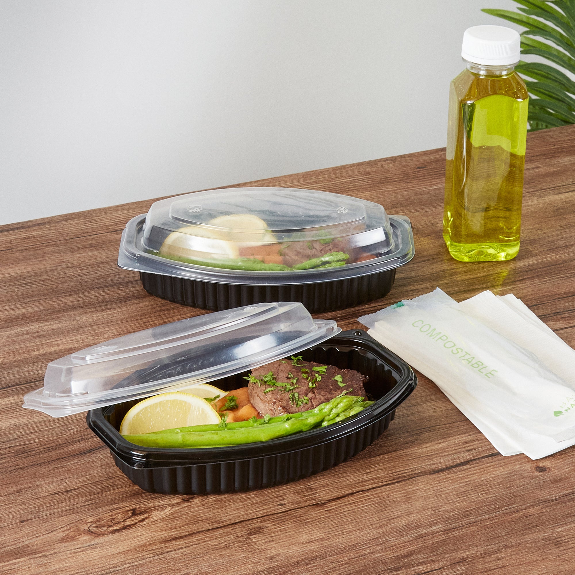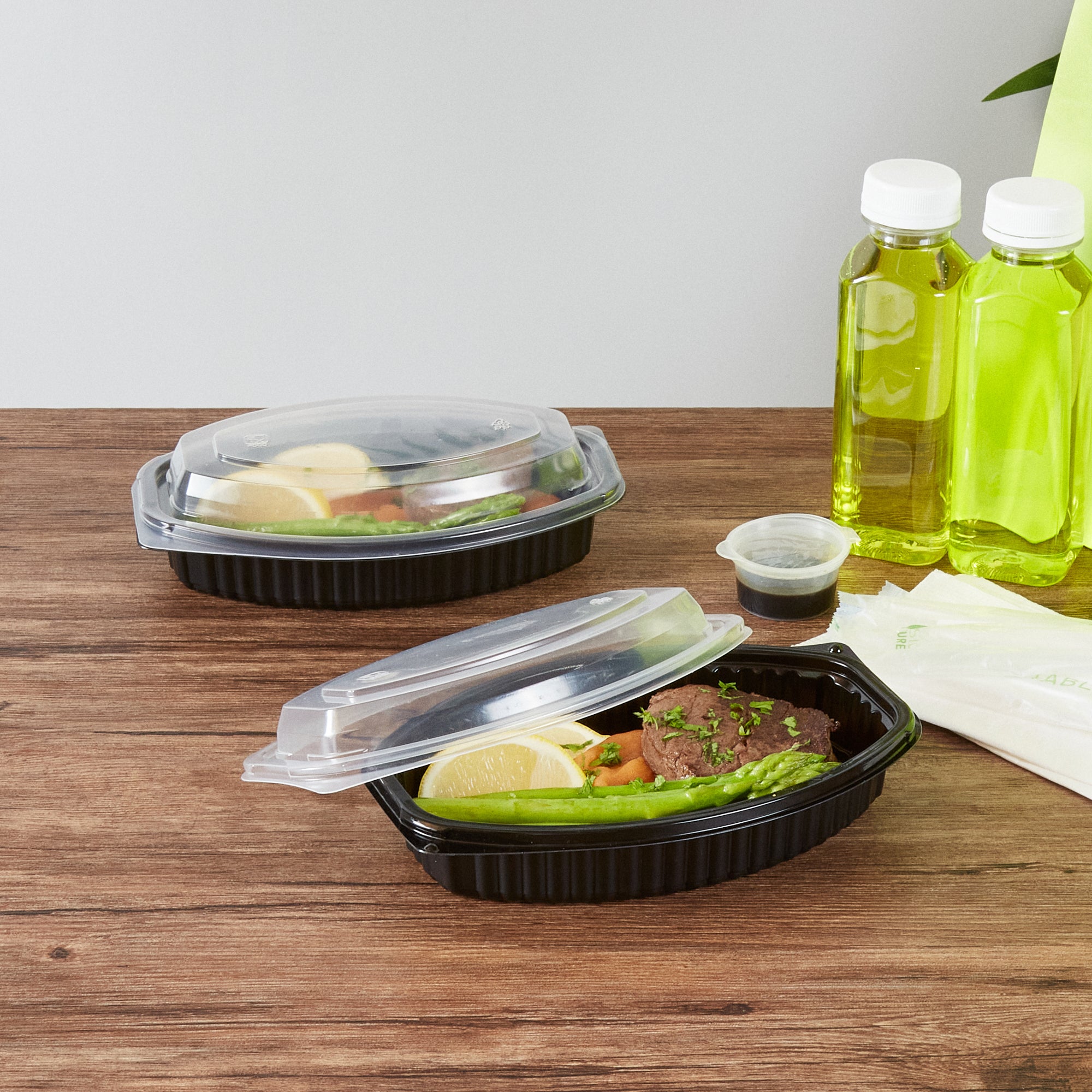 Elevate your foodservice presentation with our Chef 101 16-ounce Oval Black Plastic Food Containers. These plastic food containers come with a secure clear plastic lid and seal tightly to reduce spills during transportation. The flat design of these plastic lids allows for easy stacking and storing, maximizing space efficiency and ensuring secure transport. Designed for convenience, these take out containers are microwave-safe, letting customers reheat meals without needing additional utensils. Made from premium plastic, these to go containers can hold both hot and cold food items. These clear lids display the delicious contents inside, making them highly attractive to customers. The sleek black finish of these carry out containers adds a touch of sophistication to your takeaway meals, enhancing presentation. To store leftovers, these disposable food containers are freezer-safe and allow you to refrigerate your food for later use. Ideal for eco-conscious foodservice establishments, these takeaway containers are recyclable and help minimize your carbon footprint. These plastic containers with lids are disposable and can be thrown away after use, making cleanup easy. These food containers with lids measure 8 inches in length by 5.5 inches in width by 2.25 inches in height and have a capacity of 16 ounces. Sold in a 50 count box.