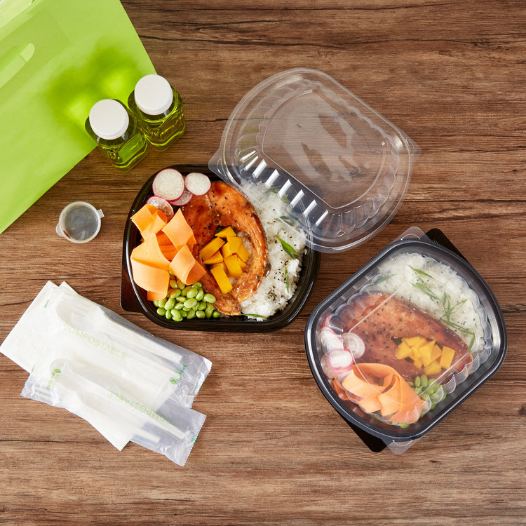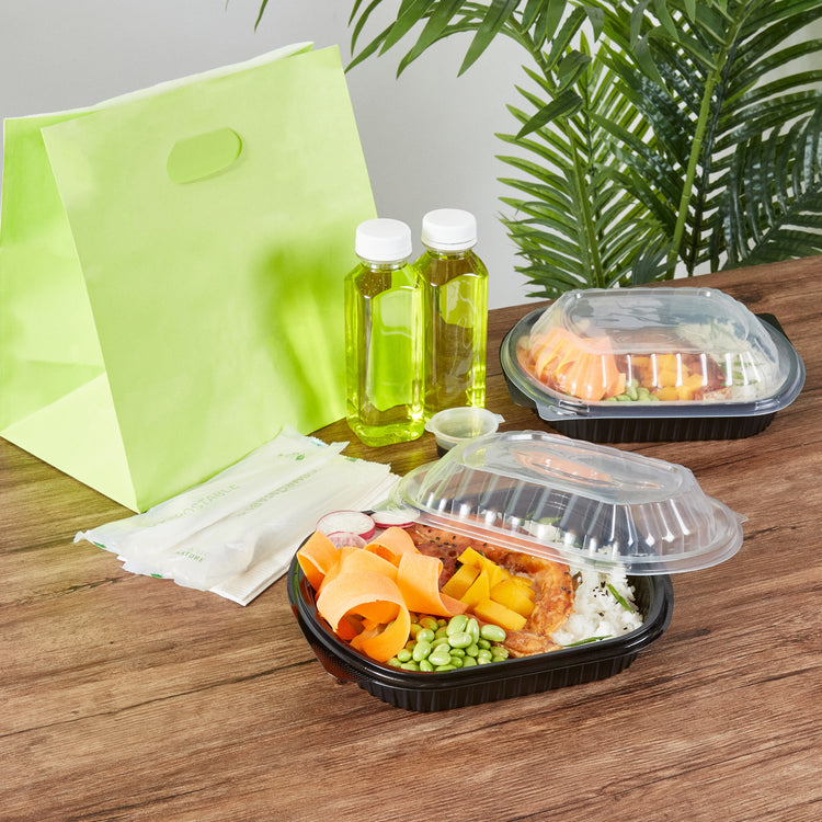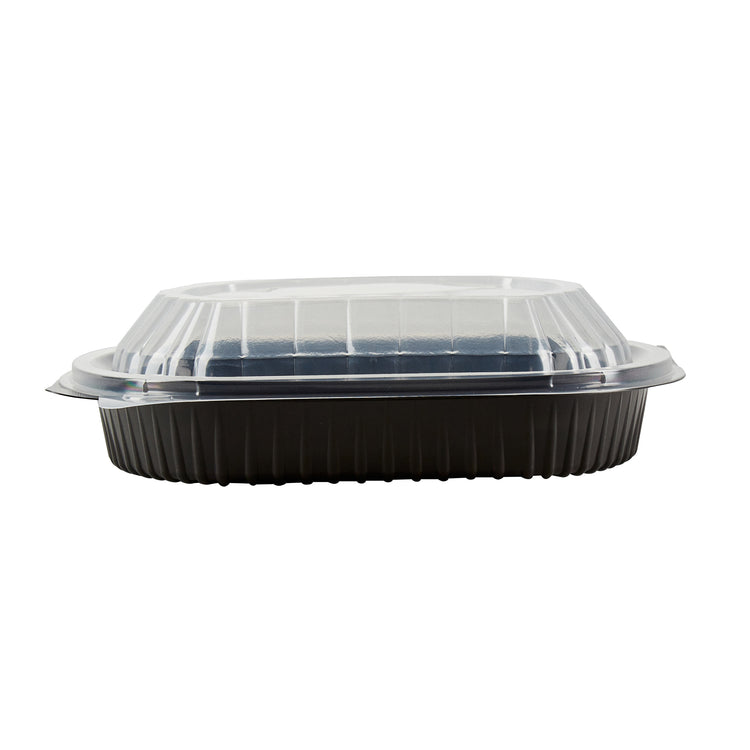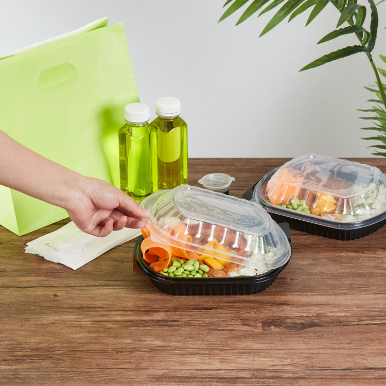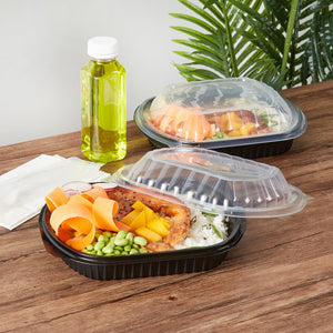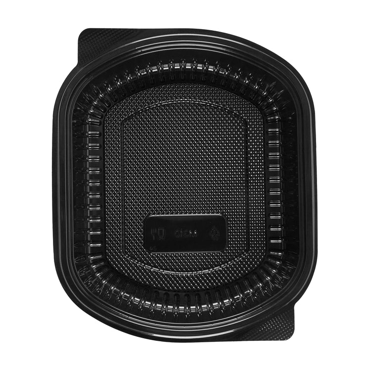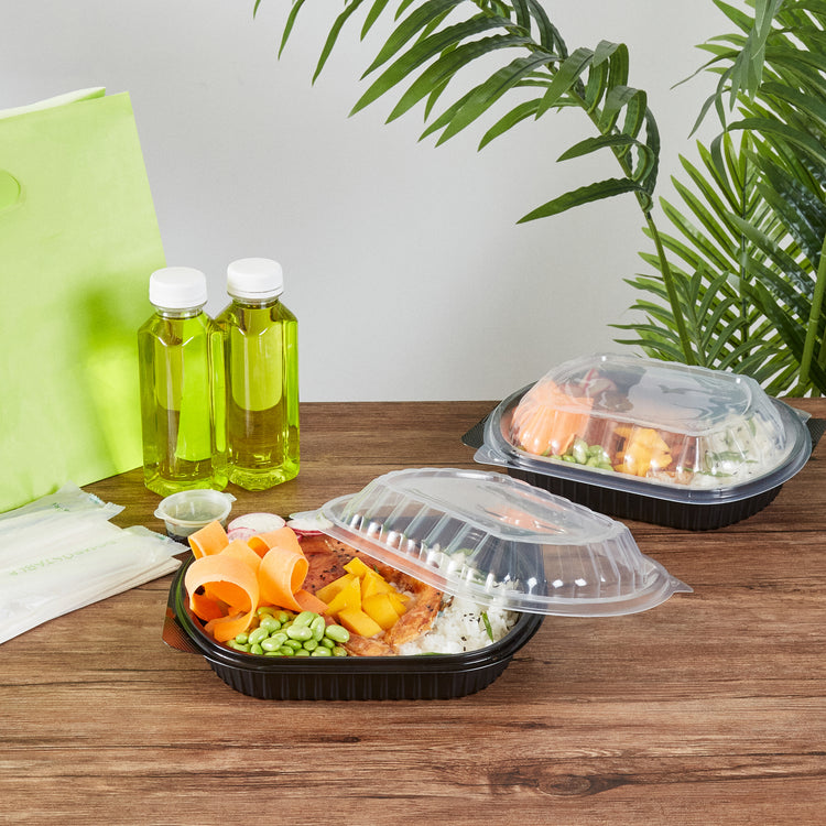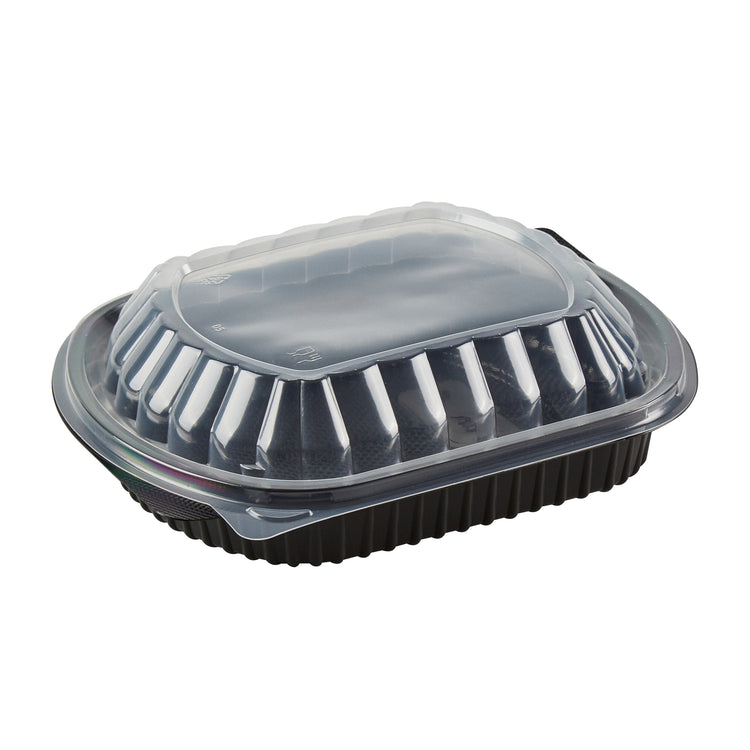 Elevate your food packaging with our Chef 101 34-ounce Oval Black Plastic Food Containers. These plastic food containers come with a clear plastic lid and form a secure seal to prevent spills, keeping your food intact in transit. Designed to be microwave-safe, these to go containers offer customers the convenience of reheating meals without the need to transfer to another dish. The clear lids of these take out containers provide excellent visibility for easy content identification. These carry out containers feature a black finish, adding a touch of sophistication to any takeaway meal. Ideal for leftover storage, these plastic containers with lids are freezer-safe and let you refrigerate your food for later use. For eco-conscious foodservice establishments, these takeaway containers are recyclable and help minimize your carbon footprint. These food containers with lids are disposable and can be discarded after use, facilitating an easy cleanup. Measuring 9.5 inches in length by 8 inches in width by 2.75 inches in height, these take out boxes have a capacity of 34 ounces making them perfect for a variety of dishes. Sold in a 50 count box.