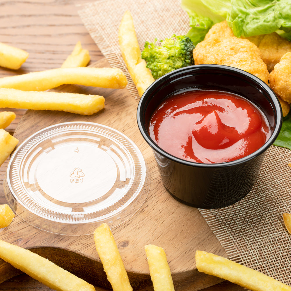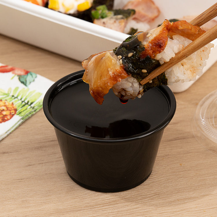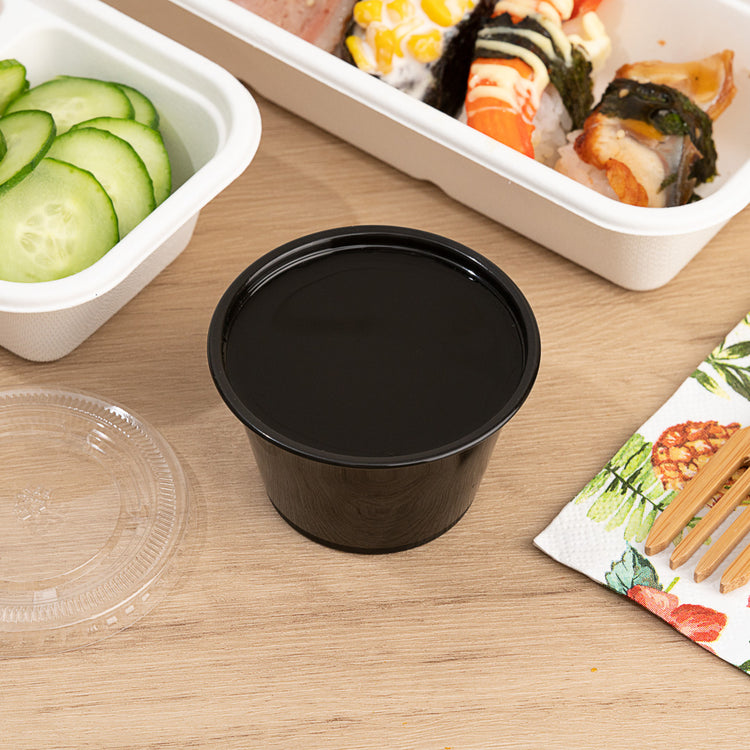 Enjoy savory condiments and dressings using our Chef 101 4-ounce Round Black Plastic Portion Cups. These 4-oz portion cups are ideal for restaurants, cafes, or food trucks, and can be easily recycled after use, for a quick and sustainable way to dispose of cups. Made with premium plastic, these small sauce cups are microwave-safe so employees can heat up sauces and toppings in a hassle-free manner. These plastic dip cups can be paired with our coordinating clear lids (SKU: RWP0628C) to take condiments on the go. The rolled rim of these 4-oz portion cups helps securely seal lids onto cups to prevent messes or spills during delivery. These small sauce cups have a stylish black finish to enhance food presentations. To maximize storage at your establishment, these 4-oz portion cups are conveniently stackable. These plastic dip cups measure 3 inches in diameter and 1.75 inches in height. Sold in a 2000 count box. Lids available and sold separately.