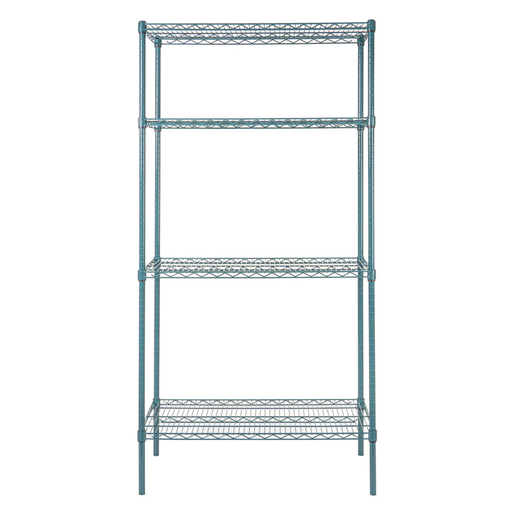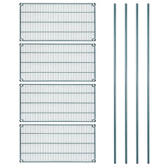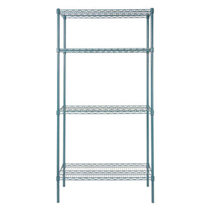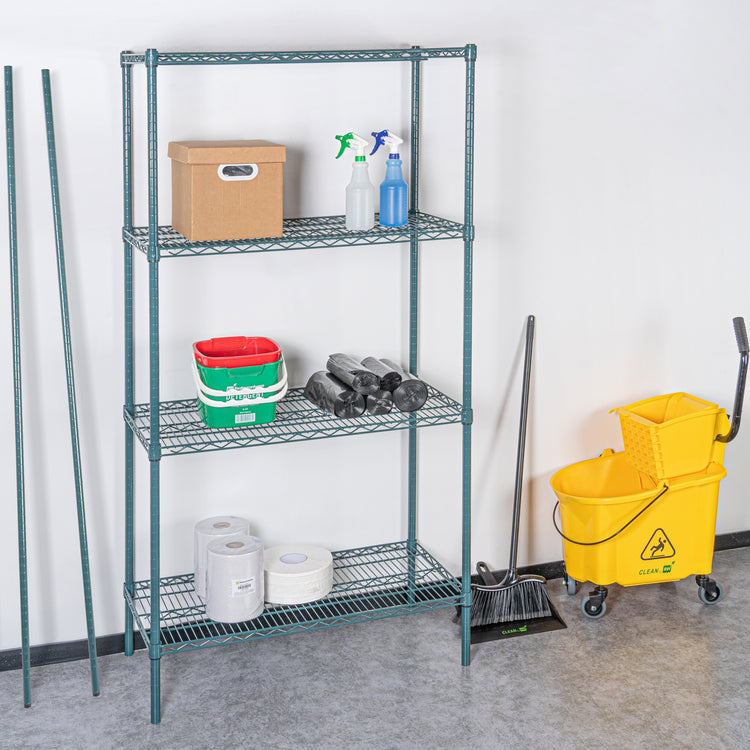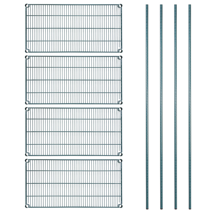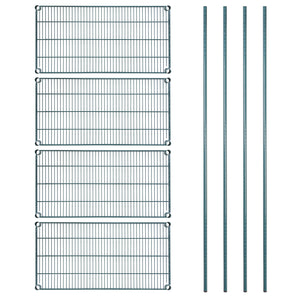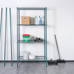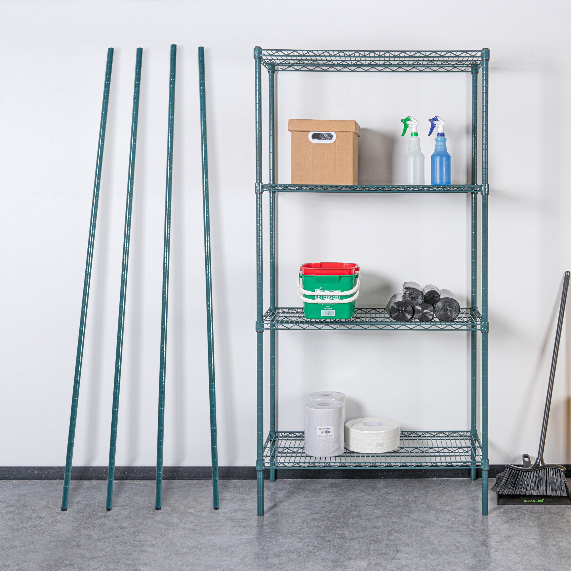 Simplify your storage needs and add a splash of resilience to your commercial kitchen with our Chef 101 4-Tier NSF Green Epoxy Shelving Unit. Crafted from sturdy steel, each wire shelf can bear up to 450 pounds, offering generous space for all your kitchen essentials. Boasting a green epoxy coating, these wire storage racks are corrosion-resistant to place them in moist environments such as freezers or refrigerated areas. The vertical rib structure of the shelves enhances durability and stability, while the vented design promotes airflow and minimizes dust buildup, maintaining the freshness of stored items. With the included 32 split sleeves and the heavy-duty metal shelving posts that have marked rings, these posts allow for easy, level mounting of shelves at your desired height. Each shelf measures 18 inches in width by 36 inches in length by 1.5 inches in height, and the posts measure 74 inches in height, providing ample vertical space for multiple shelves. Each order includes 4 shelves and 4 posts.
