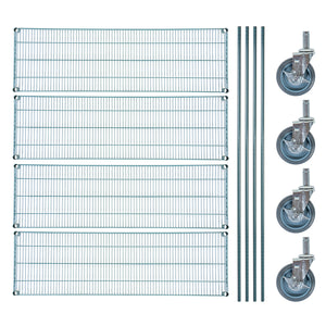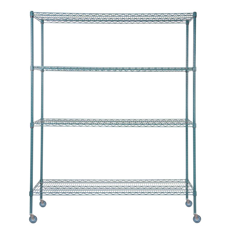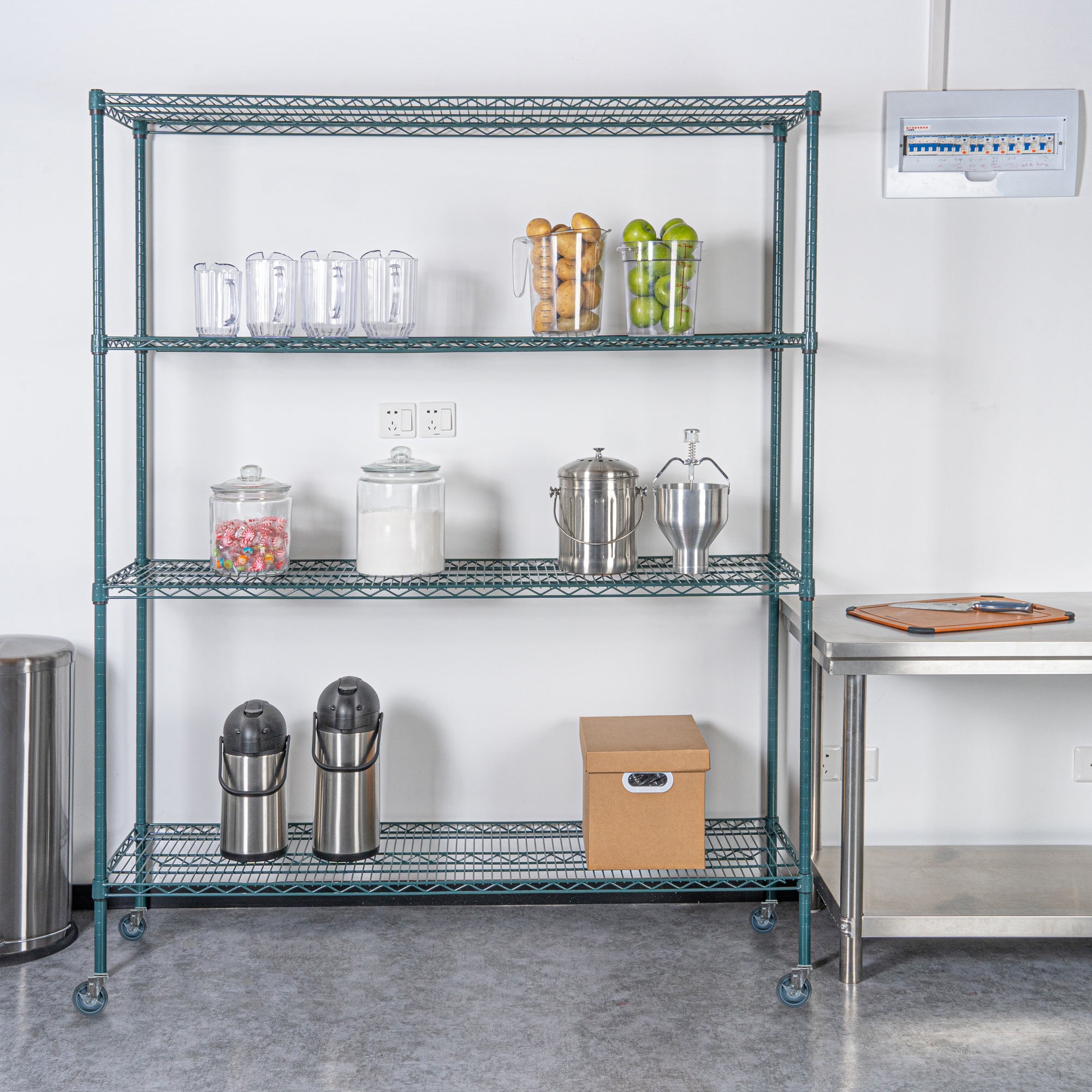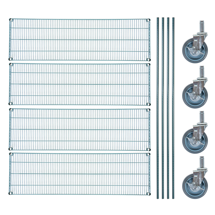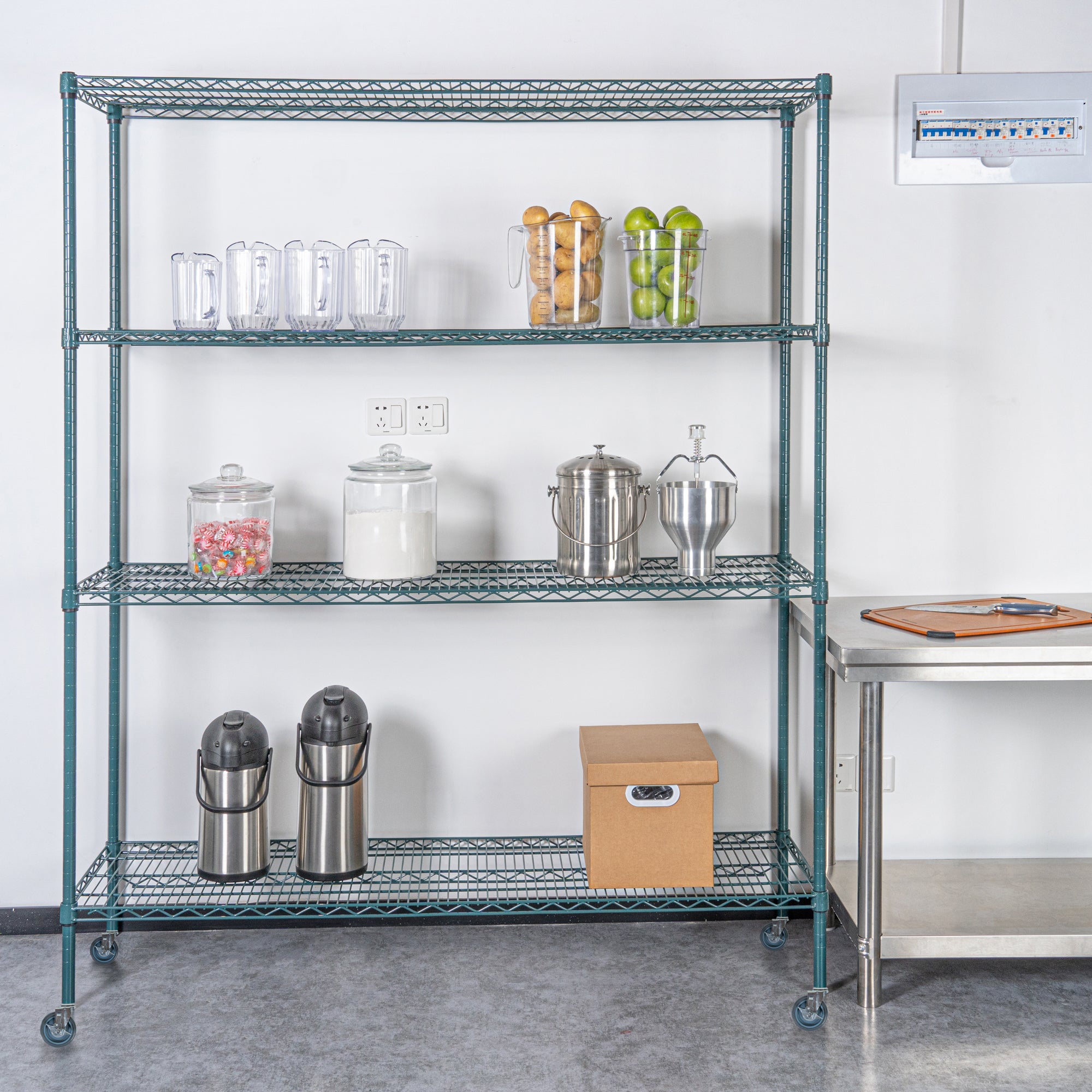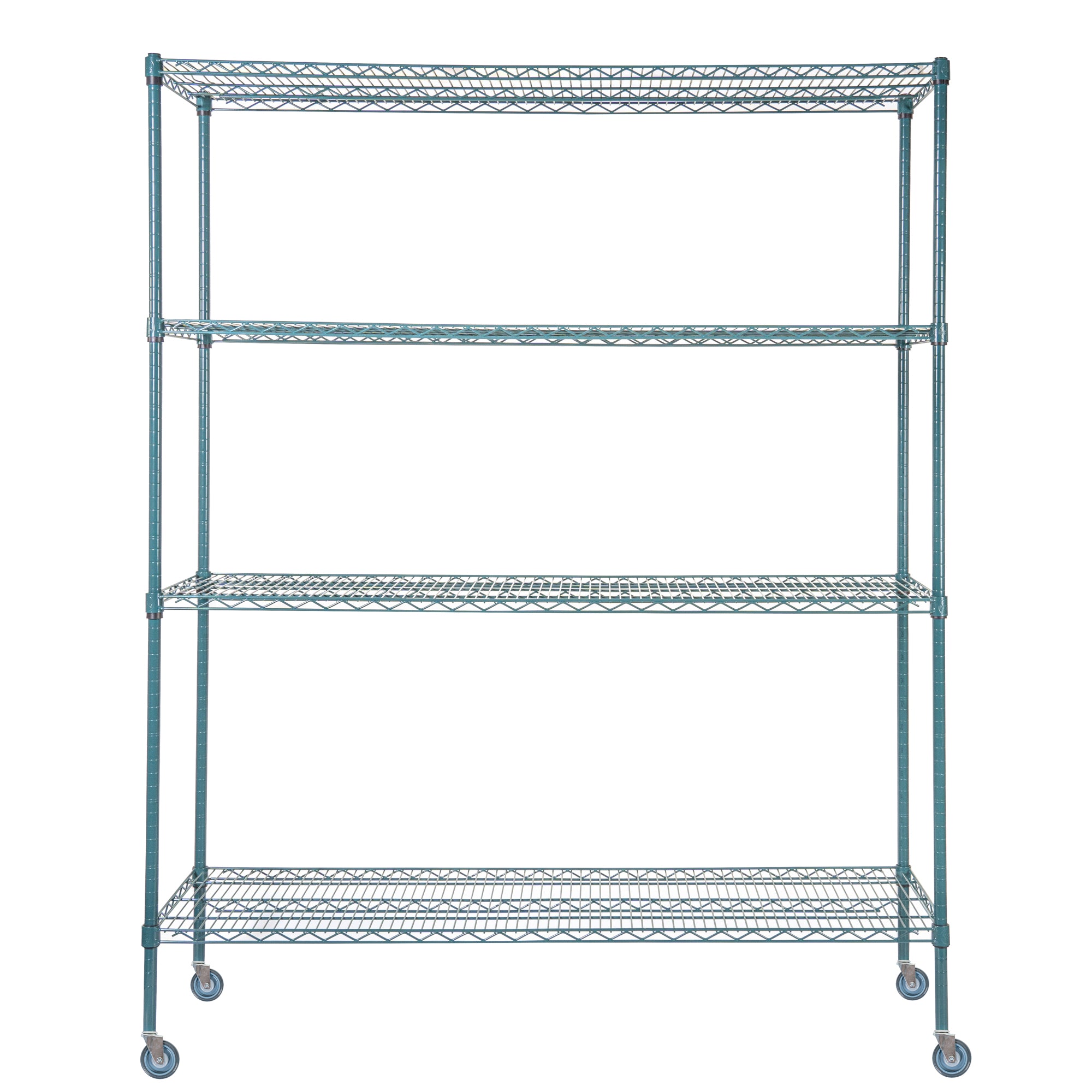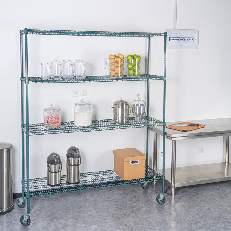 Organize your space efficiently with the Chef 101 4-Tier NSF Green Epoxy Shelving Unit. Constructed from durable steel, each storage shelf can hold up to 450 pounds. The green epoxy coating resists corrosion, making it perfect for humid areas like walk-in refrigerators or freezers. With vertical ribs, these shelves provide extra stability to these wire shelves to prevent tipping. The vented design of these NSF-certified shelving units promotes airflow and reduces dust buildup, maintaining freshness. Featuring posts and 32 split sleeves, this kit allows for adjustable shelf heights. Not to mention, the included casters enable easy mobility of the shelves. Each shelf measures 18 inches by 60 inches by 1.5 inches, while the posts are 74 inches tall. The casters are 5 inches in diameter. Each order includes 4 shelves, 4 posts, and 4 casters.