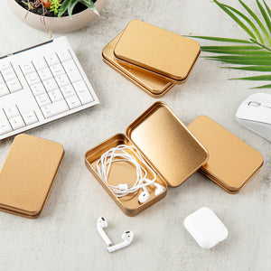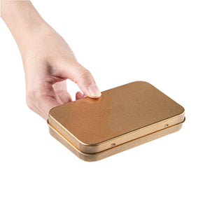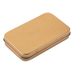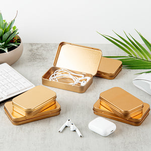 Save space in your bag by packing assorted travel necessities in our Chef 101 6-ounce Rectangle Gold Tin Containers. Manufactured using top-quality tin material, these metal storage containers with lids do not rust or break easily. To provide you with a comfortable use, these metal storage boxes come with hinged lids for easy closing and opening of the boxes. Plus, the lids of these airtight tin boxes fit perfectly to secure the contents inside the boxes. To protect your hands, these tin containers for storage have rounded edges that are smooth and seamless. With a lightweight structure, these tin boxes with hinged lids are compact and fit inside your bags easily during transit. The royal gold shade of these metal storage boxes with lids allows you to customize them with your DIY ideas. Each of these rectangular containers for storage can contain up to 6 ounces and measures 4.5 inches in length by 2.75 inches in width. Sold in a 100 count box.