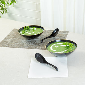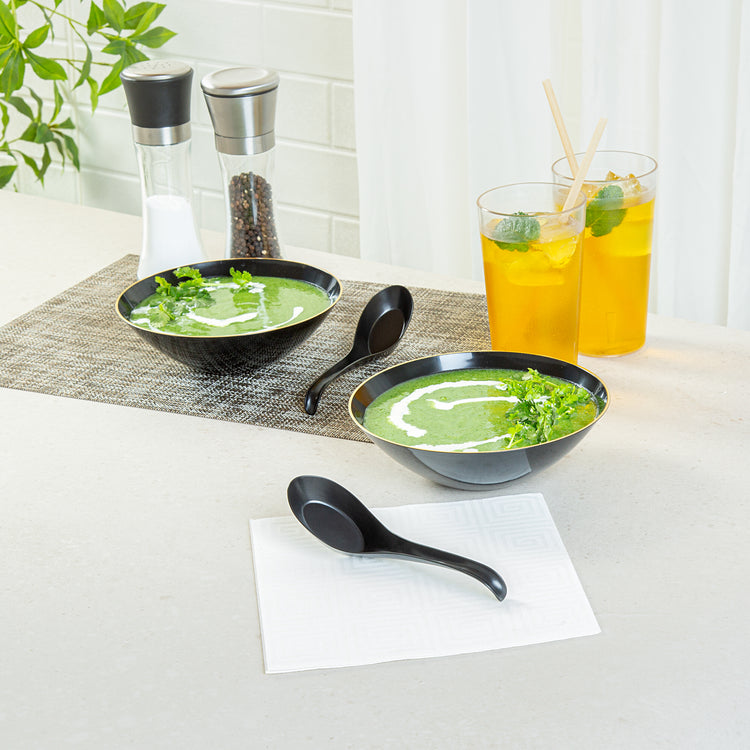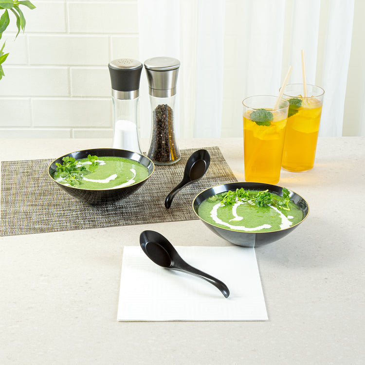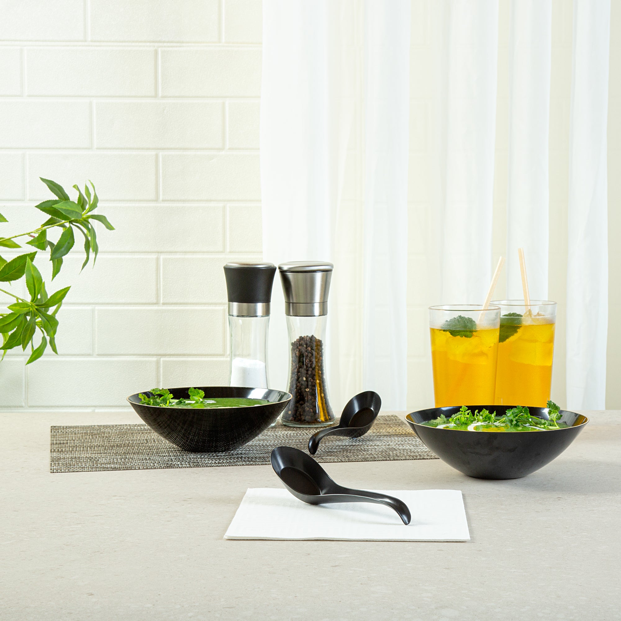 Enhance your dining experience with our Chef 101 Black Plastic Asian Soup Spoons. Crafted from premium plastic, these black spoons are durable and perfect for any foodservice setting. The reinforced handles of these Asian spoons provide extra strength, ensuring they can handle hefty bites of your favorite dishes. With a heat resistance of up to 200F, these plastic spoons are ideal for serving hot piping soups and meals. The sleek black finish of these Japanese soup spoons adds a stylish touch to your food presentation, impressing your guests. For added convenience, these disposable Chinese soup spoons can be easily discarded after use, making cleanup a breeze. Measuring 6.5 inches in length by 1.7 inches in width by 3.2 inches in height, these Asian soup spoons are designed to cater to all your dining needs. Sold in a 100 count box.