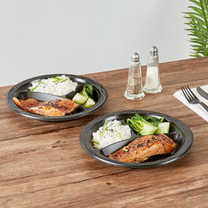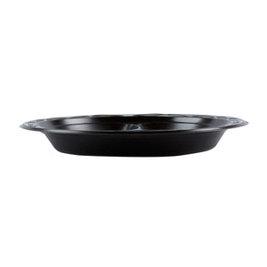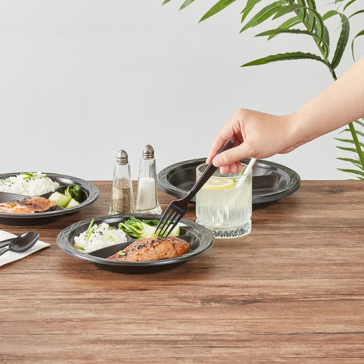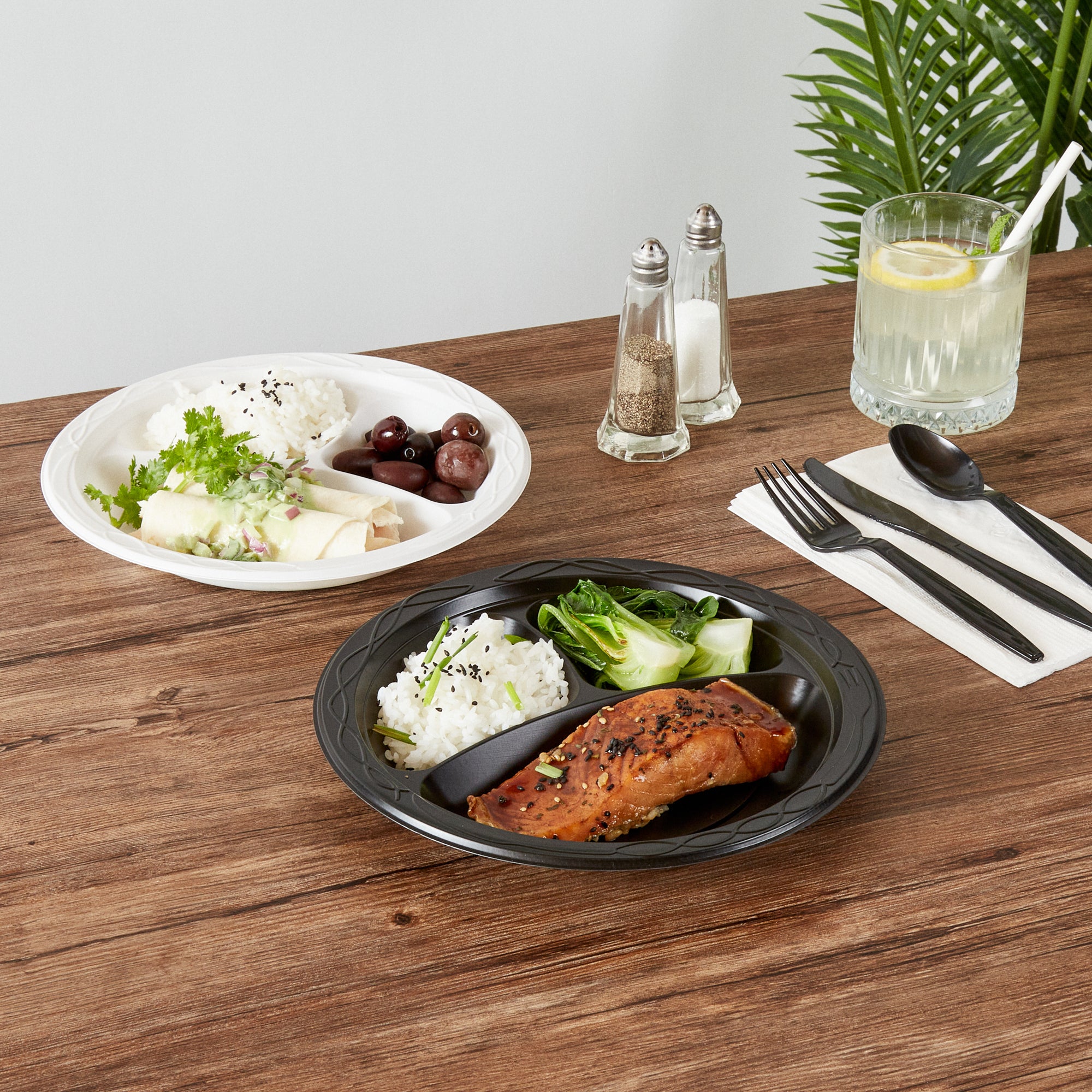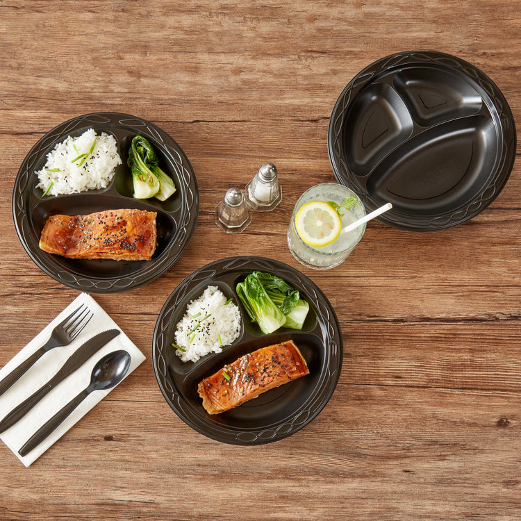 Serve up yummy dishes with our Chef 101 Round Black Plastic Plates. Designed with three compartments, these party plates make it easy to serve a balanced meal, with separate sections for mains, sides, and desserts. These plastic plates are microwave-safe and allow you to easily reheat your meals, ensuring convenience for busy kitchens. Made from premium plastic, these serving plates are suitable for serving both hot and cold food items, catering to a variety of dishes. The sleek black finish of these disposable plates accentuates your food presentation, making them visually appealing and perfect for upscale events. These dinner plates are disposable and provide an easy cleanup, saving time and effort for your staff. Plus, these food plates are recyclable, offering an eco-friendly way to serve meals and reduce environmental impact. Measuring 9 inches in diameter, these black plates provide ample space for generous portions. Sold in a 100 count box.