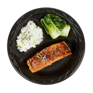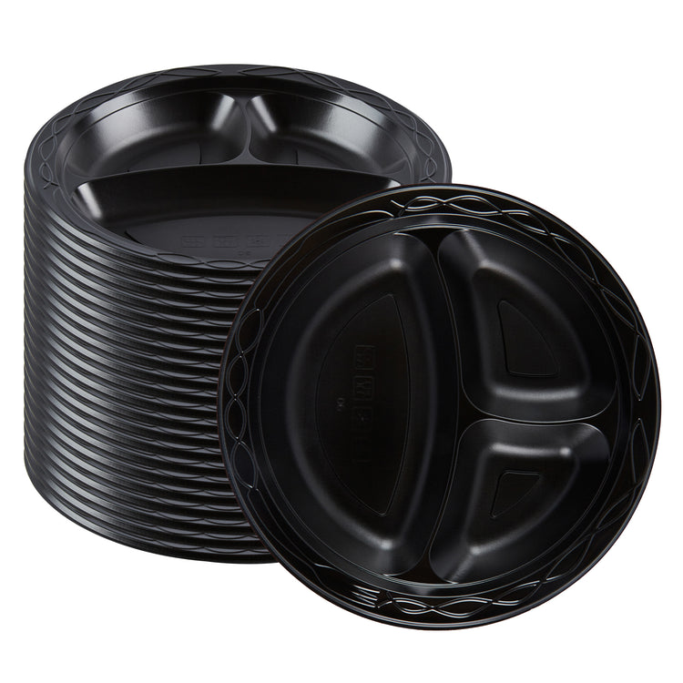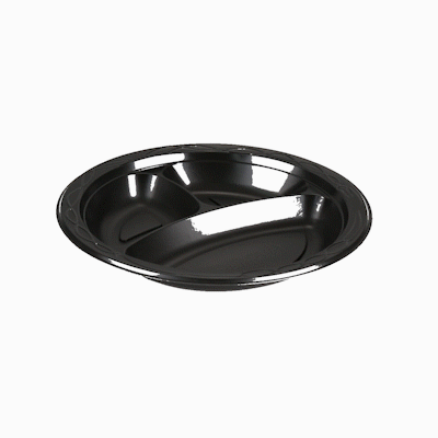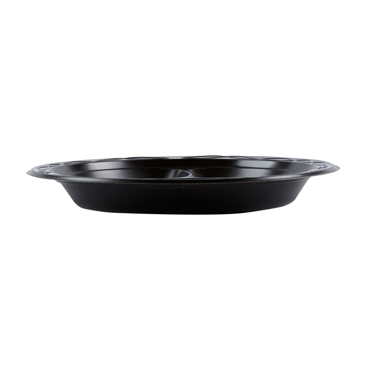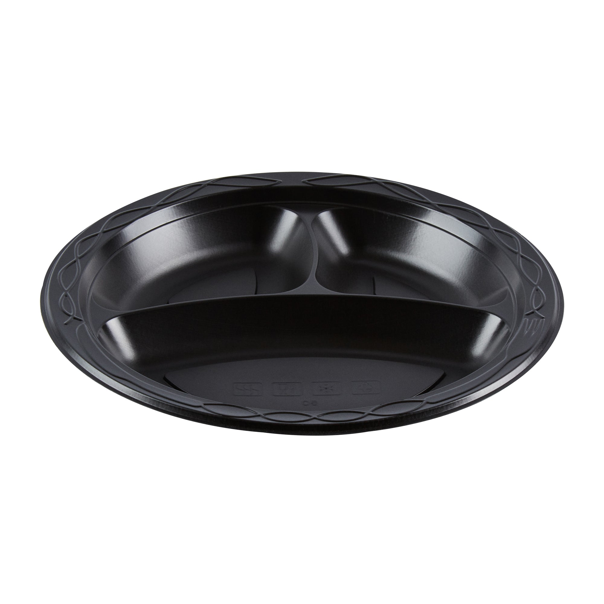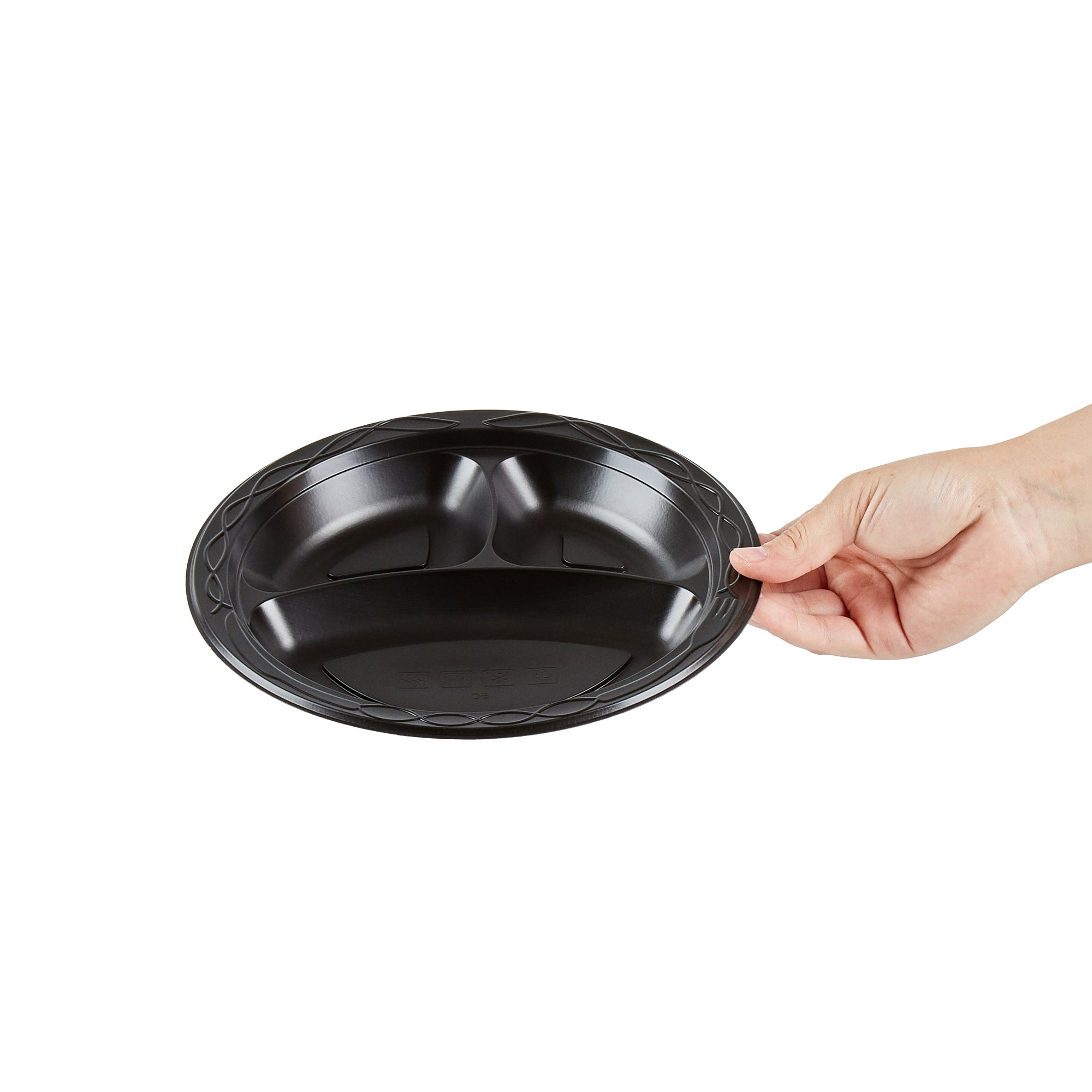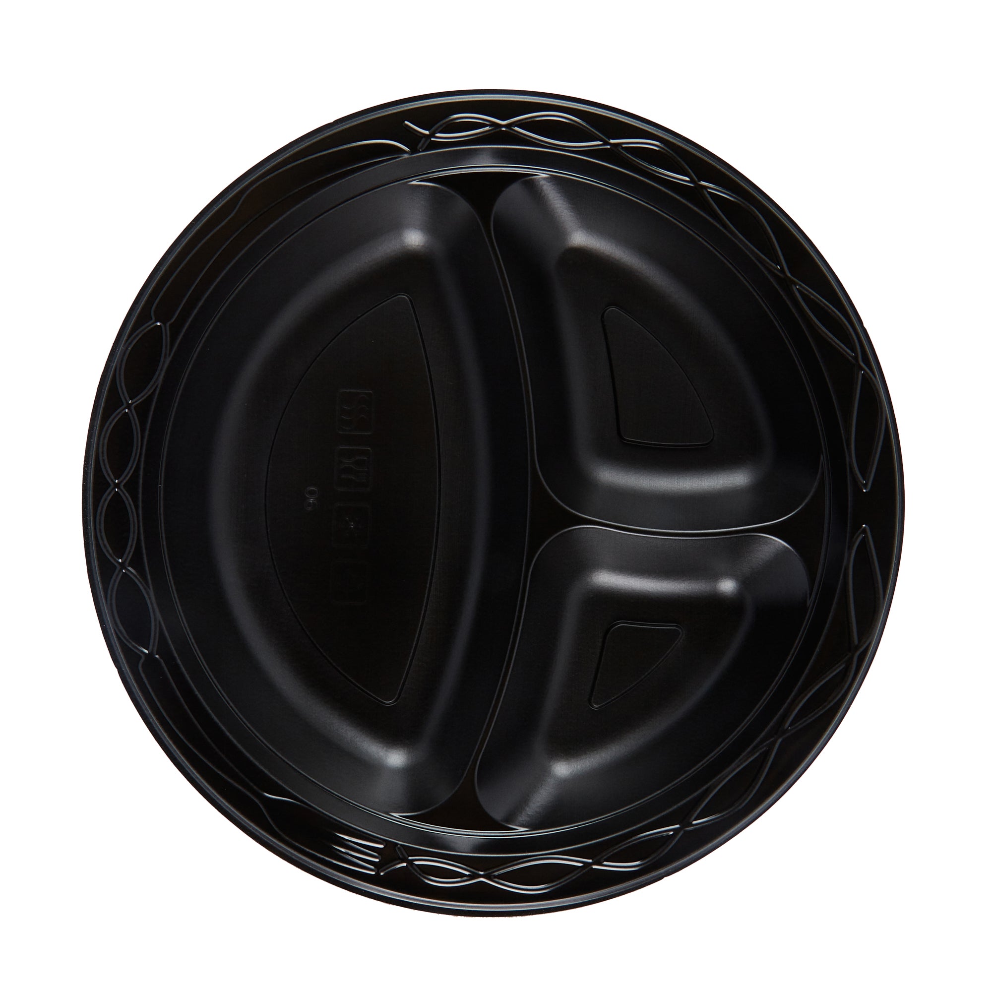 ROUND BLACK PLASTIC PLATE - 3 COMPARTMENTS, MICROWAVABLE