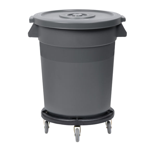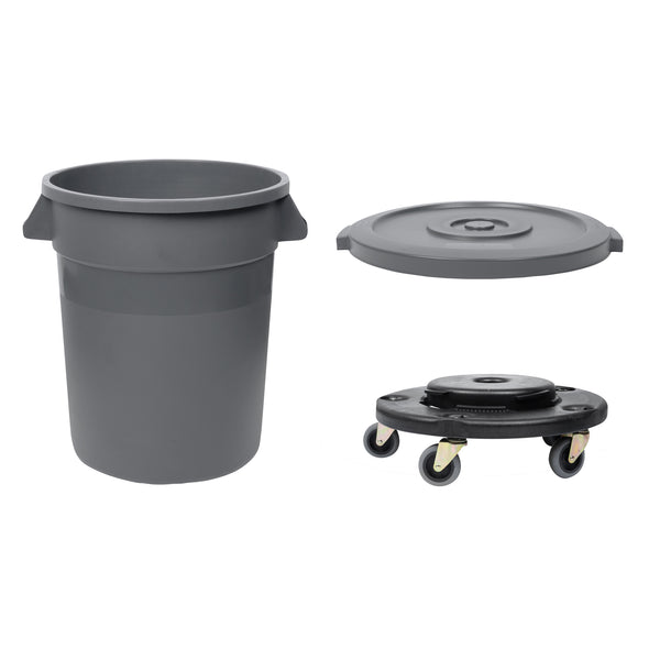 GRAY 20 GAL PLASTIC TRASH CAN AND LID AND DOLLY