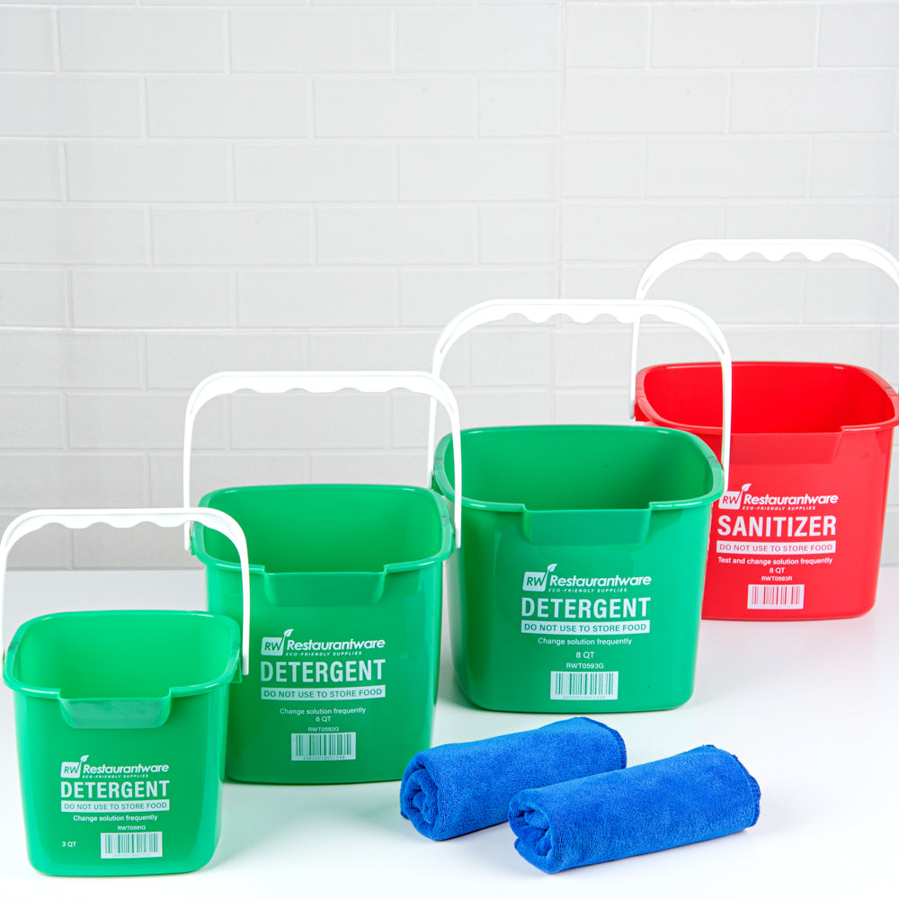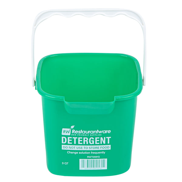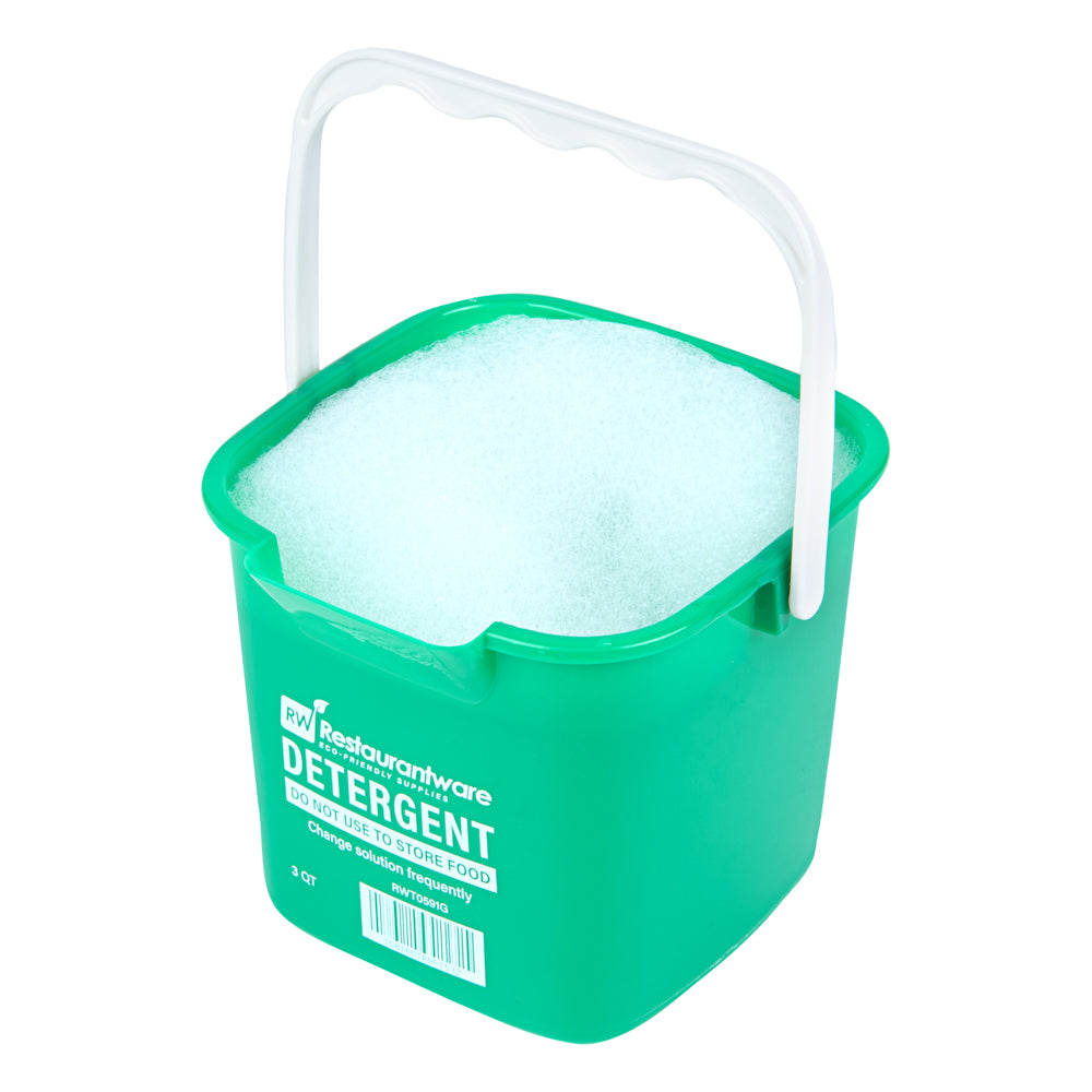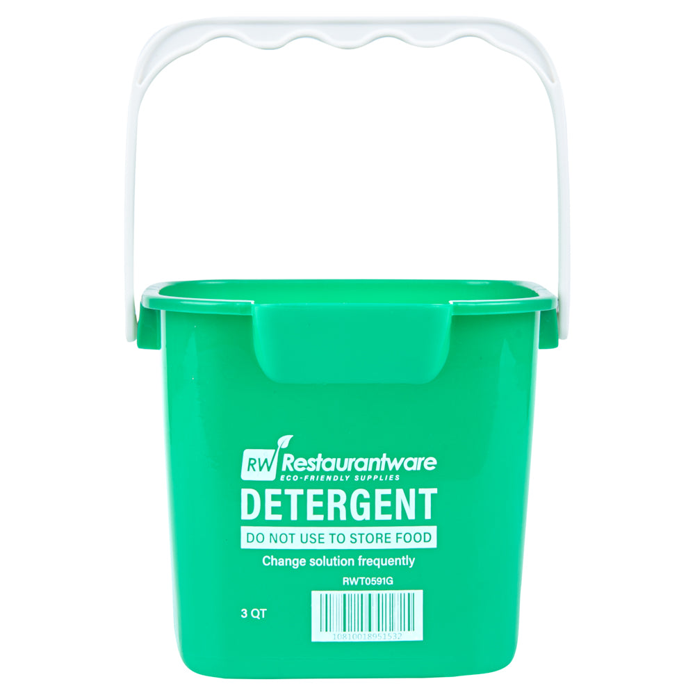 Enhance your cleaning efficiency with our RW Clean 3-quart Square Green Plastic Cleaning Buckets. These cleaning buckets are crafted from durable HDPE plastic, ensuring they withstand the demands of rigorous cleaning tasks. Interior graduations in quarts and liters make it easy to measure and mix solutions with precision in each bucket. Designed with a space-saving square shape, these plastic cleaning buckets maximize storage efficiency, making them ideal for busy commercial kitchens. Their bright green color aids in quick identification, preventing cross-contamination and streamlining your cleaning process. Equipped with an ergonomic plastic handle, these cleaning pails offer a comfortable grip, reducing hand fatigue during extended use. Built-in spout allows for controlled pouring, minimizing spills during disposal. Clearly labeled with “DETERGENT” and safety instructions, they help staff quickly identify contents and follow proper sanitation procedures. With a compact 3-quart capacity, these kitchen cleaning buckets are perfect for small to medium cleaning jobs, easily maneuvering around tight spaces. Measuring 7 inches in length by 6.75 inches in width by 6 inches in height, these buckets help enhance your janitorial operations. Sold in a 10 count box.