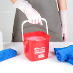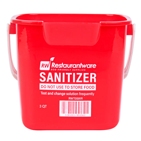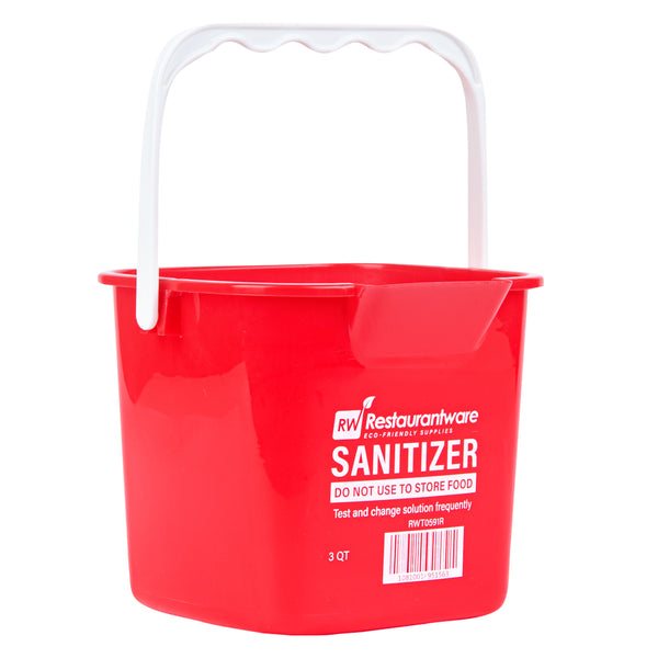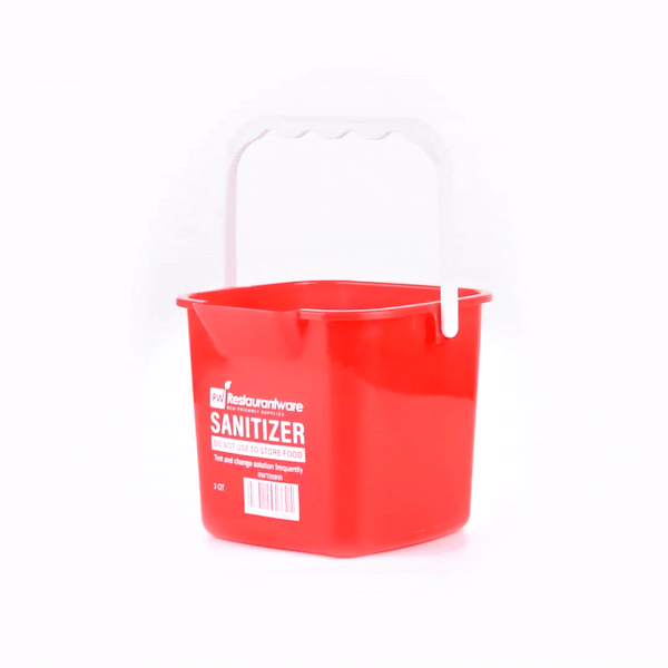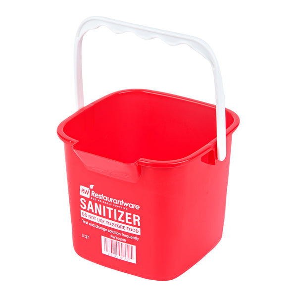 Boost your cleaning routine with our RW Clean 3-quart Square Red Plastic Cleaning Buckets. Built from tough HDPE plastic, these buckets are made to endure the demands of everyday sanitizing tasks. Markings inside these buckets in both quarts and liters assist with accurate dilution during cleaning tasks. Featuring a compact square shape, these plastic sanitizer buckets save space and fit neatly into storage areas ideal for fast-paced commercial kitchens. The bold red color enables fast visual recognition, helping to reduce the risk of cross-contamination and maintain a hygienic environment. Outfitted with an ergonomic plastic handle, each cleaning bucket ensures a steady and comfortable grip, minimizing strain during repeated use. An integrated spout supports precise, spill-free pouring after use. Clearly marked with “SANITIZER” and important safety messaging, they help team members quickly identify the correct bucket and follow sanitation guidelines. With a 3-quart capacity, these sanitizer buckets are well-suited for smaller sanitizing jobs and can easily access tight or narrow areas. Measuring 7 inches in length by 6.75 inches in width by 6 inches in height, these buckets are a smart addition to your cleaning supplies. Sold in a 10 count box.