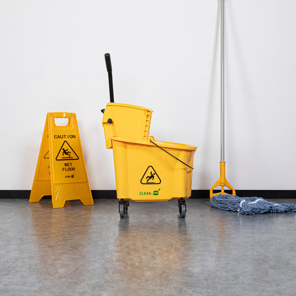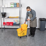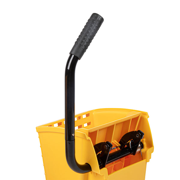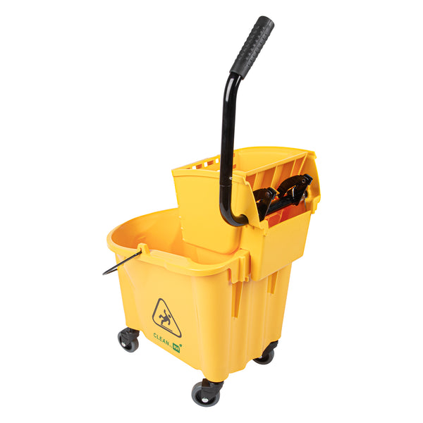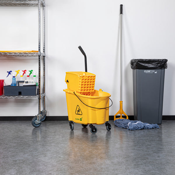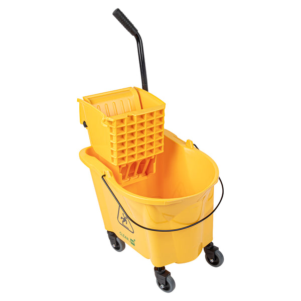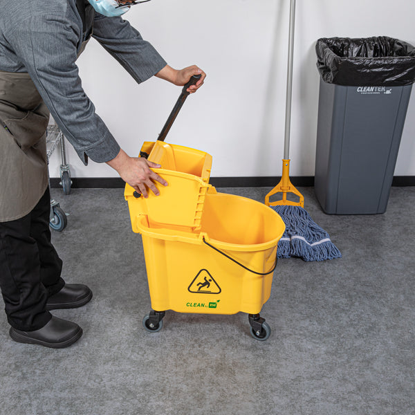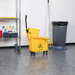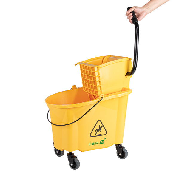 Simplify your cleaning tasks with our RW Clean 38-quart Yellow Plastic Mop Bucket. Made for making mopping floors efficient, this mop bucket comes with a side press wringer for hassle-free use and easy cleaning. As an all-in-one janitorial tool, this mop bucket with a wringer is ideal for any bustling restaurant and establishment with large spaces and floors. The bucket is designed to hold 38 quarts of clean water, while the attached mop bucket wringer squeezes out excess dirty water quickly and precisely. A must-have tool for every restaurant, cafe, bar, and hotel, this mop bucket keeps a sanitary and clean floor and dining area. These plastic mops measure 22.5 inches in length by 16.25 inches in width by 36.5 inches in height. Sold in a 1 count box.