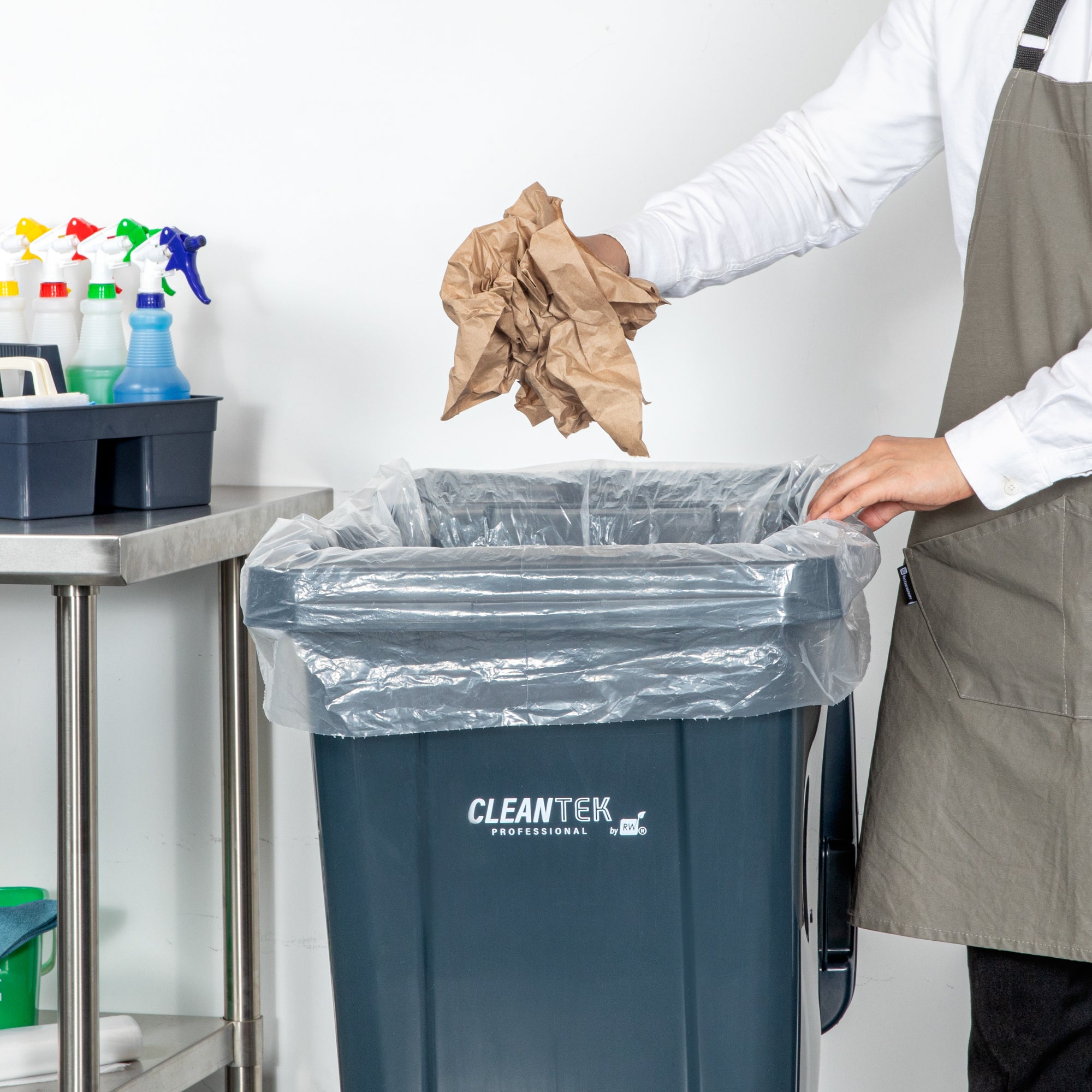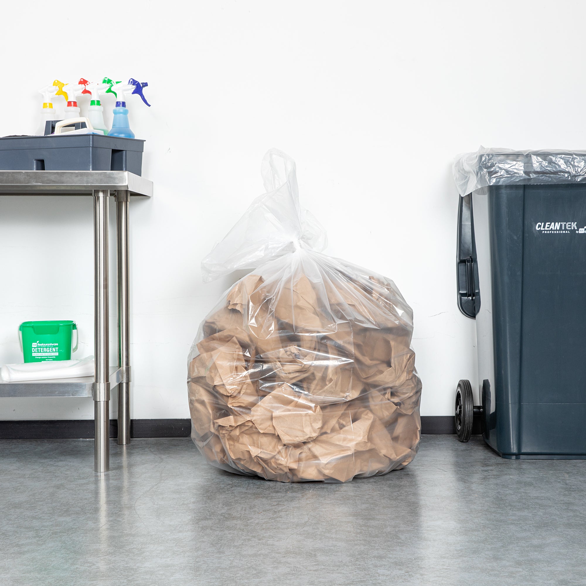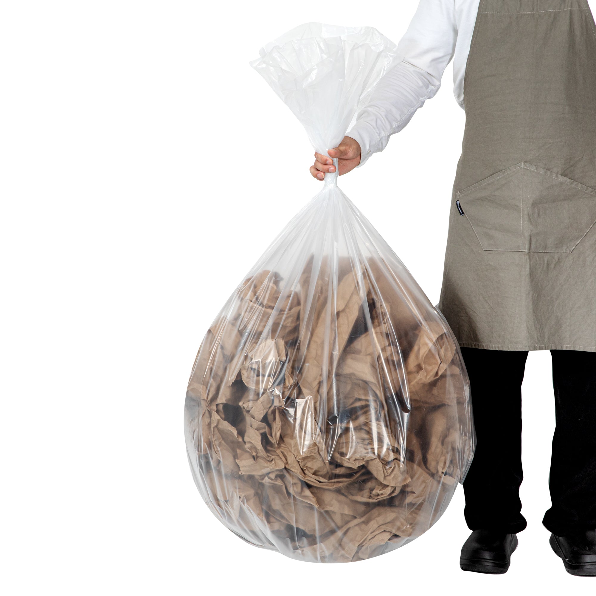 Prevent waste management headaches with heavy-duty trash liners. RW Clean Large Capacity Plastic Garbage Bags feature a robust 1.5 mil thickness, providing durability for effective waste management by accommodating bulky items without tearing. The star-sealed bottom ensures even weight distribution, making these plastic garbage bags virtually leak-proof and ideal for carrying wet trash. With a 55-gallon capacity and dimensions of 38 inches in length and 58 inches in width, these LDPE bags support large foodservice waste loads efficiently. The clear design allows for easy content identification, assisting in waste sorting and compliance checks. Equip your facility with these reliable waste management solutions to enhance operations. Each order includes 100 RW Clean Large Capacity Plastic Garbage Bags.
