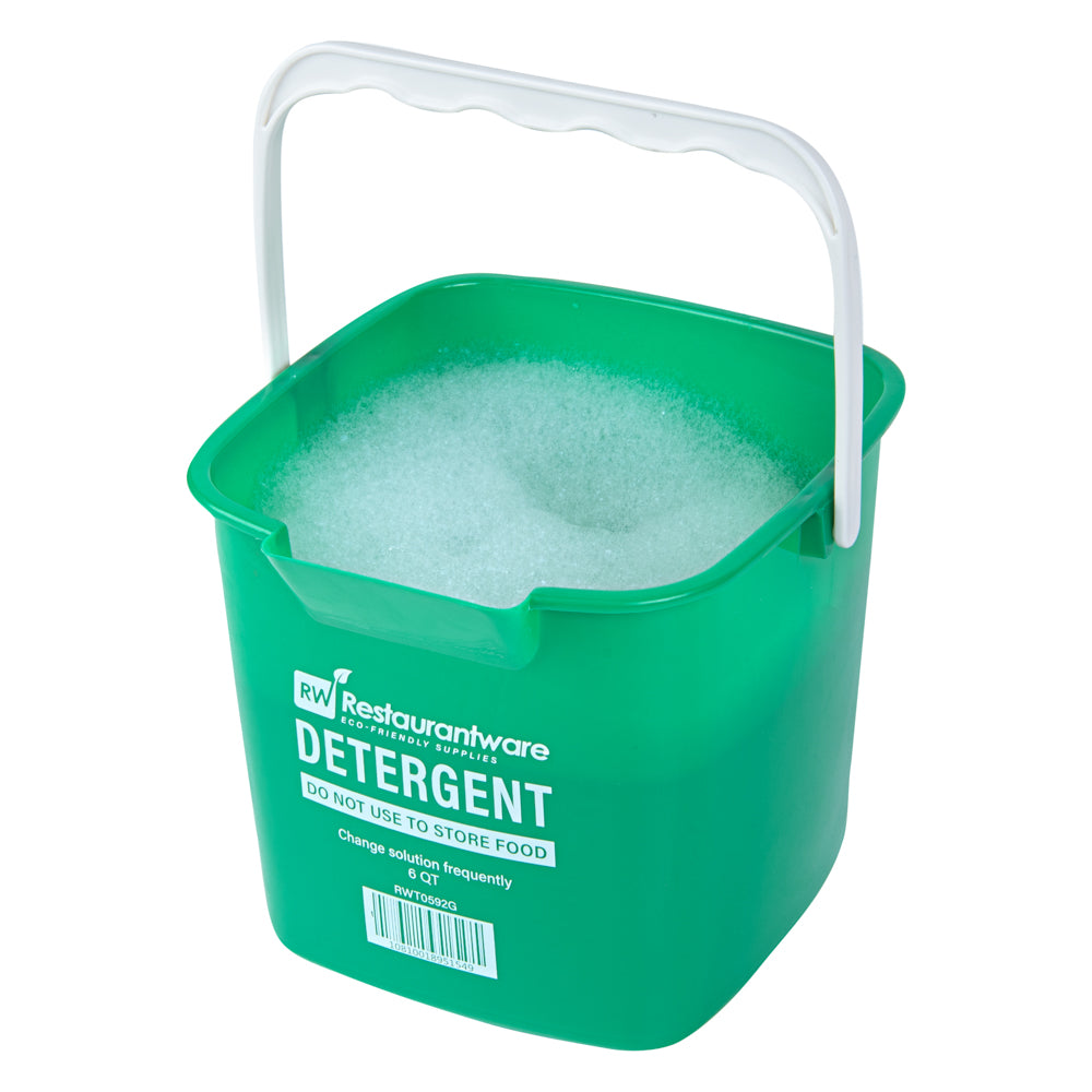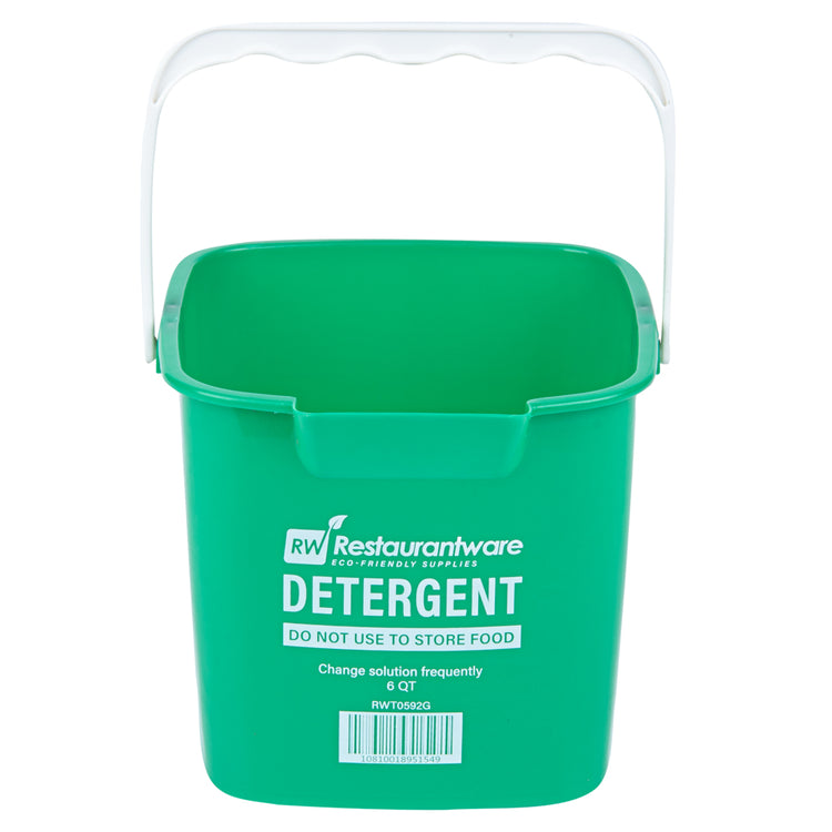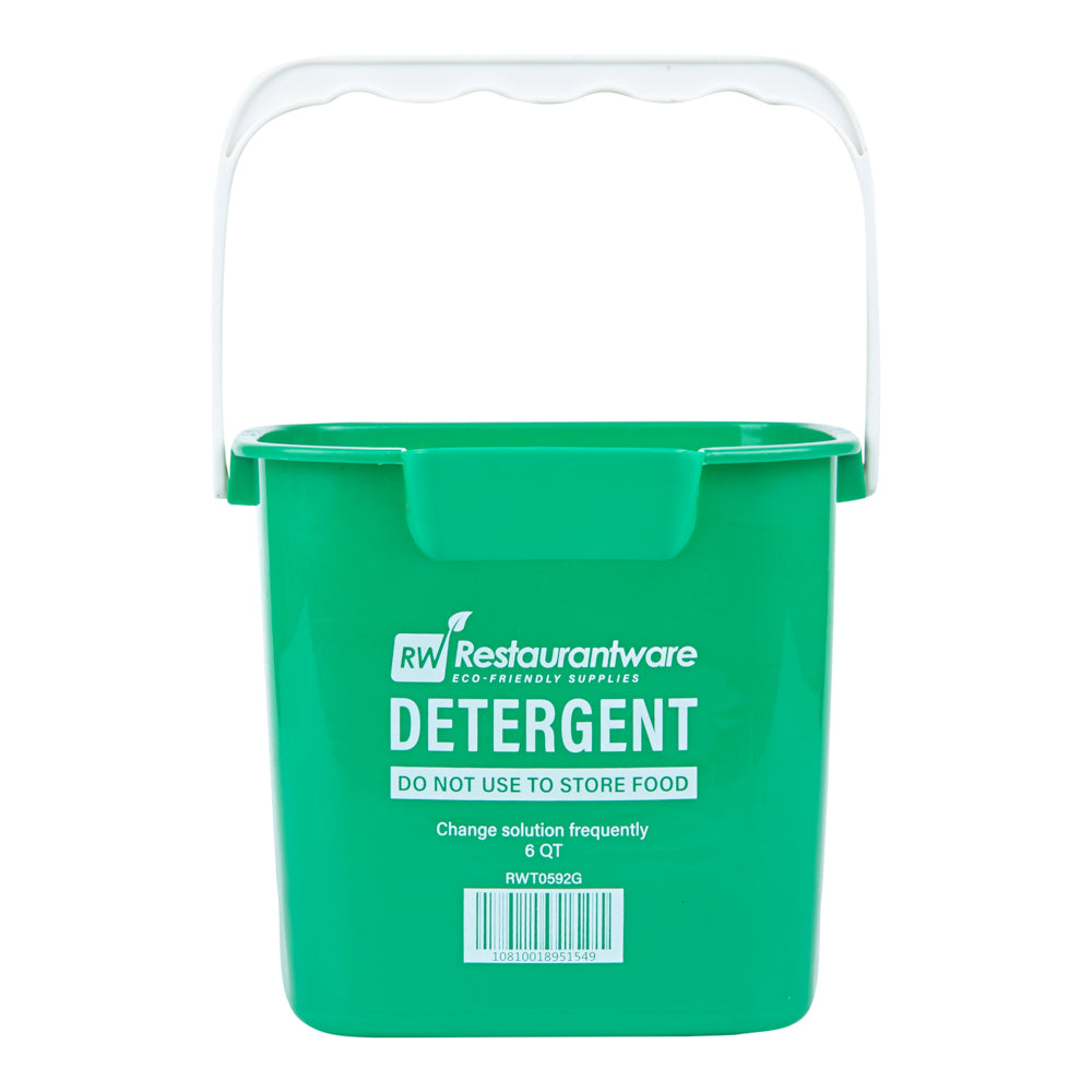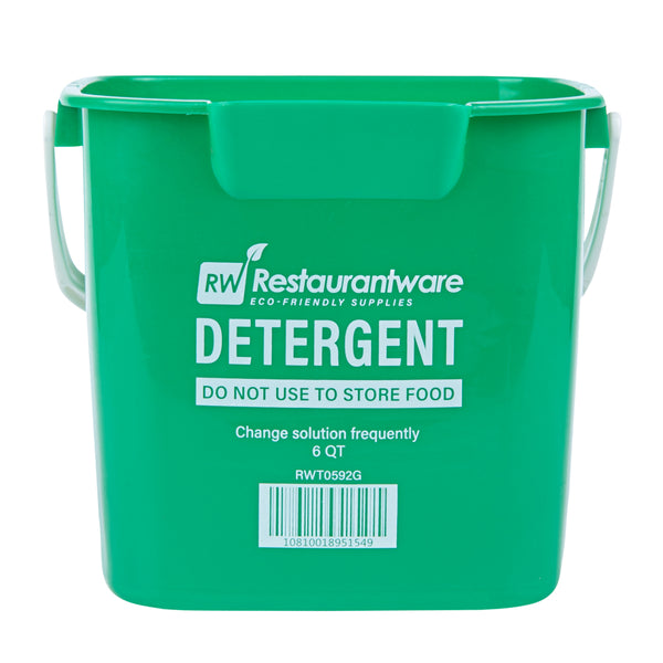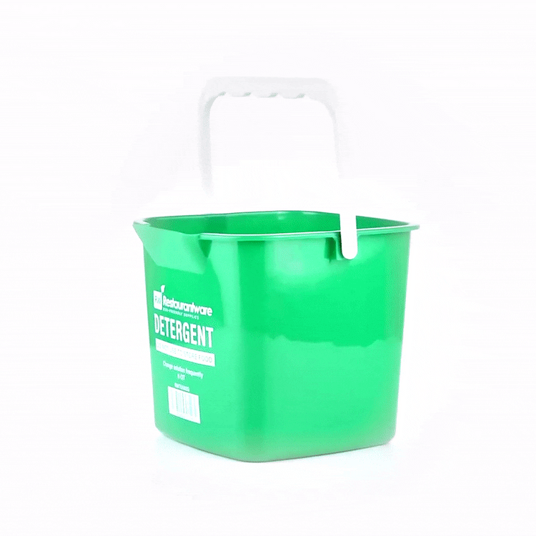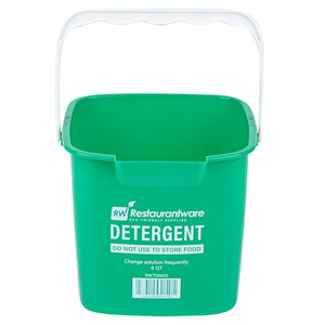 Enhance your back-of-house efficiency with our RW Clean 6-quart Square Green Plastic Cleaning Bucket. Made from HDPE plastic, this bucket is designed to handle tough cleaning demands in commercial settings. The square design provides efficient storage and stackability, saving space in crowded janitorial closets. Its bold green color allows for quick identification, helping to minimize the risk of cross-contamination. Featuring an ergonomic plastic handle, this cleaning bucket offers a secure grip for easy transport. A built-in spout ensures controlled pouring, reducing mess during disposal. Interior graduations in quarts and liters help ensure precise measurement for larger volume solutions. Clearly labeled with “DETERGENT” and safety instructions, it helps staff follow proper procedures with ease. With a spacious 6-quart capacity, this bucket is ideal for handling larger cleaning tasks. Measuring 8.5 inches in length by 8.5 inches in width by 7.25 inches in height. Sold in a 1 count box.