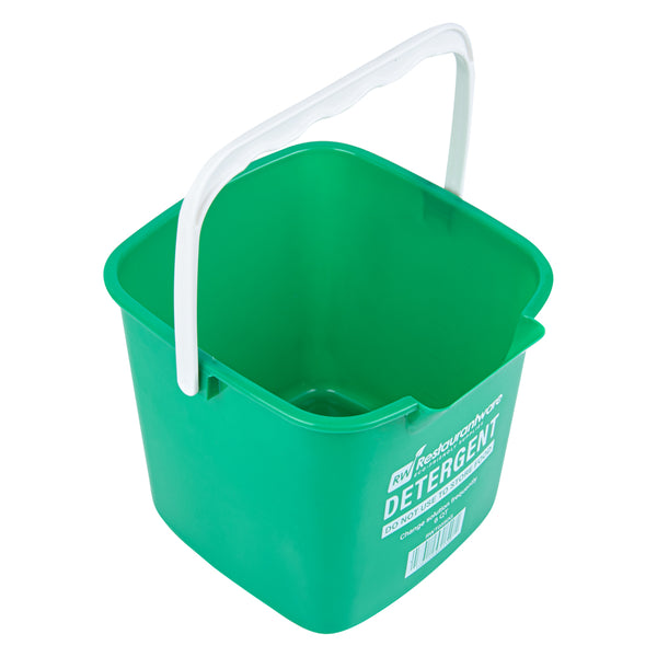 Enhance your back-of-house efficiency with our RW Clean 6-quart Square Green Plastic Cleaning Buckets. Made from HDPE plastic, these buckets are designed to handle tough cleaning demands in commercial settings. The square design provides efficient storage and stackability, saving space in crowded janitorial closets. Their bold green color allows for quick identification, helping to minimize the risk of cross-contamination. Featuring an ergonomic plastic handle, each cleaning bucket offers a secure grip for easy transport. A built-in spout ensures controlled pouring, reducing mess during disposal. Interior graduations in quarts and liters help ensure precise measurement for larger volume solutions in each bucket. Clearly labeled with “DETERGENT” and safety instructions, they help staff follow proper procedures with ease. With a spacious 6-quart capacity, these buckets are ideal for handling larger cleaning tasks. Measuring 8.5 inches in length by 8.5 inches in width by 7.25 inches in height. Sold in a 10 count box.