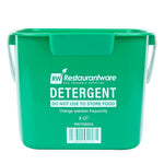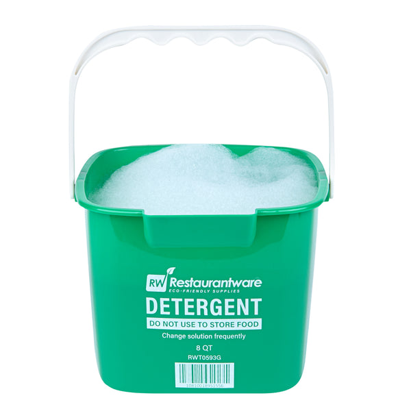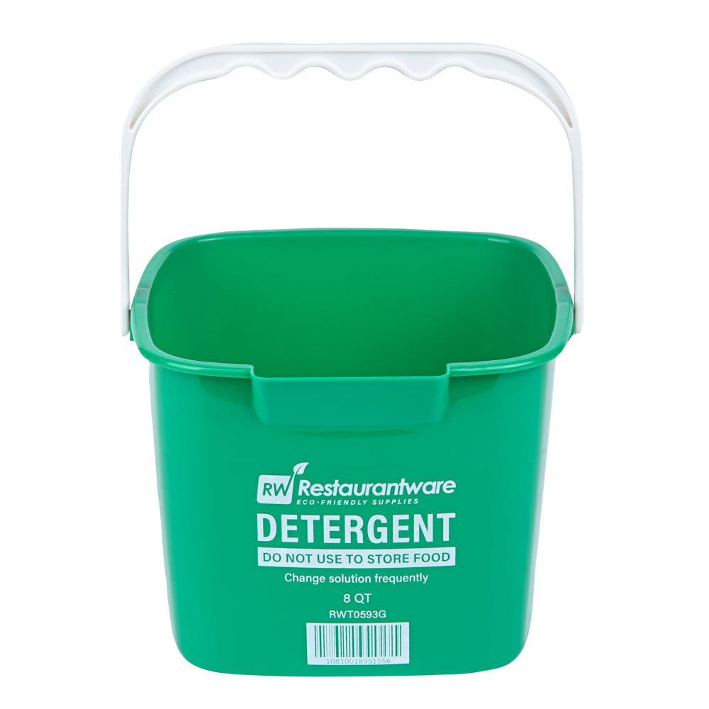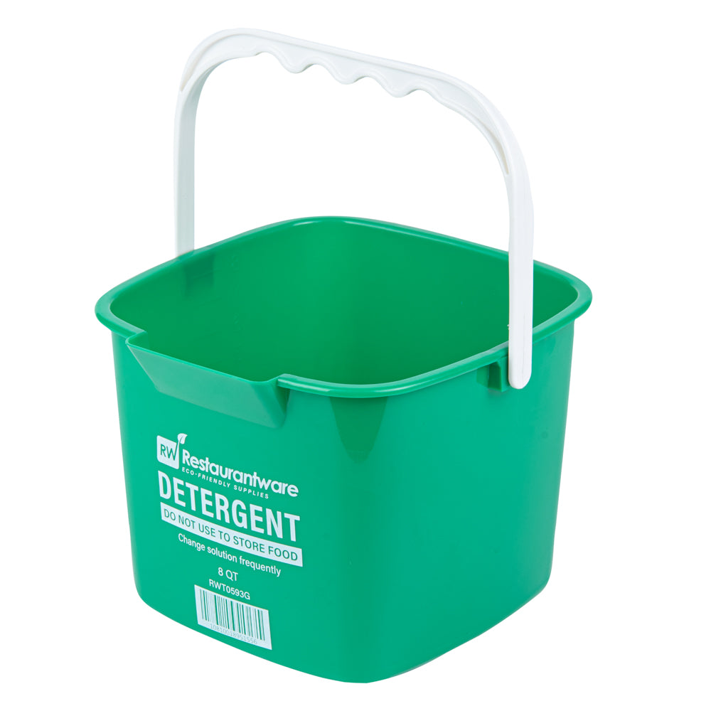 Simplify your cleaning routine with our RW Clean 8-quart Square Green Plastic Cleaning Buckets. These heavy-duty buckets feature interior graduations in quarts and liters, making it easy to measure and mix cleaning solutions accurately in each one. Constructed from durable HDPE plastic, they’re designed to withstand repeated use in fast-paced commercial kitchens. The square shape maximizes storage space and stacks efficiently. Their bright green color helps staff quickly identify them for detergent use, reducing the risk of cross-contamination. Equipped with an ergonomic plastic handle, each bucket offers a comfortable grip during transport. A built-in spout allows for neat, controlled pouring with minimal mess. Clearly labeled with “DETERGENT” and safety instructions, they help streamline back-of-house operations. With a generous 8-quart capacity, these buckets handle larger cleaning jobs with ease. Measuring 9.75 inches in length by 9.75 inches in width by 7.5 inches in height. Sold in a 10 count box.
