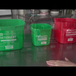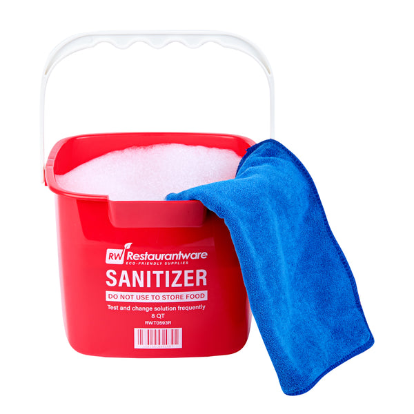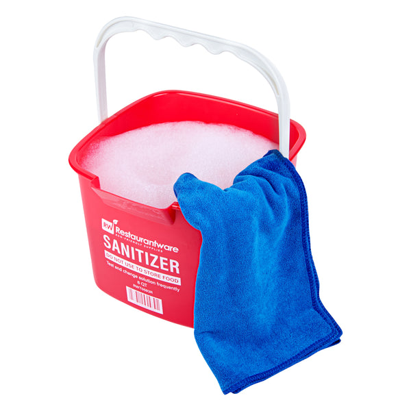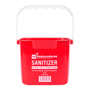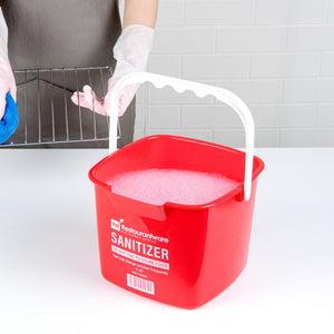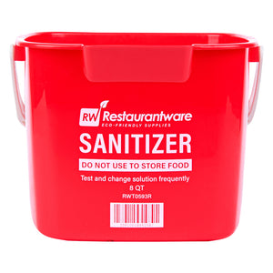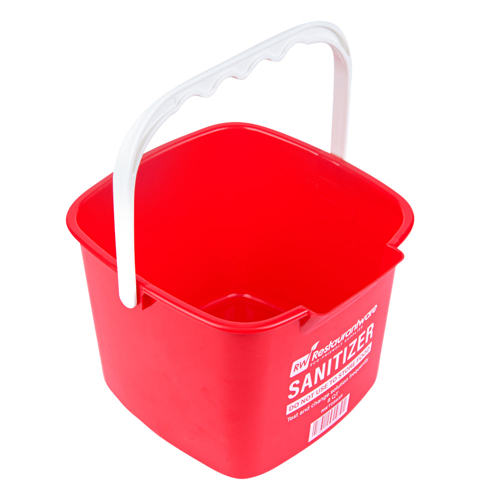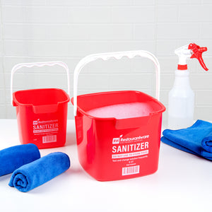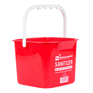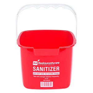Upgrade your sanitizing process with our RW Clean 8-quart Square Red Plastic Cleaning Bucket. Designed with interior quart and liter graduations, this bucket supports accurate measuring for sanitizing solutions in busy foodservice settings. Made from durable HDPE plastic, it stands up to frequent use in high-volume environments. Its square shape is ideal for efficient storage and organization. The bold red color makes it easy to identify for sanitizer use, helping prevent cross-contamination. Outfitted with an ergonomic plastic handle, this cleaning bucket offers a comfortable grip during transport. A built-in spout enables smooth and controlled pouring. Clearly labeled with “SANITIZER” and essential safety messaging, it promotes compliance with cleaning protocols. With an 8-quart capacity, this bucket is great for handling bulk sanitizing needs. Measuring 9.75 inches in length by 9.75 inches in width by 7.5 inches in height. Sold in a 1 count box.