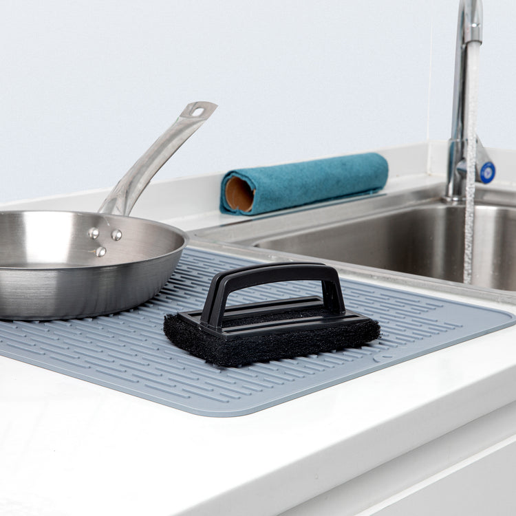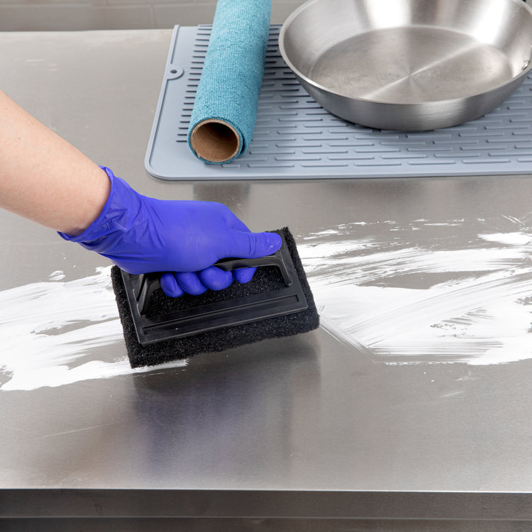 Take your cleaning up a notch with this Multi-Purpose Heavy Duty Scouring Pad with Handle from the RW Clean Collection. Equipped with a conveniently built-in handle, this nylon scouring pad provides a secure grip to help you effortlessly scrub away baked-on grime and stubborn grease. In addition, this plastic handle provides a powerful cleaning action to help you take control over big spills and messes. With this heavy-duty scouring pad, you can easily scrub away dirt and remove build-up on kitchen tools, stoves, grills, ovens, floors, bathroom surfaces, and more! Ideal for kitchens, bars, cafeterias, and other commercial foodservice establishments, this scrub pad is constructed from tightly packed nylon fibers that are designed to resist tearing and breaking. This multi-purpose black scouring pad with handle is sold in a 1 count box.
