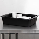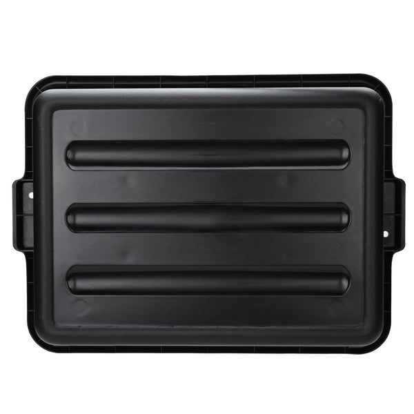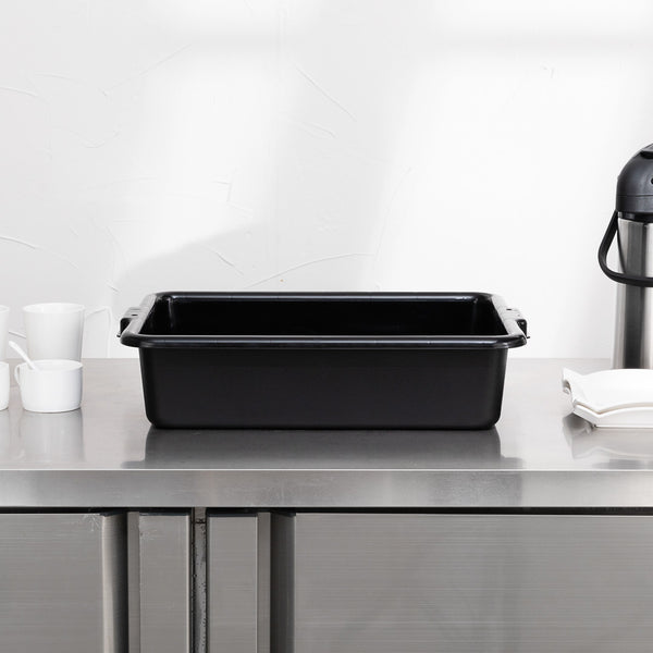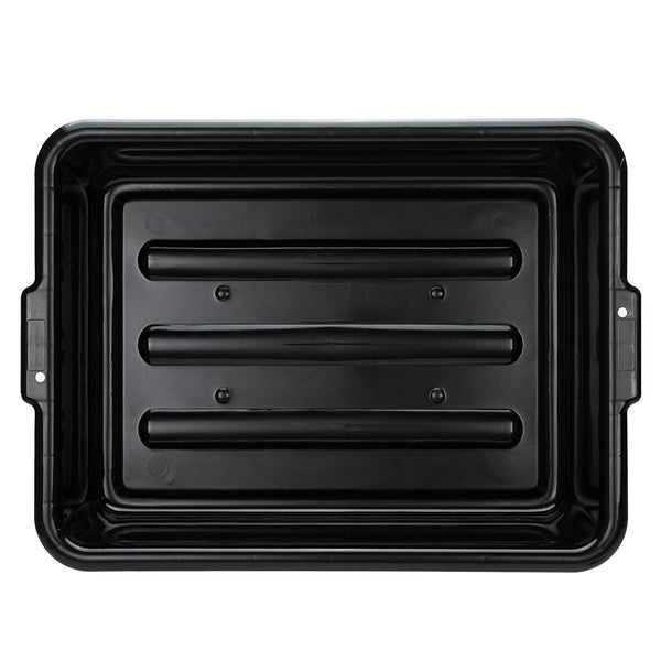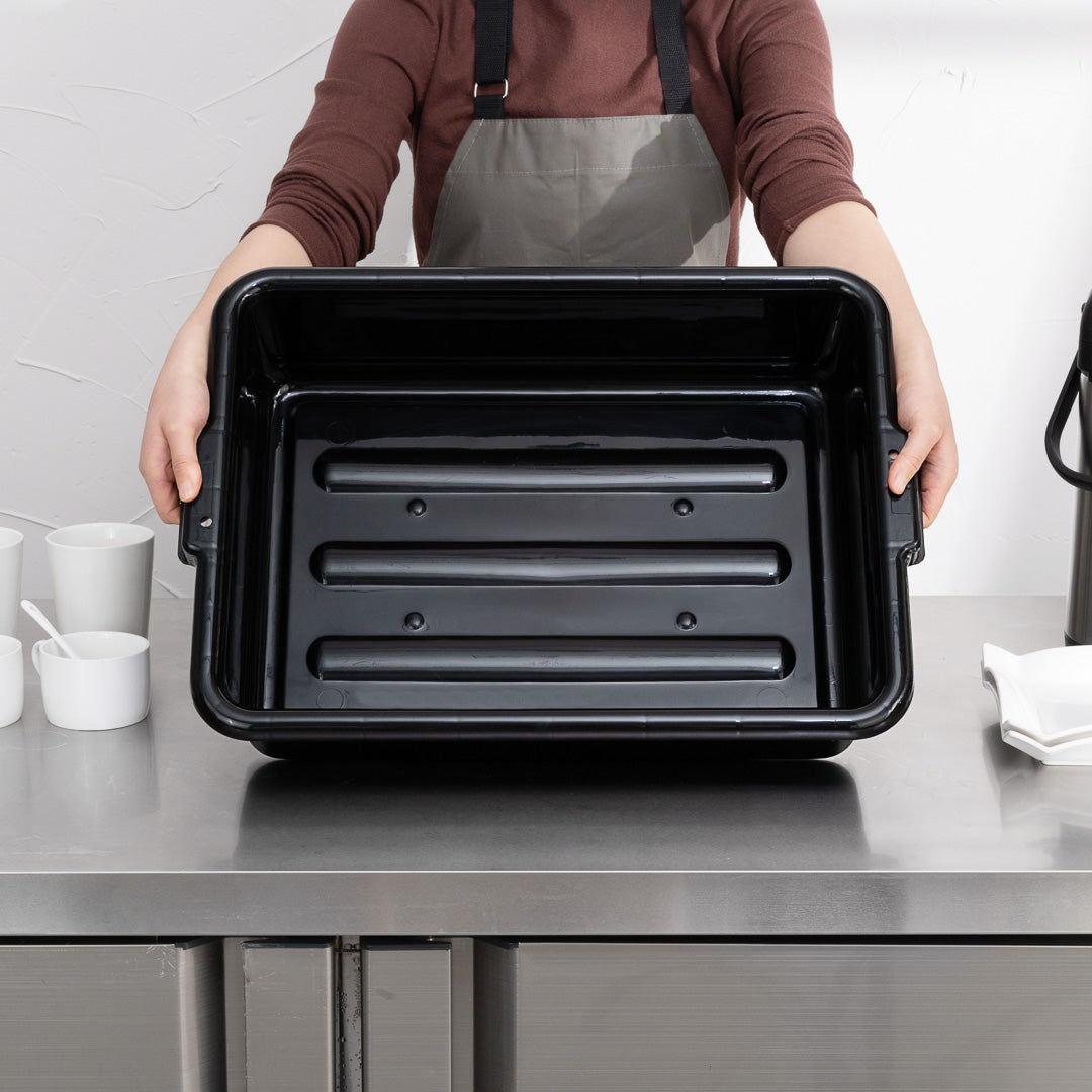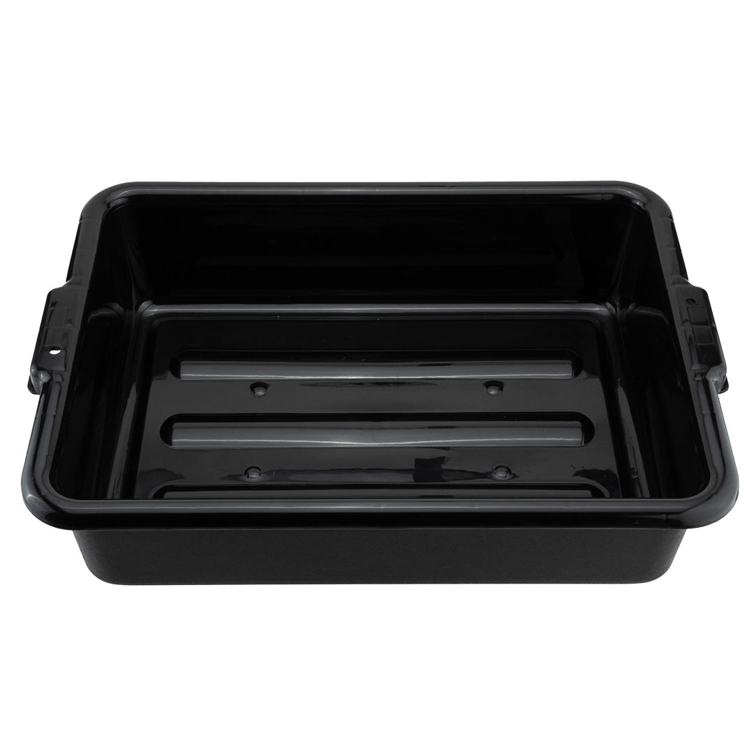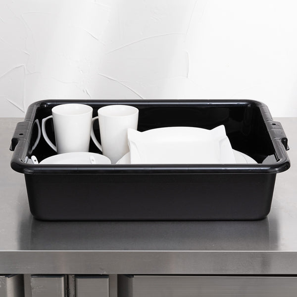 Quickly clean up dirty tables or workspaces with this RW Clean Black Plastic Bus Tub. Featuring sturdy and easy-to-grip handles, this premium plastic bus tub creates an easy way for staff to transport dirty dishes, glassware, silverware, and cookware. The rectangular shape provides plenty of room to stack multiple piles of dishes, while the durable plastic construction expertly resists cracking or breaking under the weight of heavy dinnerware. Featuring a black finish and a low-profile design, this heavy duty bus tub is great for discreetly clearing and bussing tables in restaurants, cafeterias, and other foodservice establishments. Each of these commercial-use restaurant bus tubs measures 21.25 inches in length by 15.75 inches in width and has a total depth of 4.75 inches. The inside of these bus tubs measures 18.5 inches long by 14.6 inches wide. Pair this bus tub with its coordinating lid (SKU: RWT0472-12) to complete your cleanup! Sold in a 12 count box. Lids sold separately.