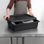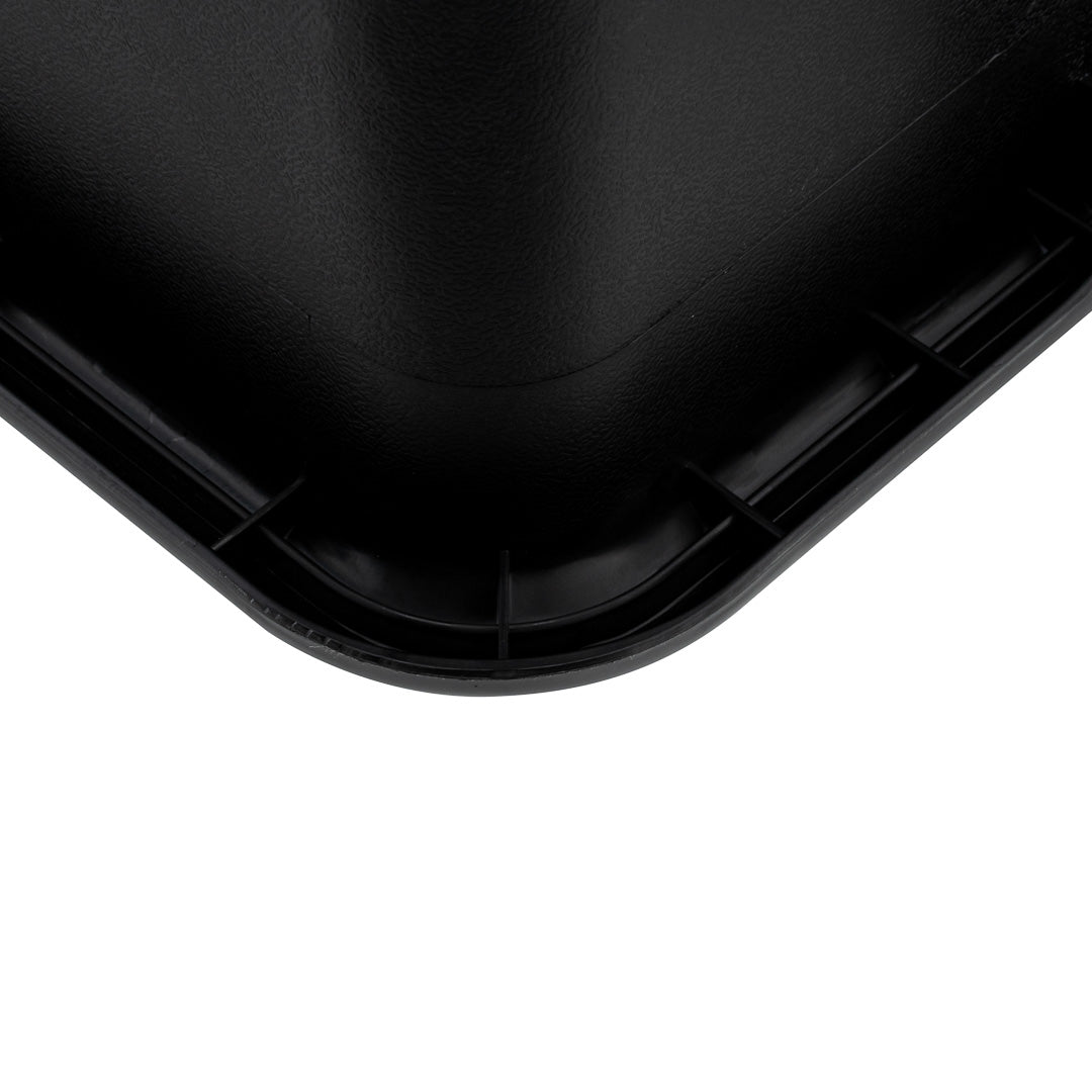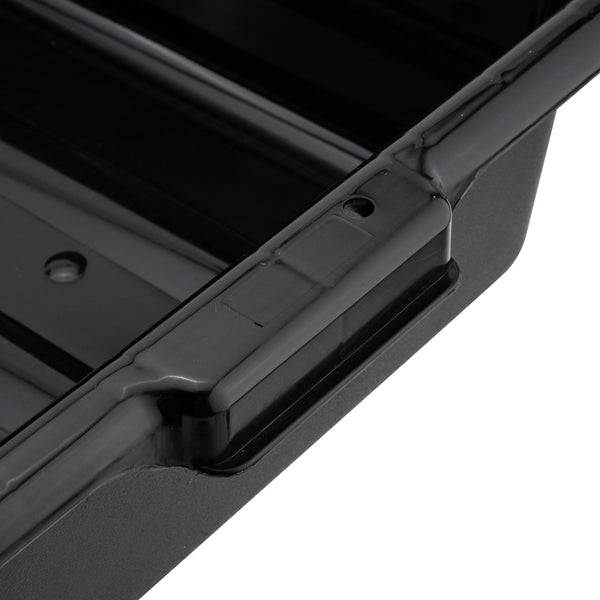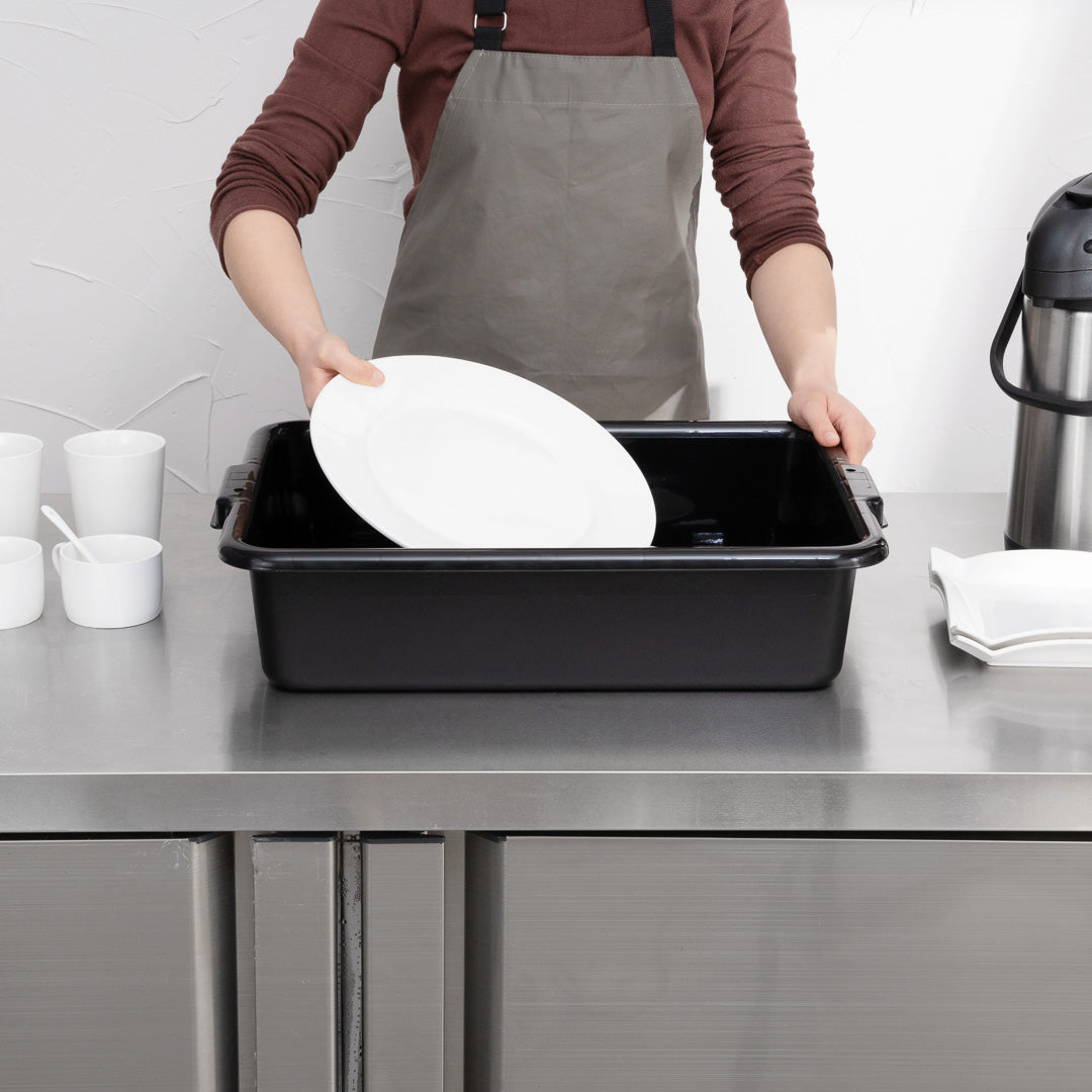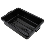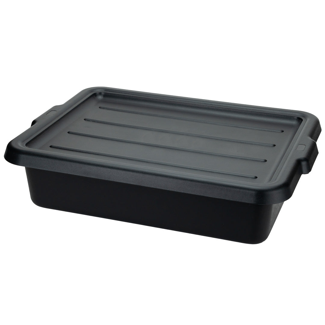 Quickly clean up dirty tables or workspaces with this RW Clean Black Plastic Bus Tub. Featuring sturdy and easy-to-grip handles, this premium plastic bus tub creates an easy way for staff to transport dirty dishes, glassware, silverware, and cookware. The rectangular shape provides plenty of room to stack multiple piles of dishes, while the durable plastic construction expertly resists cracking or breaking under the weight of heavy dinnerware. Featuring a black finish and a low-profile design, this heavy duty bus tub is great for discreetly clearing and bussing tables in restaurants, cafeterias, and other foodservice establishments. Each of these commercial-use restaurant bus tubs measures 21.25 inches in length by 15.75 inches in width and has a total depth of 4.75 inches. The inside of these bus tubs measures 18.5 inches long by 14.6 inches wide. Pair this bus tub with its coordinating lid (SKU: RWT0472-12) to complete your cleanup! Sold in a 12 count box. Lids sold separately.