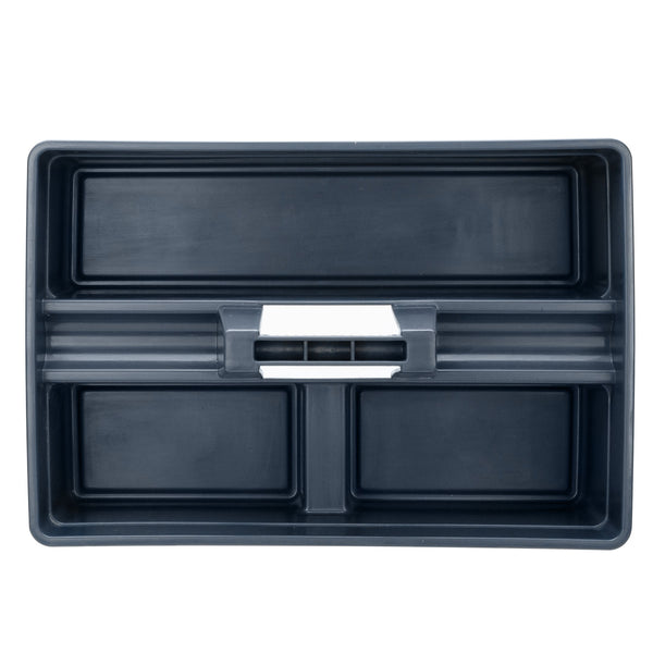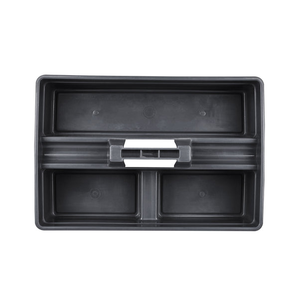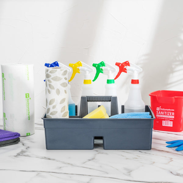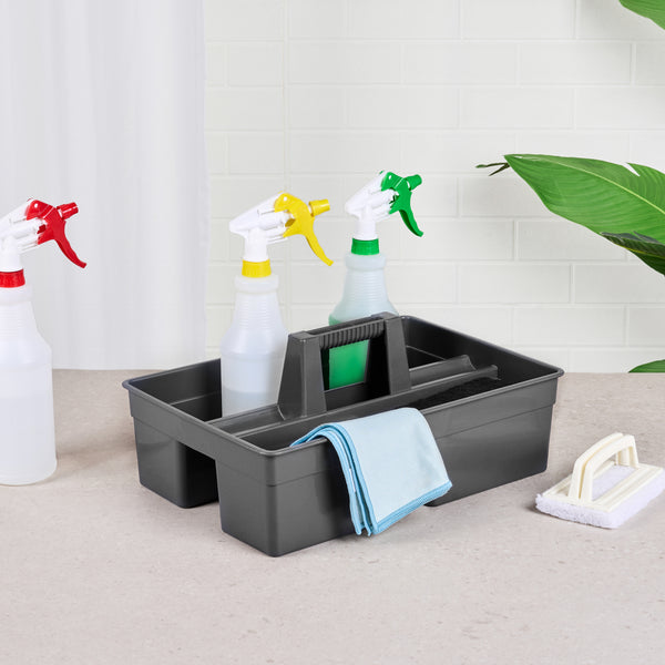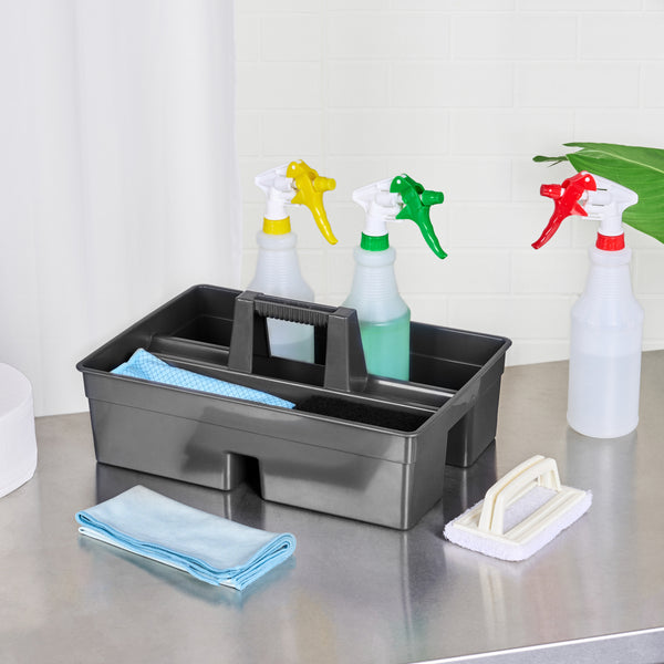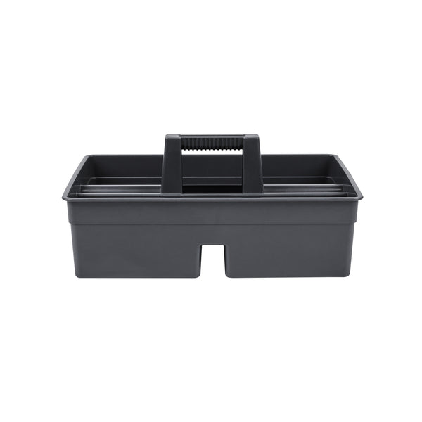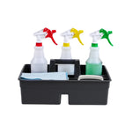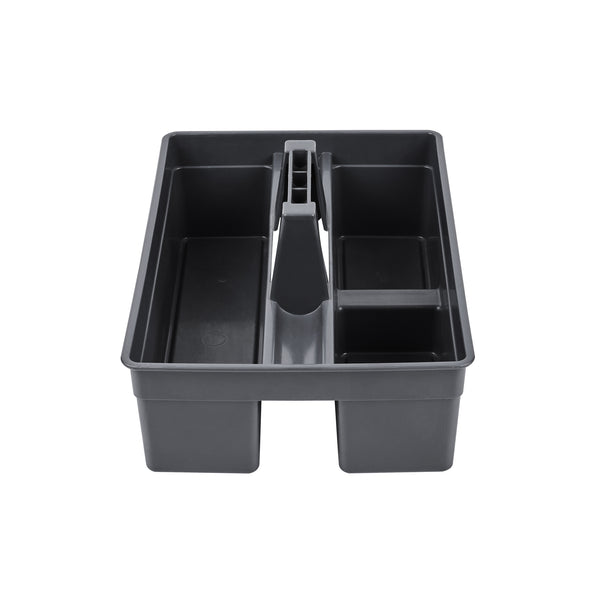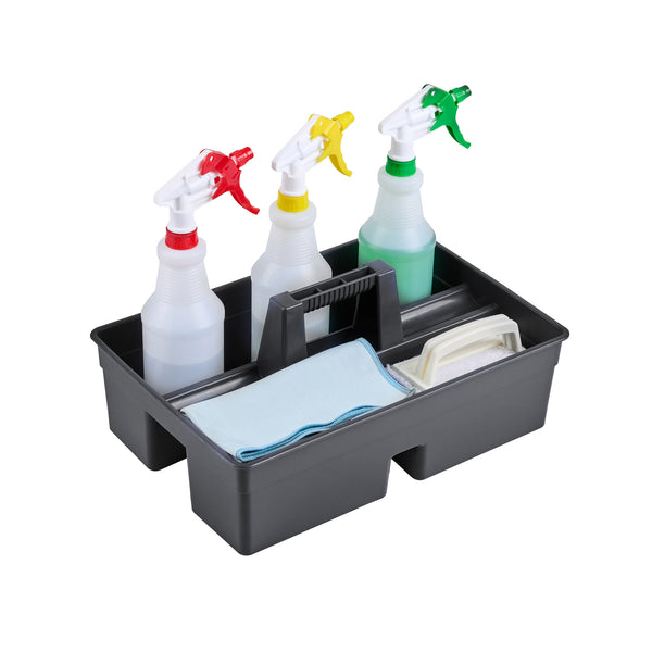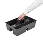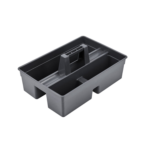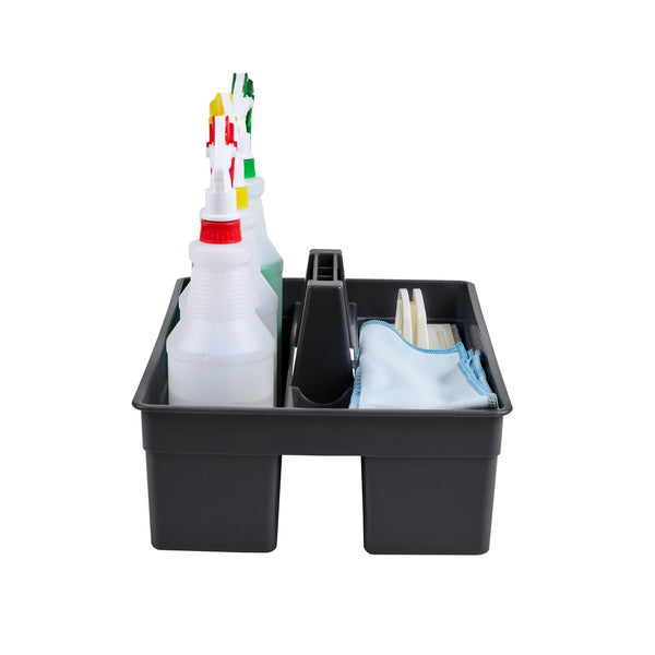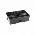 Easily carry your cleaning supplies with this RW Clean Black Plastic Cleaning Caddy. Equipped with three convenient compartments, this cleaning carry caddy makes it easy to separate, organize, and transport your cleaning supplies! The specially molded, easy-to-grip handle provides a comfortable way to lift and carry your janitorial supplies, while the large, rectangular base reduces the risk of tipping and falling. Made from durable polypropylene, this janitorial caddy is built to withstand everyday usage at restaurants, hotels, offices, and other commercial establishments. This three-compartment plastic cleaning caddy measures 16 inches in length by 10.5 inches in width. Featuring a solid black finish, this cleaning caddy can be discreetly stowed away without creating an eyesore. Sold in a 1 count box.