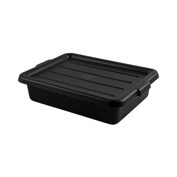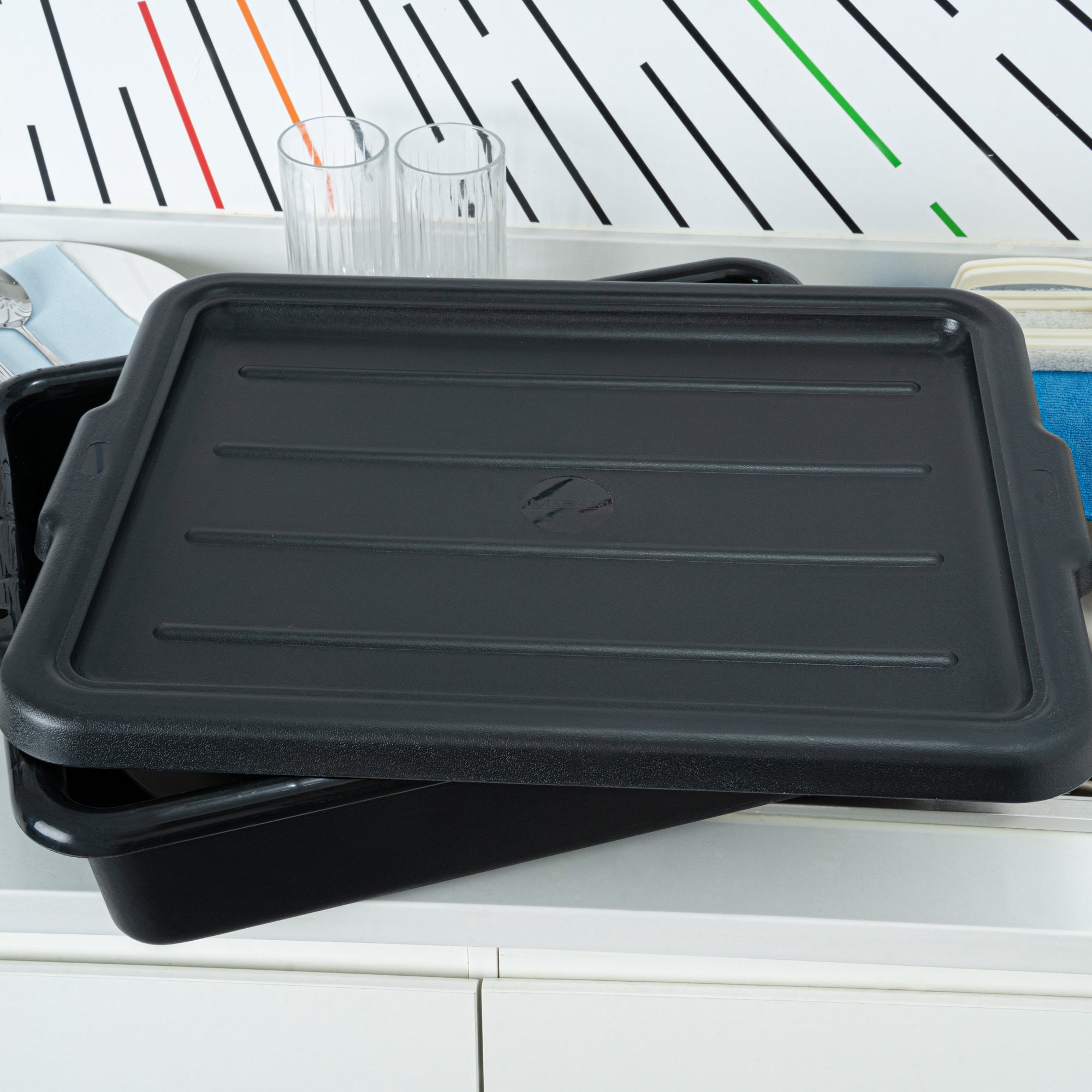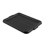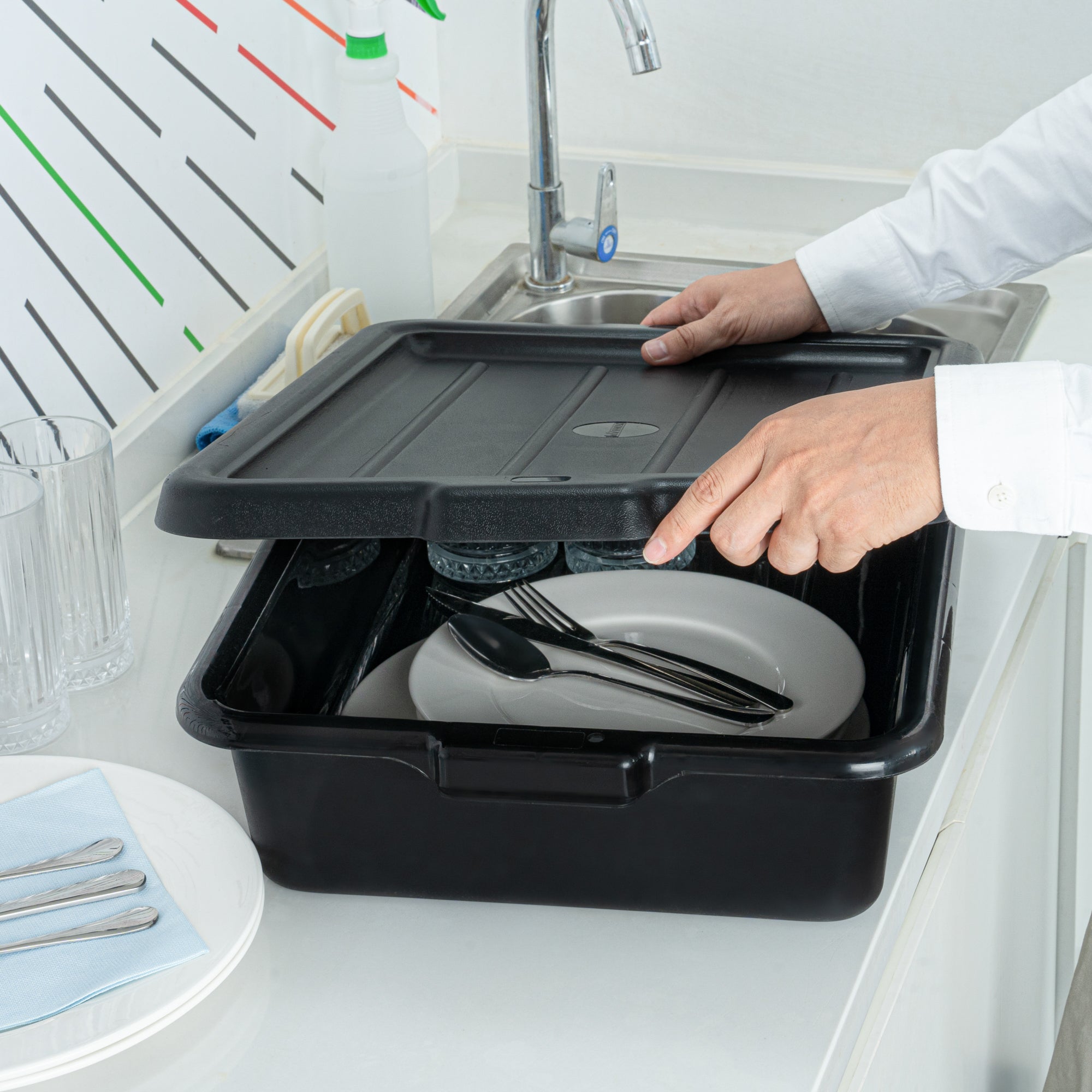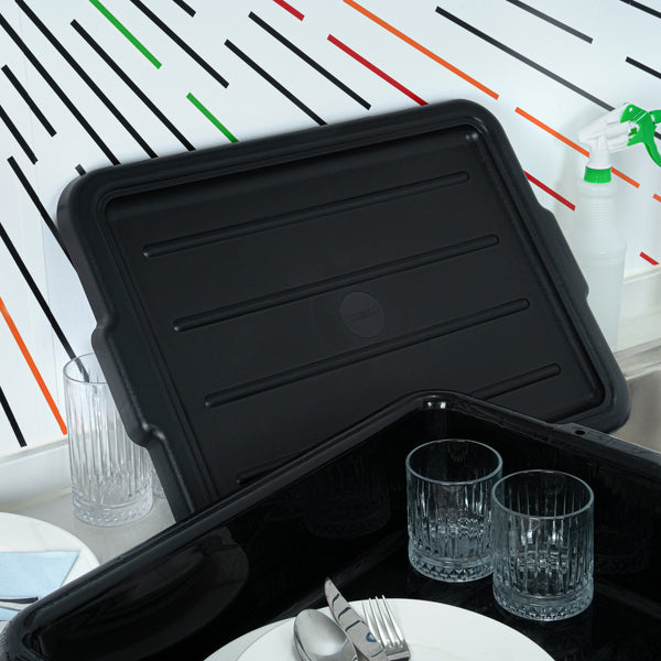 Pair these RW Clean Black Plastic Lids with our coordinating bus tubs to enhance and streamline your cleanup. Designed to fit onto both sizes of our Easy Grip Bus Tubs (SKUs: RWT0470 and RWT0471), these lids make it easy to transport dirty dishes or glassware without creating an additional mess. The built-in handles provide an easy way to secure and carry the lid, while the lid's low-profile design creates a simple and discreet way to bus your tables. Manufactured from durable and crack-resistant plastic, these restaurant bus tub covers are easy to clean and built to withstand long-term commercial use. Pair our selection of heavy-duty bus tubs with lids to create an effective solution for clearing and resetting your tables. Sold in a 1 count box. Bus tubs are sold separately.