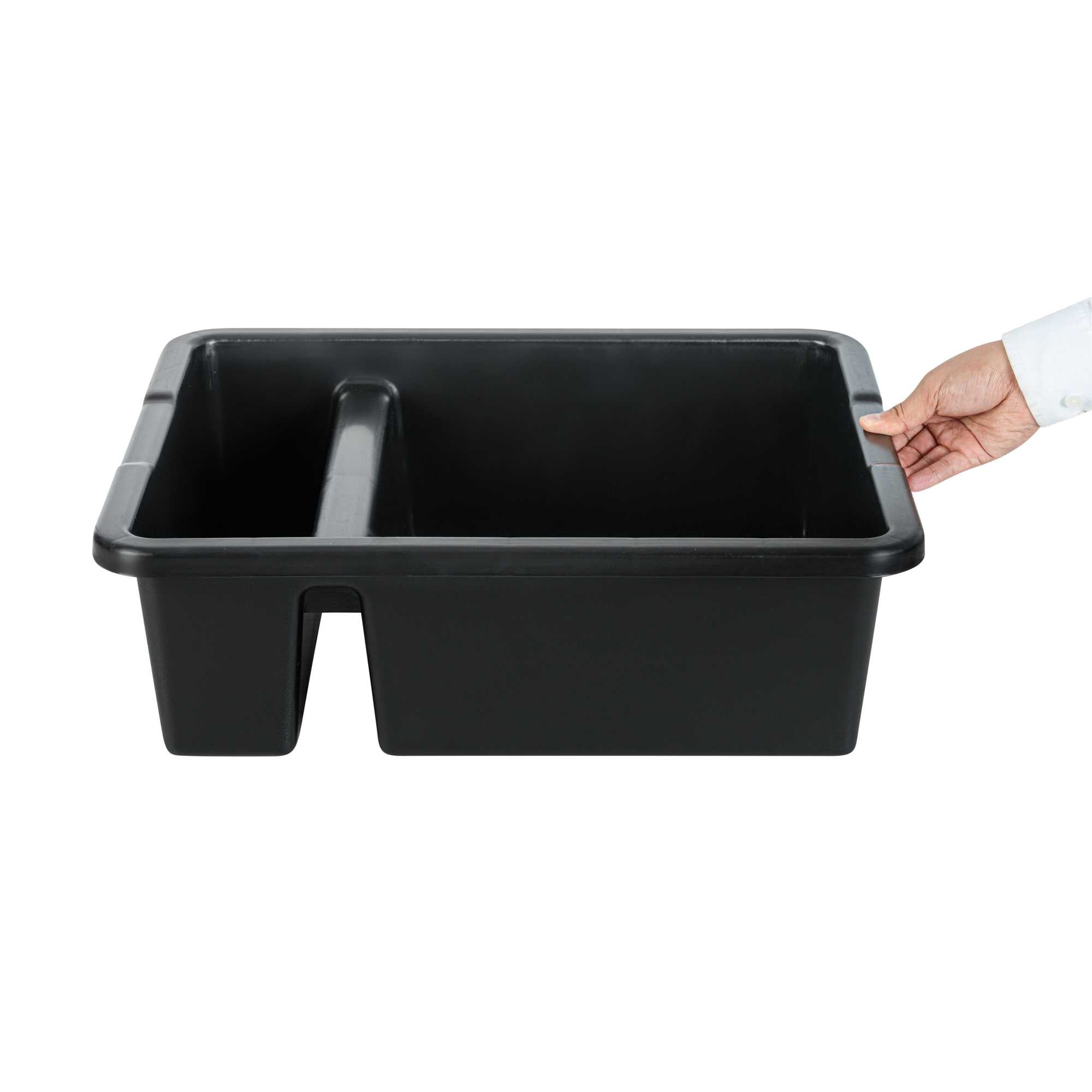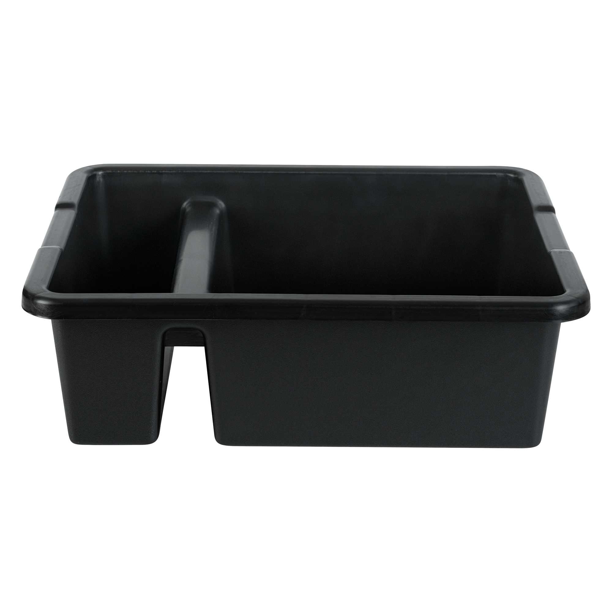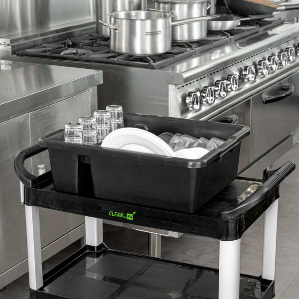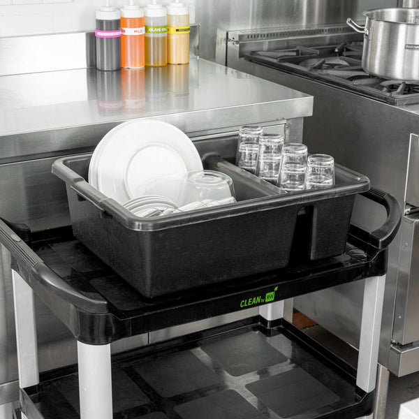 Streamline your kitchen operations with our RW Clean Black Polypropylene Bus Tubs / Bus Boxes. The black bus box features a durable plastic construction, perfect for handling even the heaviest dinnerware. This black bus box is designed with two compartments that streamline sorting, enabling quick service and efficient cleanup in bustling foodservice settings. The black color helps conceal stains, maintaining a clean and professional appearance during transport or storage. With a stackable design, this stackable bus tub optimizes storage space, while its sturdy reinforced handles ensure safe and secure carrying. Its 21.2-inch length, 16.7-inch width, and 7.08-inch height easily accommodate large stacks of dishware, making it an essential plastic bus tub for any busy restaurant or catering service. Sold in a 10 count box.