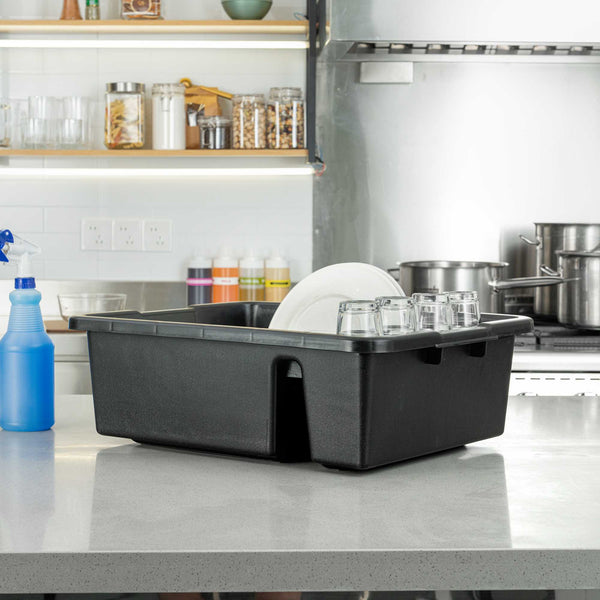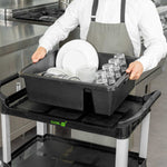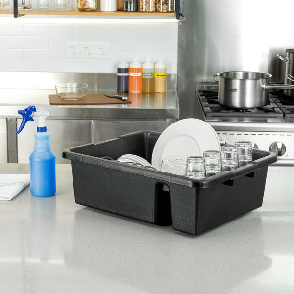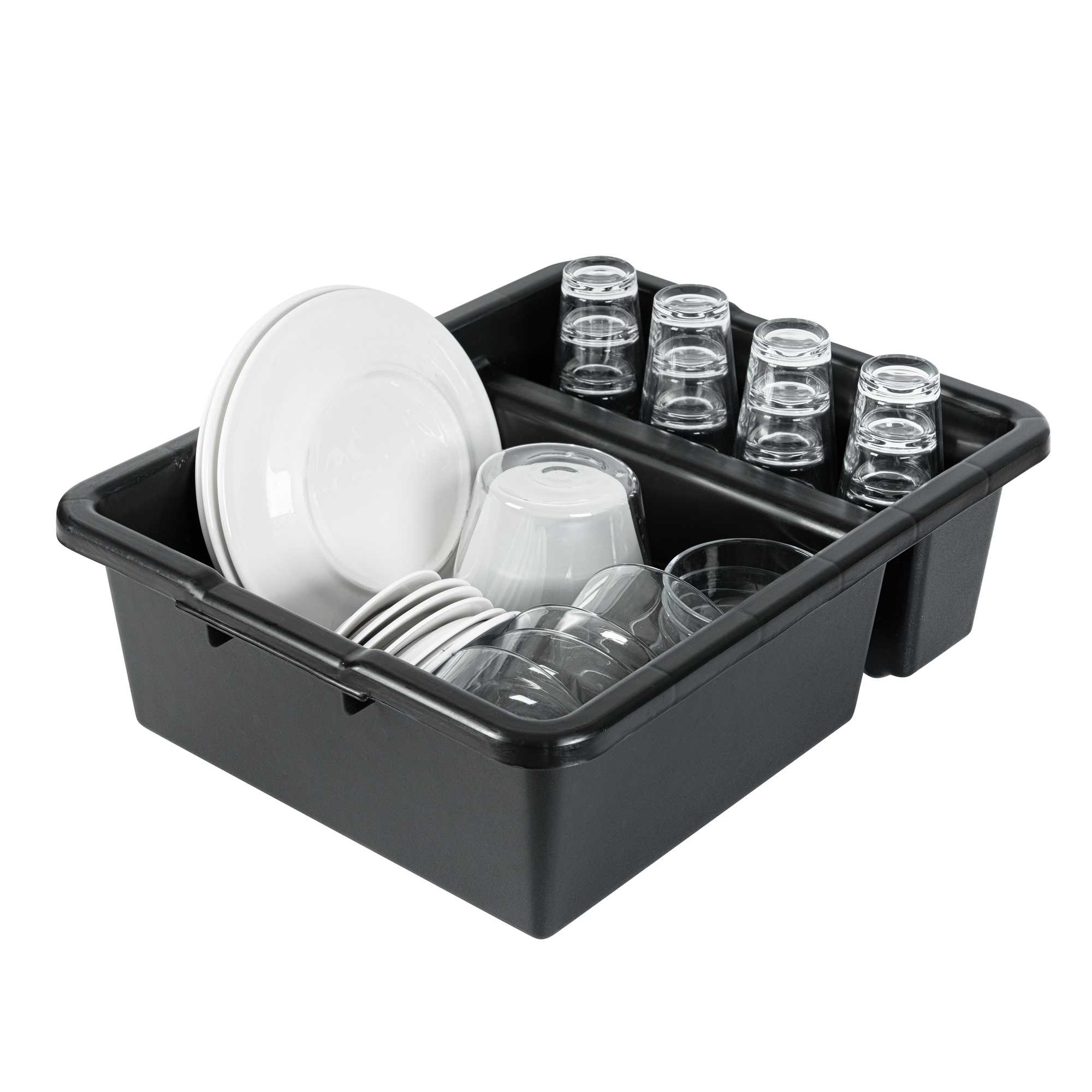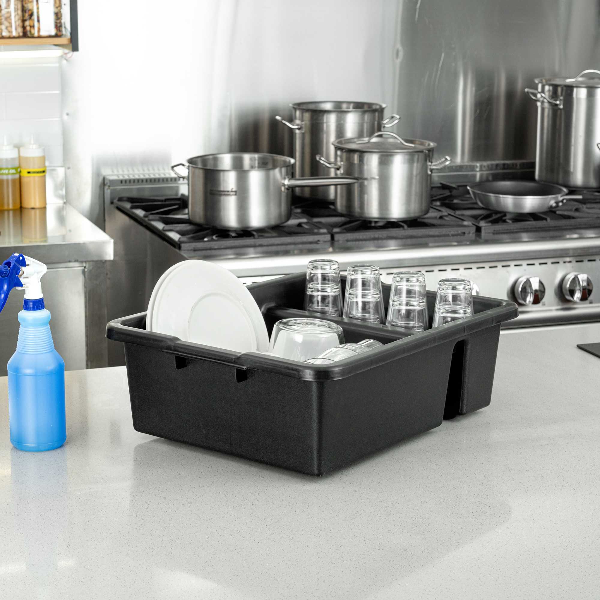 Streamline your kitchen operations with our RW Clean Black Polypropylene Bus Tubs / Bus Boxes. The black bus box features a durable plastic construction, perfect for handling even the heaviest dinnerware. This black bus box is designed with two compartments that streamline sorting, enabling quick service and efficient cleanup in bustling foodservice settings. The black color helps conceal stains, maintaining a clean and professional appearance during transport or storage. With a stackable design, this stackable bus tub optimizes storage space, while its sturdy reinforced handles ensure safe and secure carrying. Its 21.2-inch length, 16.7-inch width, and 7.08-inch height easily accommodate large stacks of dishware, making it an essential plastic bus tub for any busy restaurant or catering service. Sold in a 10 count box.
