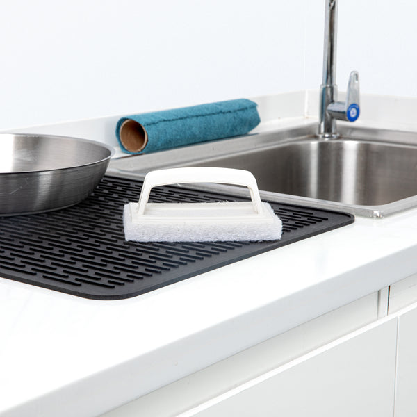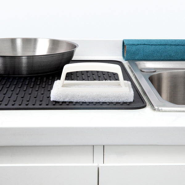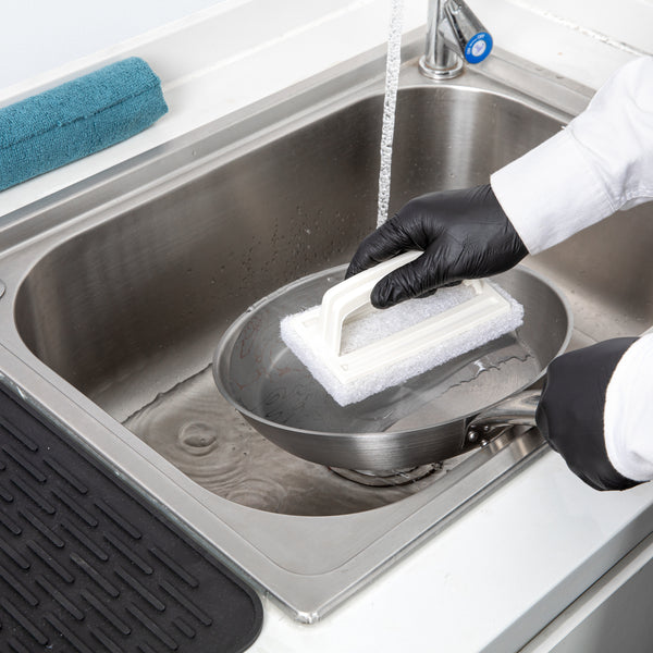Easily clean any surface with this Multi-Purpose Light Duty Scouring Pad with Handle from the RW Clean Collection. Designed with a conveniently attached handle, this multi-purpose white scouring pad makes it easy to reach difficult areas and tackle tough build-up. Plus, its plastic handle provides a secure grip and ensures your hands stay out of messes. This light-duty white scouring pad is made of tightly packed non-abrasive fibers that are designed to easily buff surfaces and remove grime. With this non-scratch scouring pad, you can easily scrub away dirt and grease from porcelain, ceramic, sinks, tile, and other delicate surfaces. Ideal for restaurants, bars, hotels, and other commercial establishments, this scouring pad is made from high-quality nylon fibers that are built to resist tearing and breaking. This scrub pad with handle is sold in a 1 count box.