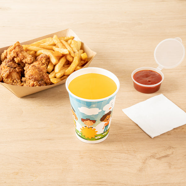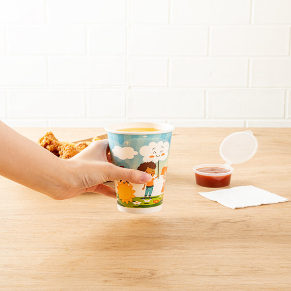 Keep drinks refreshing and enjoyable during hot weather or outdoor activities with our RW Kids 12-ounce Paper Drinking Cups. Made using high-quality paper, these eco-friendly cups are sturdy enough to not break when holding beverages. The inside of these cold drink cups is lined with PLA to prevent leakage or weakening of the cups. Withstanding temperatures up to 140F, these BPA-free paper mugs are perfect for serving a variety of beverages. The thick, rolled rim of these paper tea cups prevents them from deforming while providing a comfortable drinking experience. These disposable coffee cups are commercially compostable, making them sustainable. Easily save space while storing these commercially compostable paper cups, as the tapered shape ensures stackability. Designed with a colorful graphic of the four seasons, these beverage cups make drinking more enjoyable and educational for kids. Pair these leakproof cold cups with our compatible Sustain straw slot lids or sippy cup lids for secure transportation. Measuring 3.5 inches in diameter by 4.25 inches in height, these insulated to go cups have a capacity of 12 ounces. Shipped in 1,000 count box. Lids are available and sold separately.