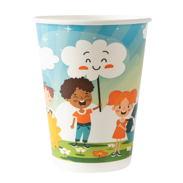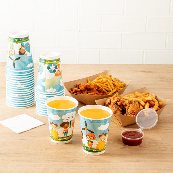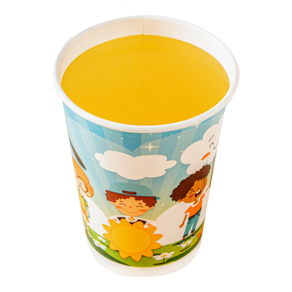 Keep drinks refreshing and enjoyable during hot weather or outdoor activities with our RW Kids 12-ounce Paper Drinking Cups. Made using high-quality paper, these eco-friendly cups are sturdy enough to not break when holding beverages. The inside of these cold drink cups is lined with PLA to prevent leakage or weakening of the cups. Withstanding temperatures up to 140F, these BPA-free paper mugs are perfect for serving a variety of beverages. The thick, rolled rim of these paper tea cups prevents them from deforming while providing a comfortable drinking experience. These disposable coffee cups are commercially compostable, making them sustainable. Easily save space while storing these commercially compostable paper cups, as the tapered shape ensures stackability. Designed with a colorful graphic of the four seasons, these beverage cups make drinking more enjoyable and educational for kids. Pair these leakproof cold cups with our compatible Sustain straw slot lids or sippy cup lids for secure transportation. Measuring 3.5 inches in diameter by 4.25 inches in height, these insulated to go cups have a capacity of 12 ounces. Shipped in 50 count box. Lids are available and sold separately.